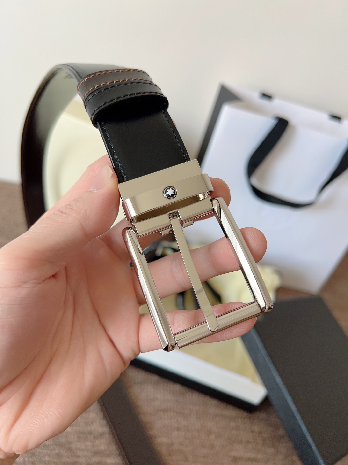 The Montblanc brand represents elegant and enduring lifestyle essentials, reflecting today's society's pursuit and celebration of culture, design, tradition, and exquisite craftsmanship. The elegant hexagonal white star emblem has become a symbol of exceptional quality and perfect artistry. Imported materials paired with premium hardware buckles, a must-have item.