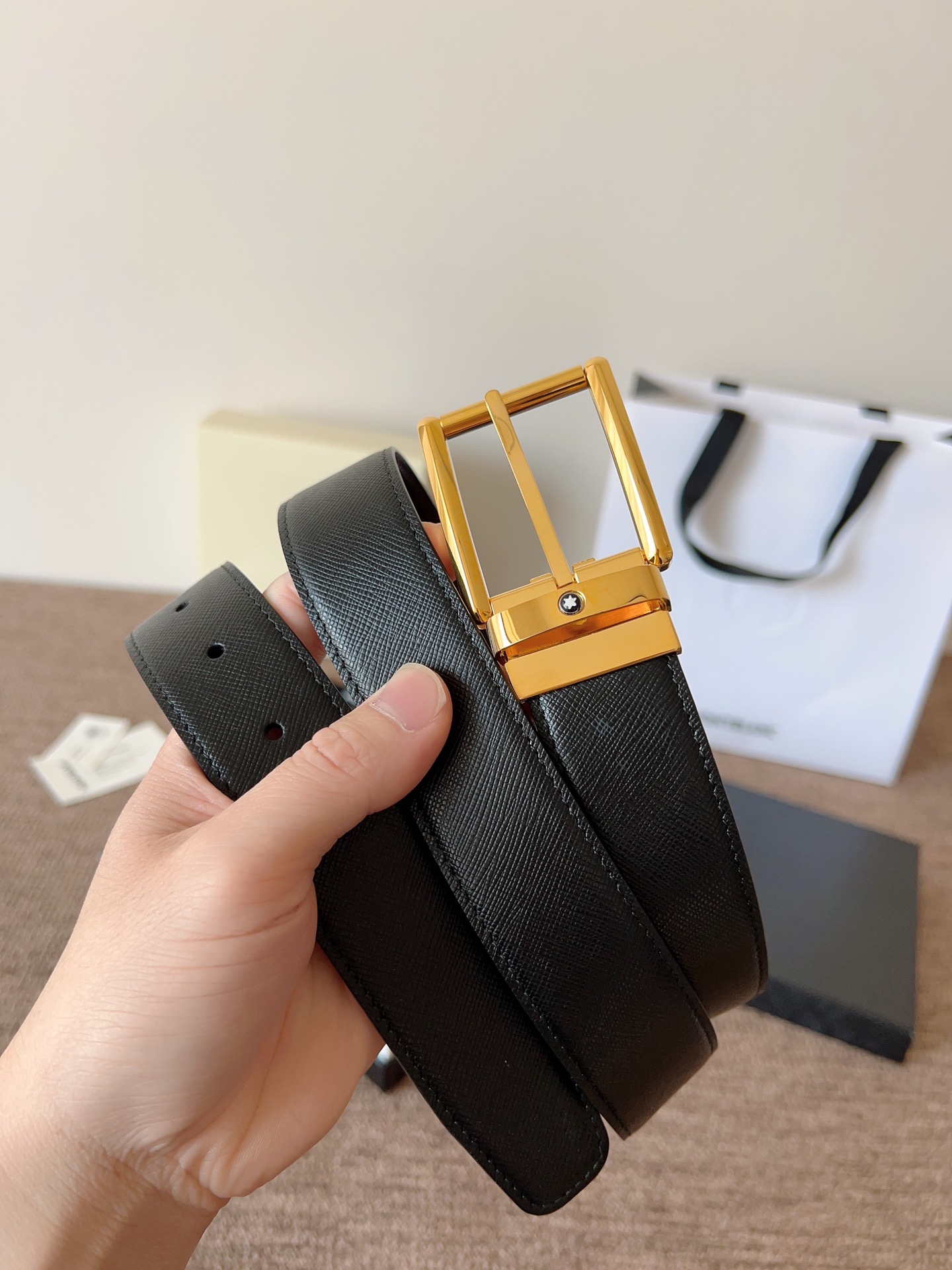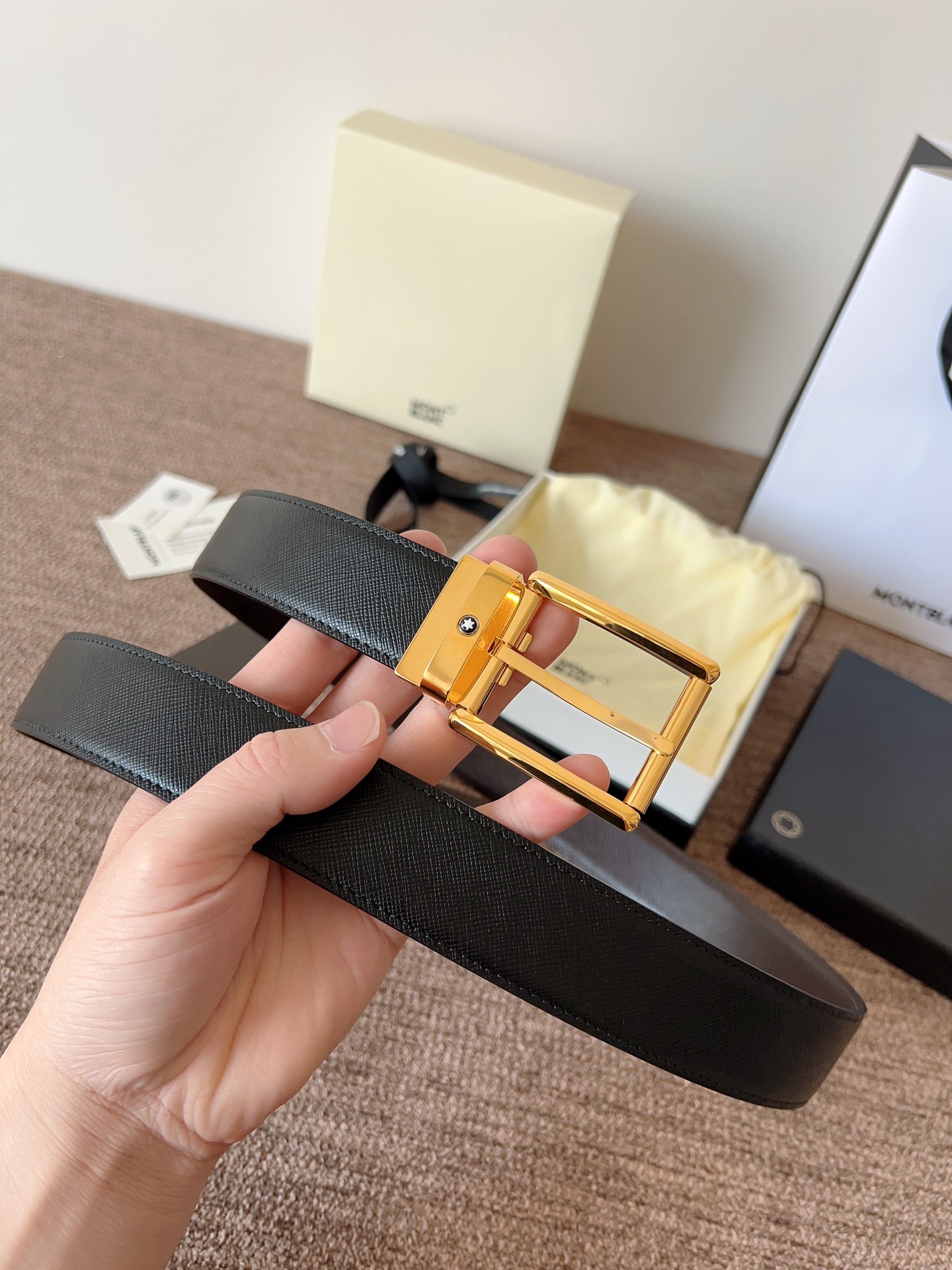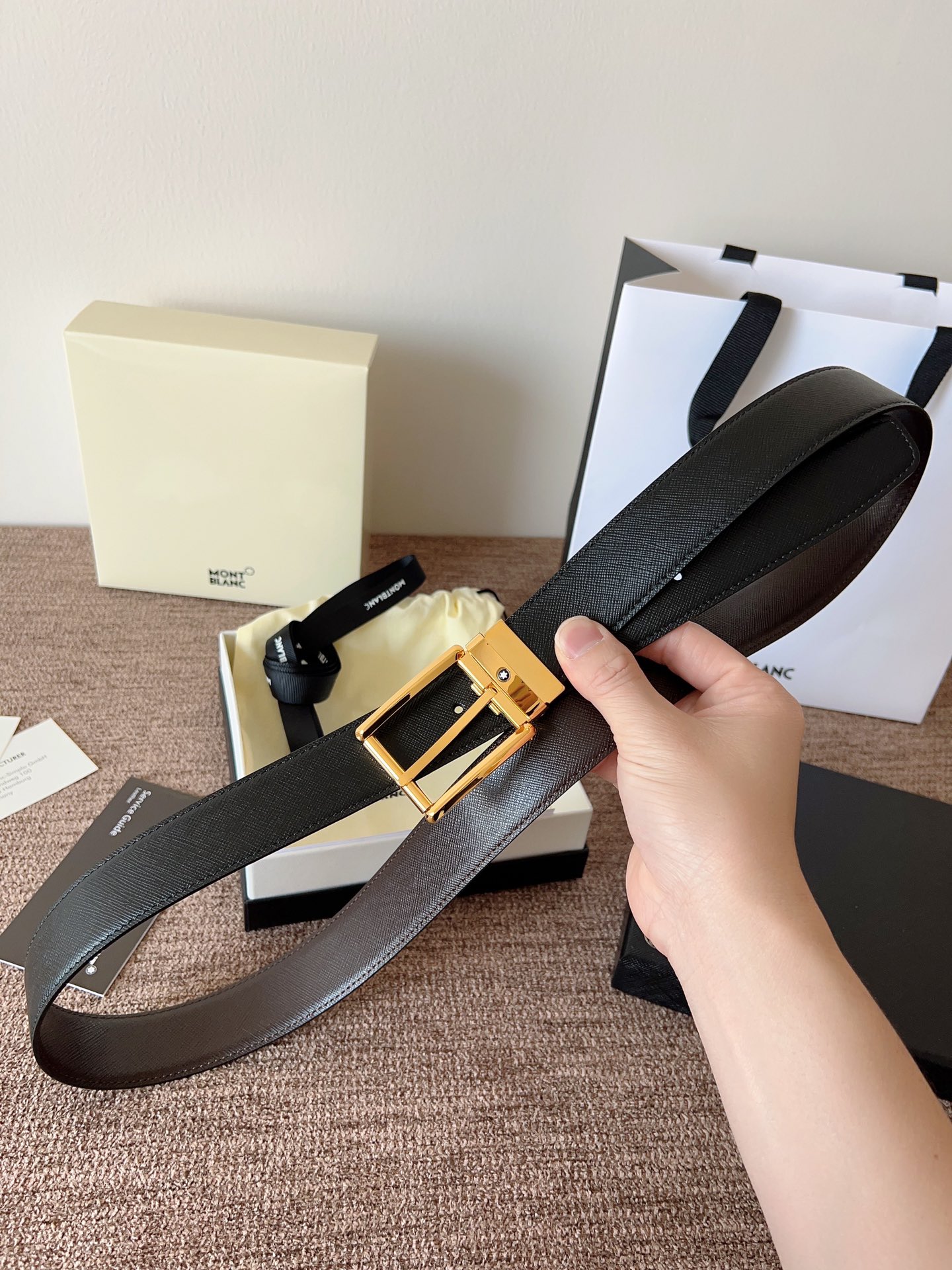 The Montblanc brand represents elegant and enduring lifestyle essentials, reflecting today's society's pursuit and praise for culture, design, tradition, and excellent craftsmanship. The elegant hexagonal white star emblem has become a symbol of exceptional quality and perfect artistry. Imported materials paired with high-quality metal buckles, a must-have item.