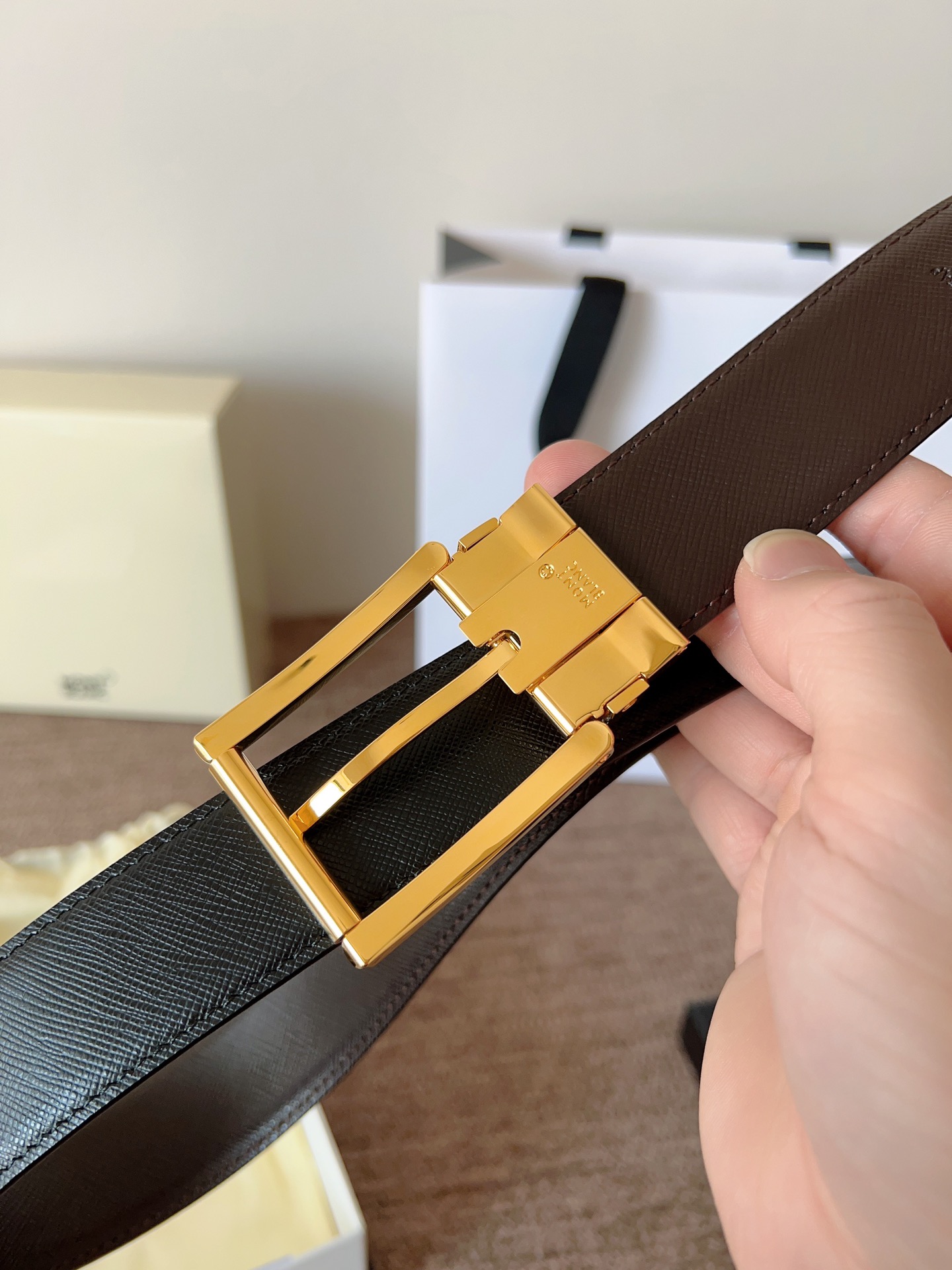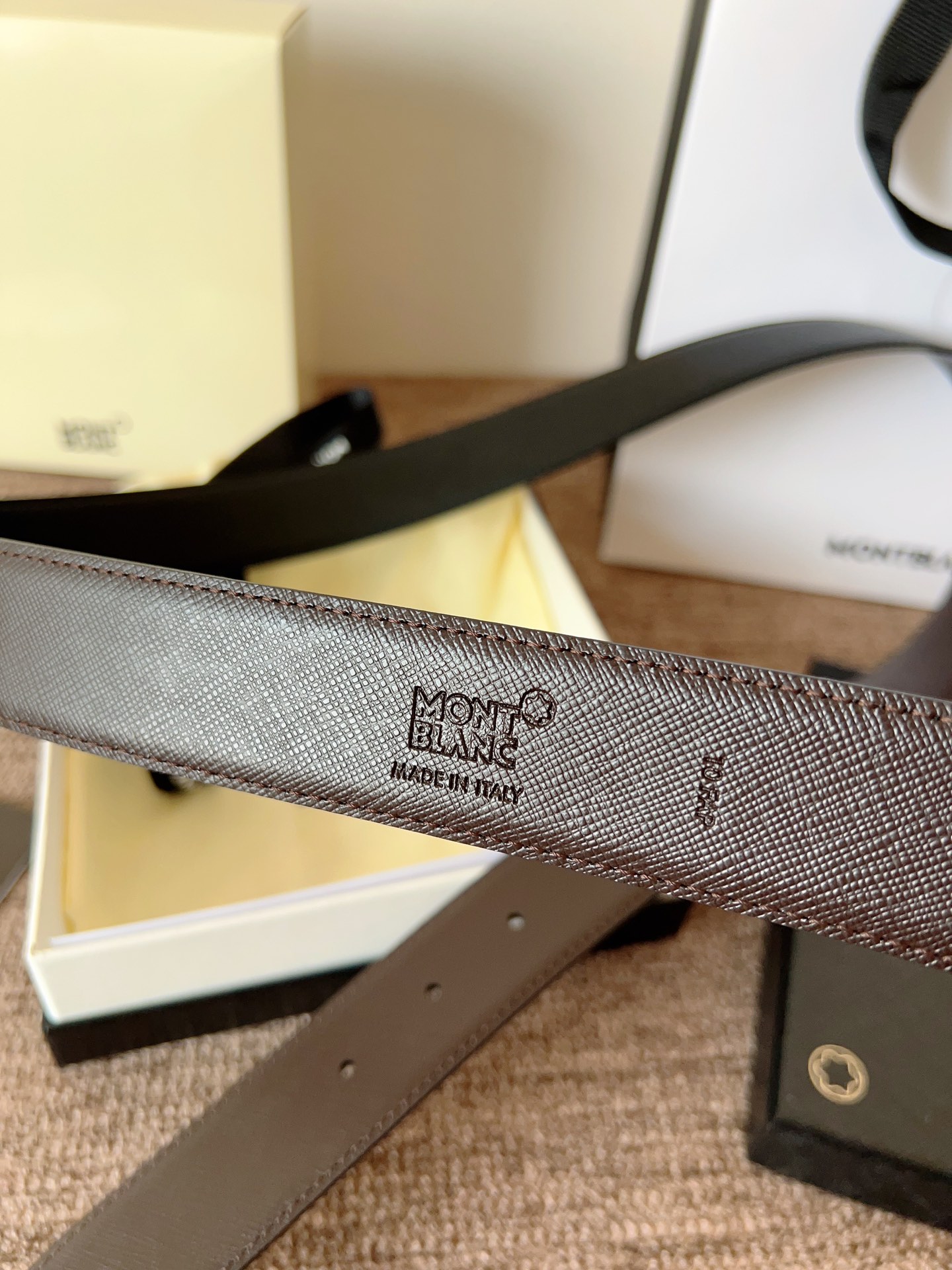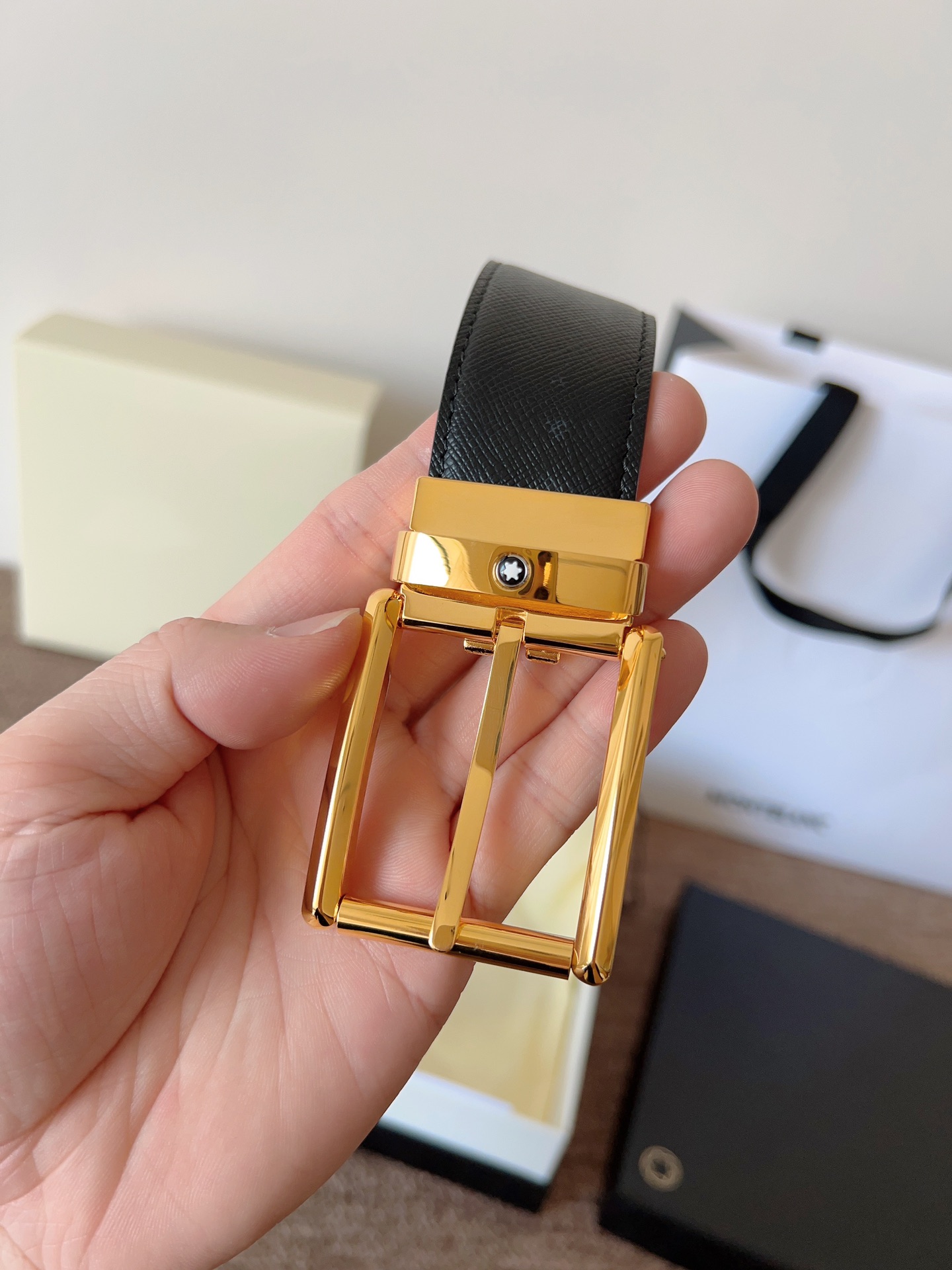 The Montblanc brand represents elegant and enduring lifestyle essentials, reflecting today's society's pursuit and praise for culture, design, tradition, and excellent craftsmanship. The elegant hexagonal white star emblem has become a symbol of exceptional quality and perfect artistry. Imported materials paired with high-quality metal buckles, a must-have item.