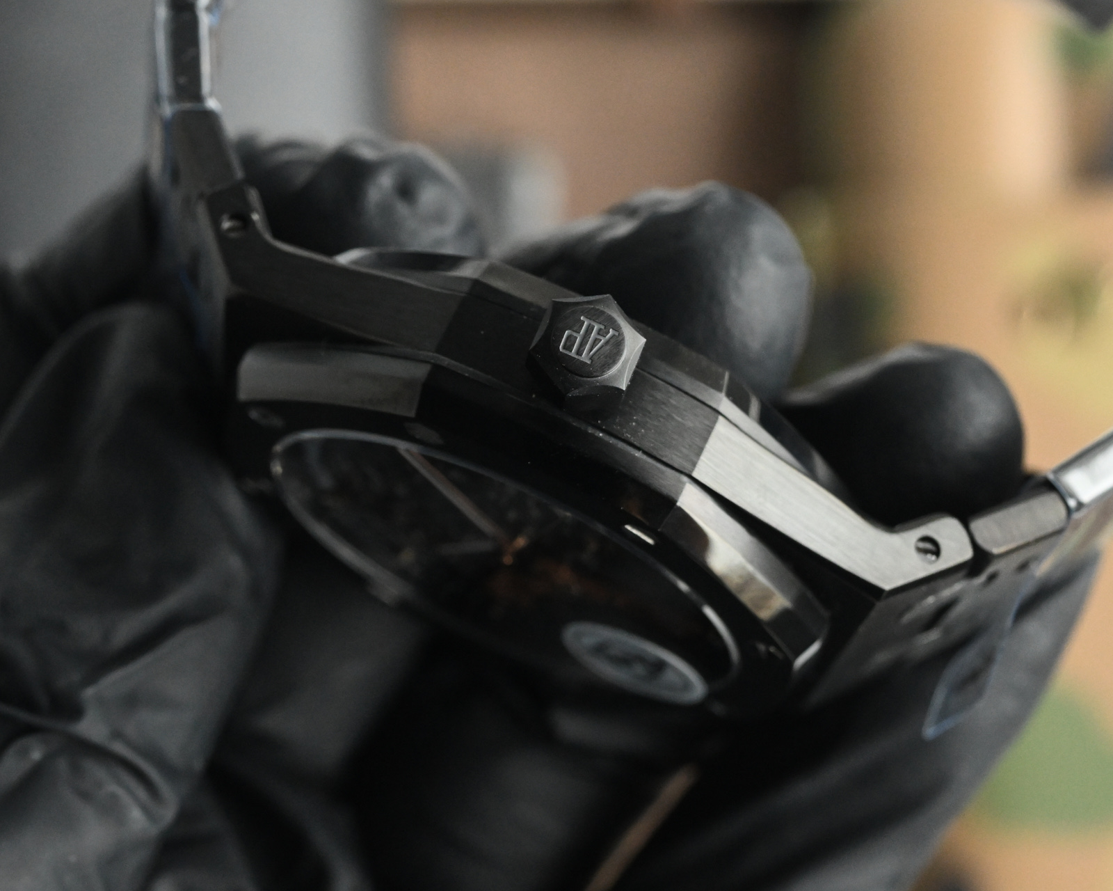New APS Audemars Piguet Royal Oak Offshore 15407ST watch with 41mm gray skeleton dial, rose gold indexes, and sapphire crystal.