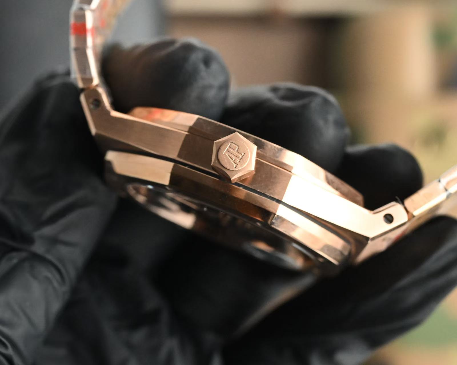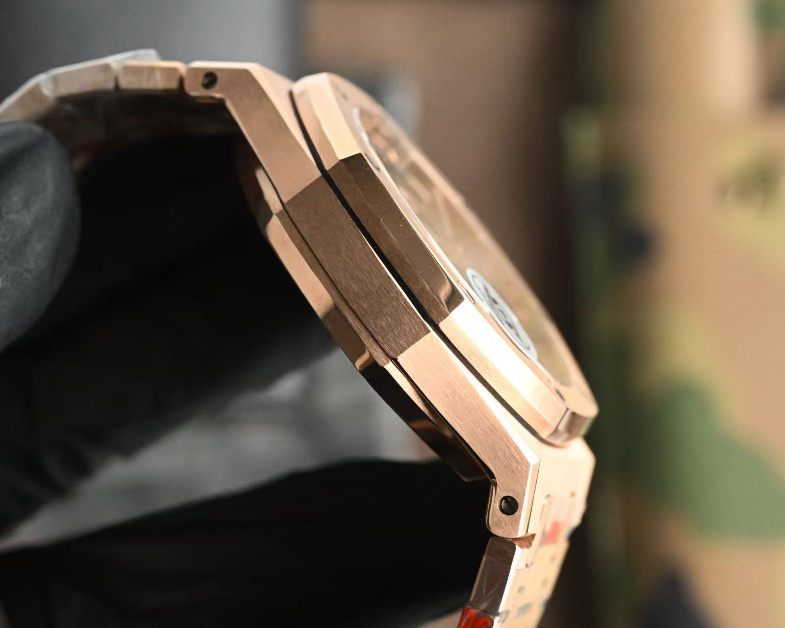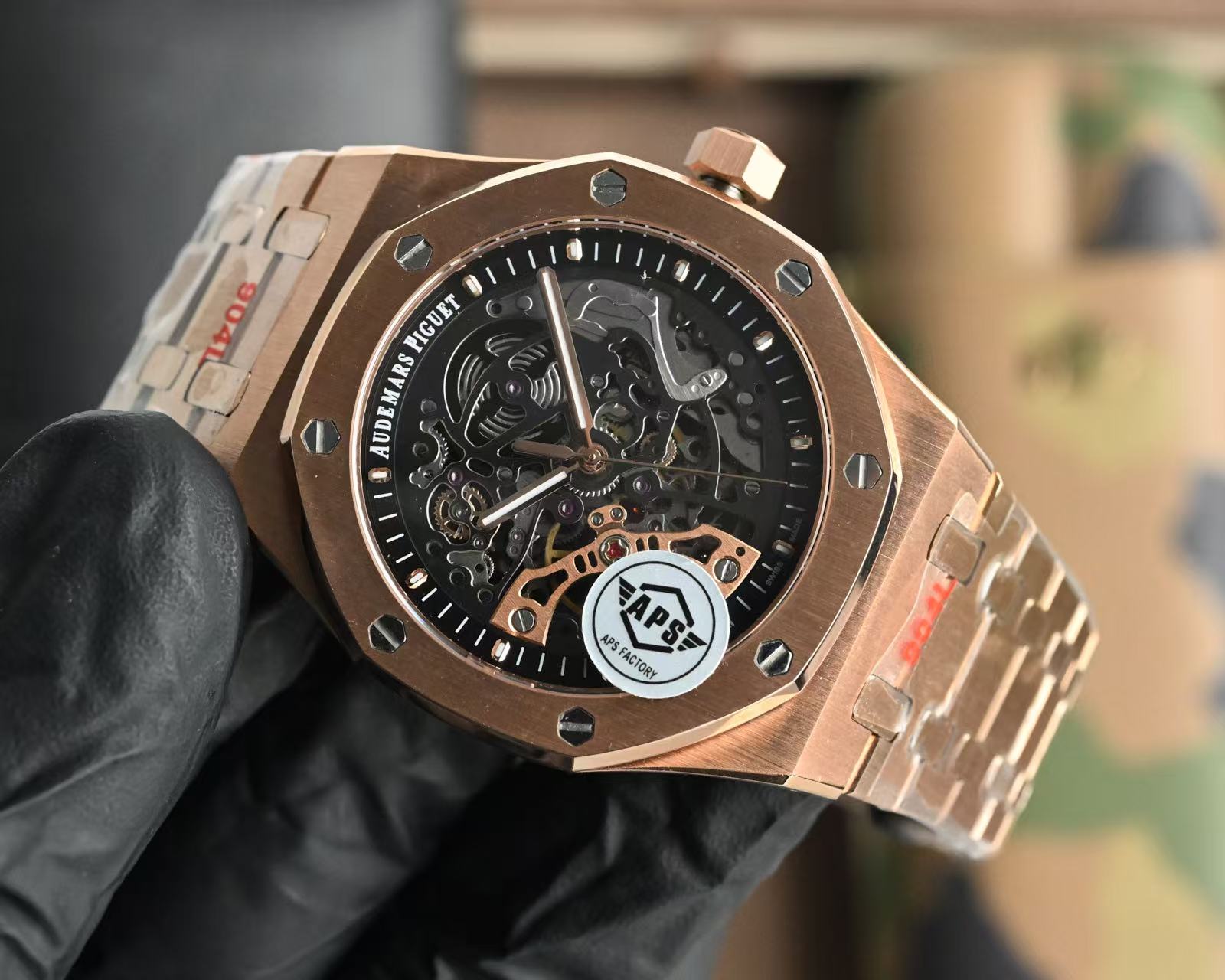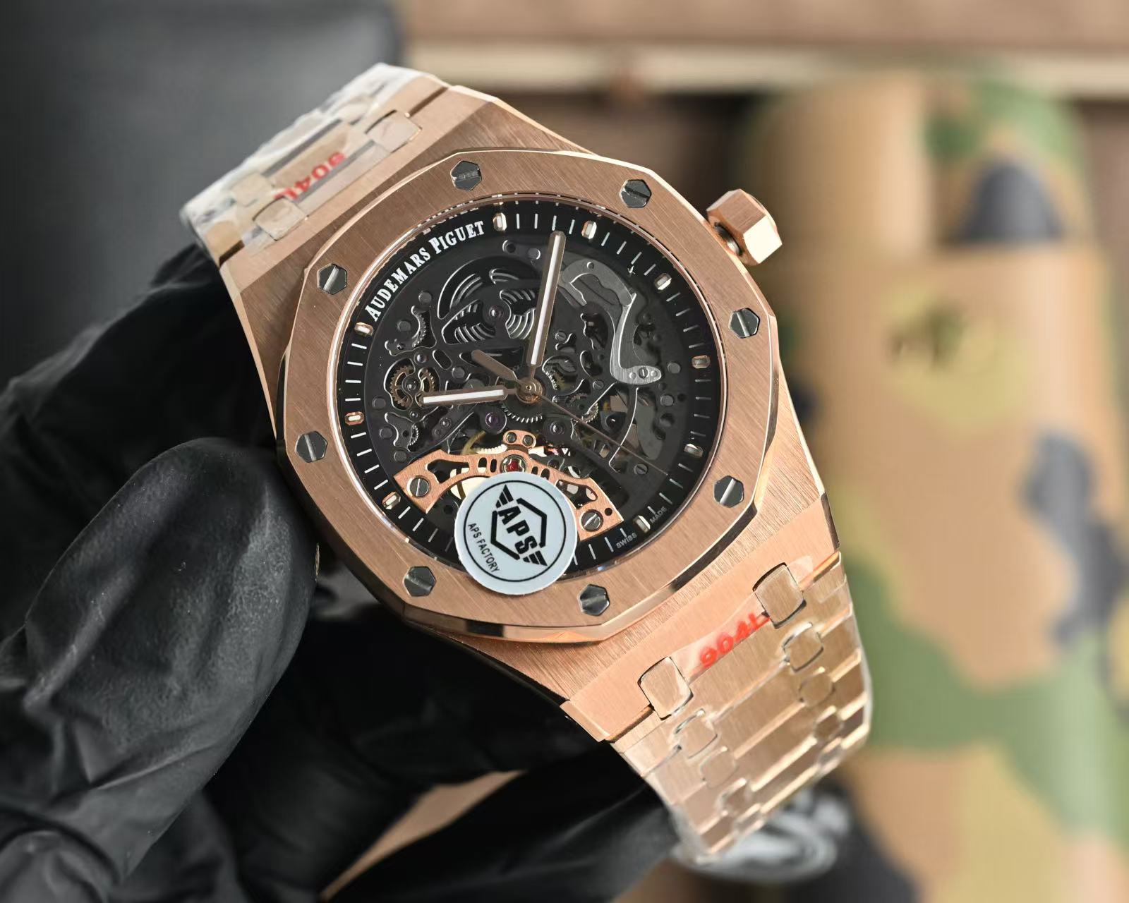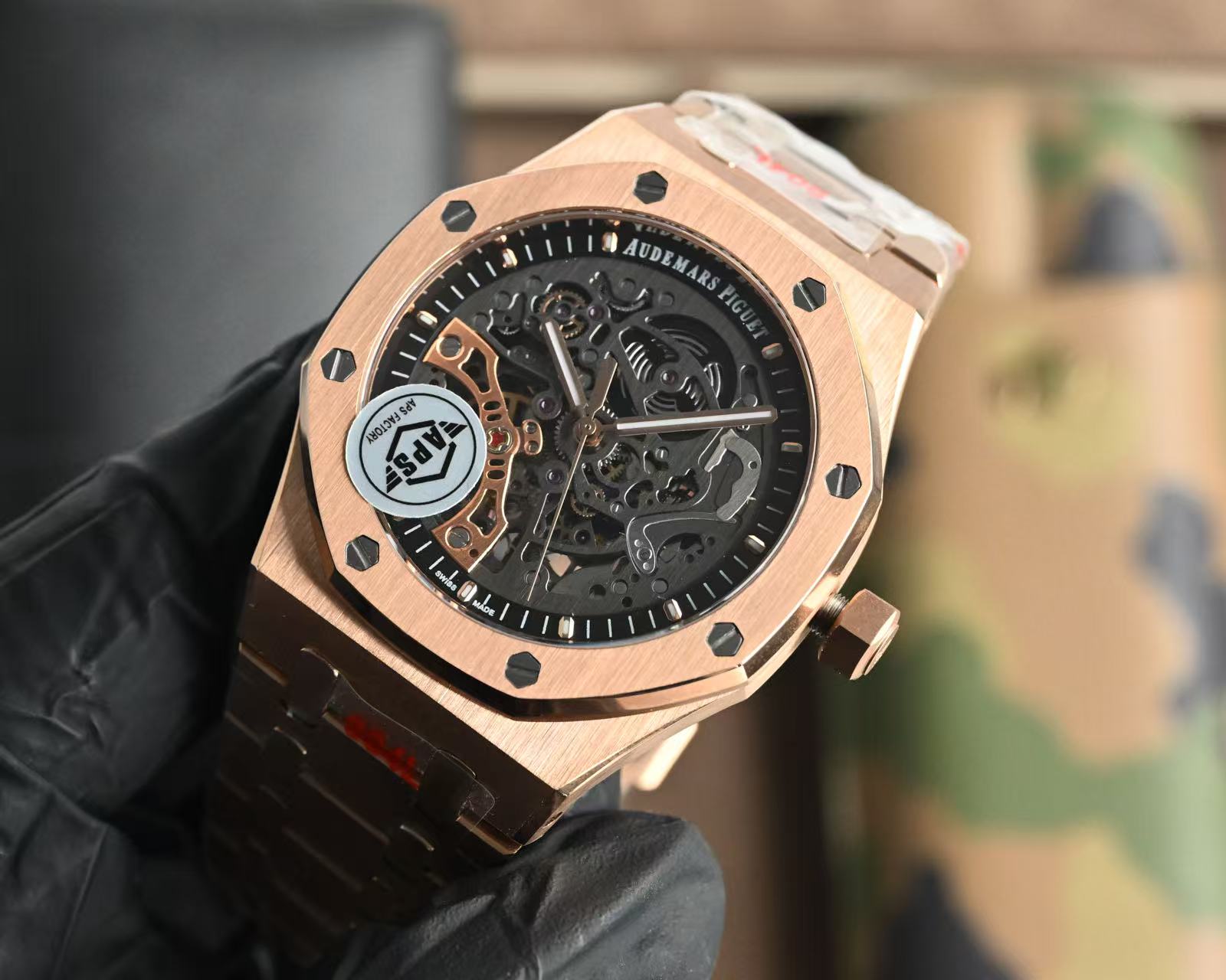 APS new Audemars Piguet Royal Oak Offshore model 15407ST.OO.1220ST.01 men's mechanical watch Calibre 3132 integrated movement, 41mm diameter, dark gray dial shape: round dial material: skeletonized dial, with rose gold fluorescent three-dimensional hour markers and Royal Oak hands crystal material: anti-glare treated sapphire crystal glass crystal crown material: stainless steel, screw-down crown case back: transparent case back, anti-glare sapphire glass mirror