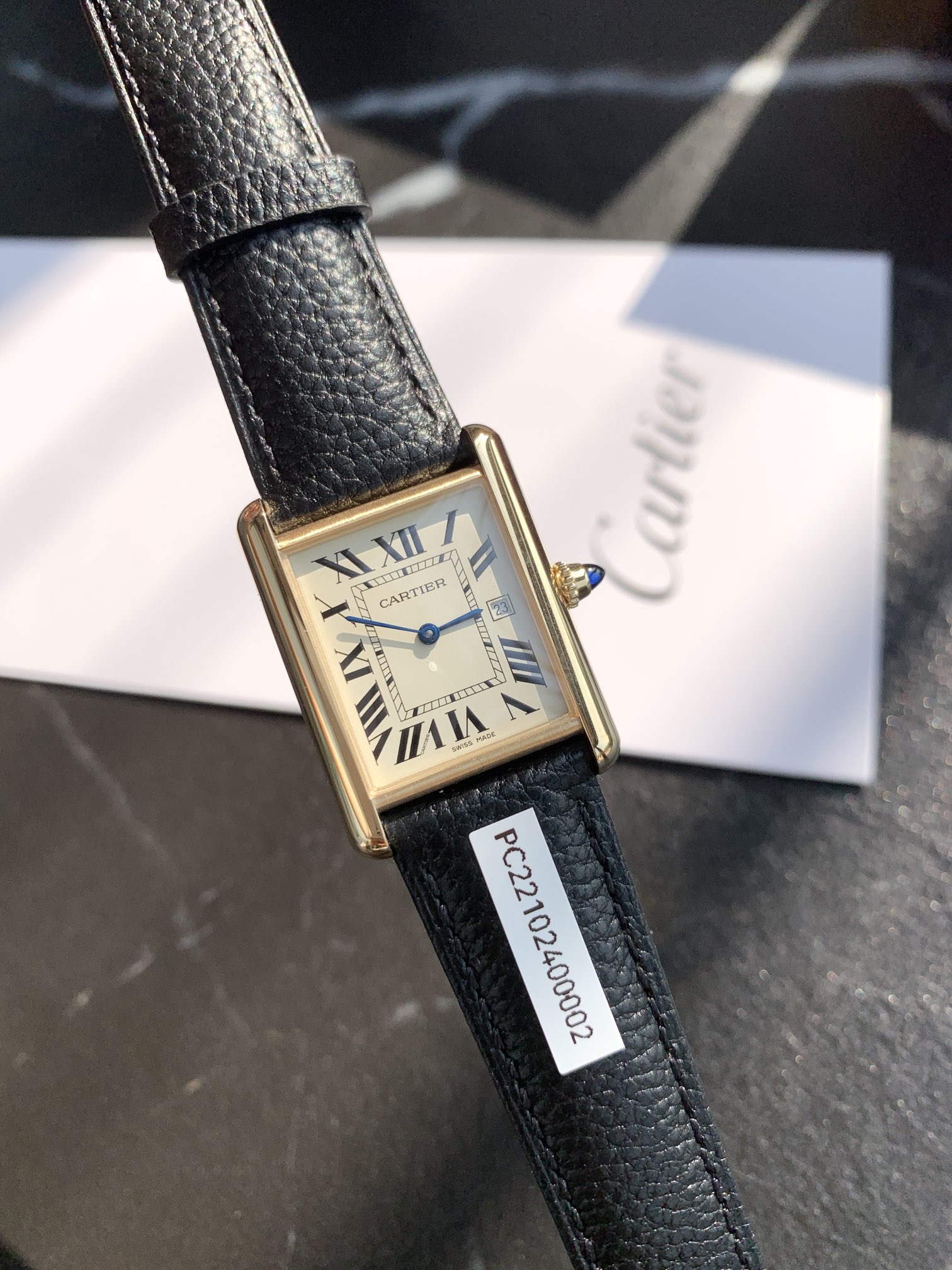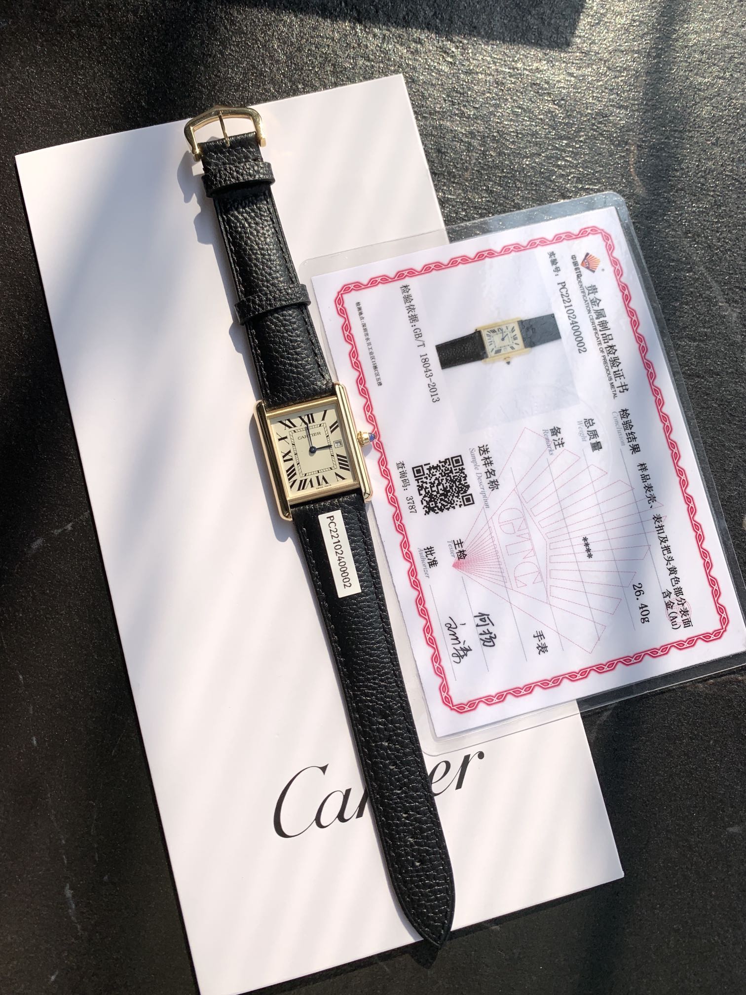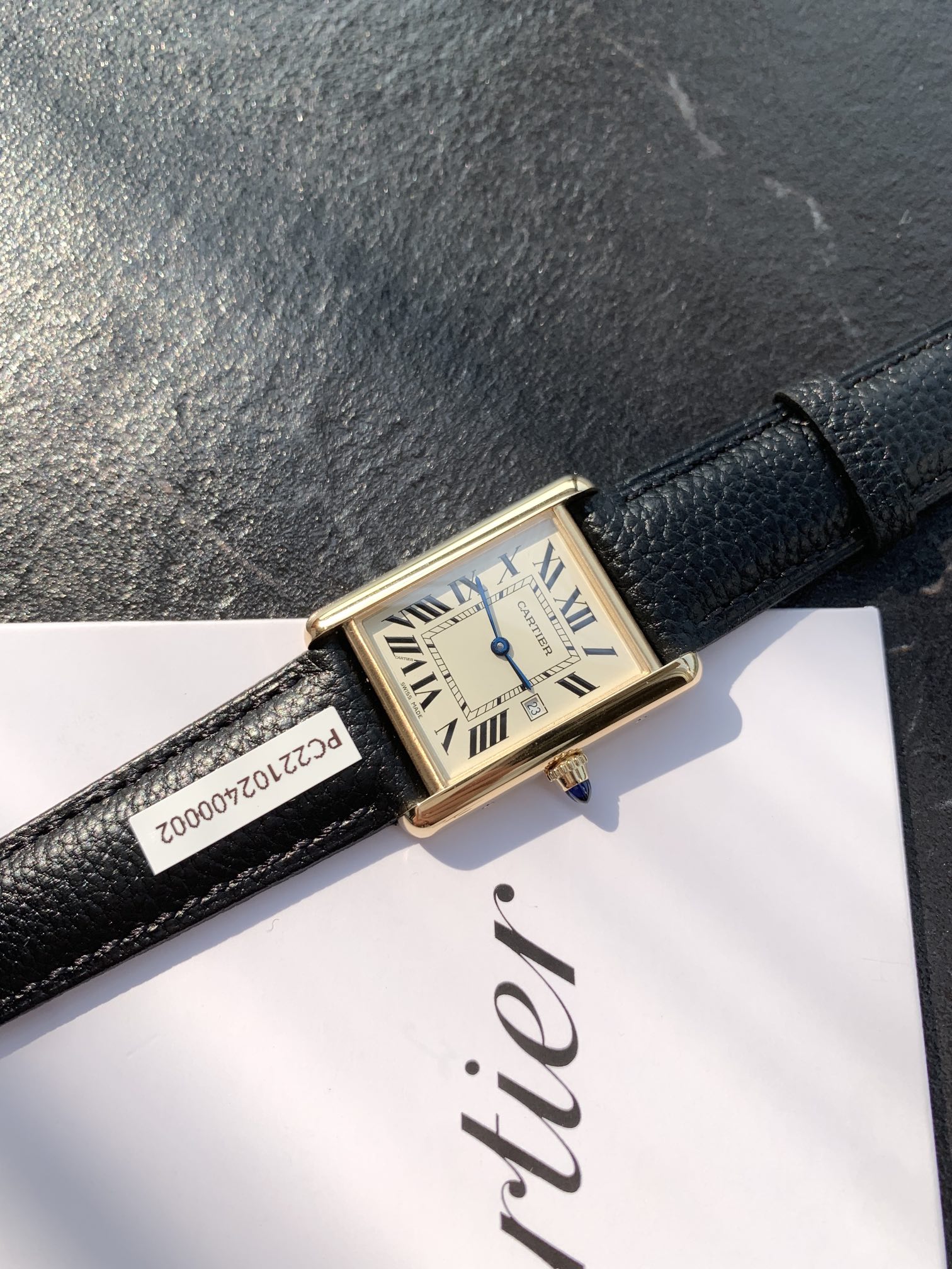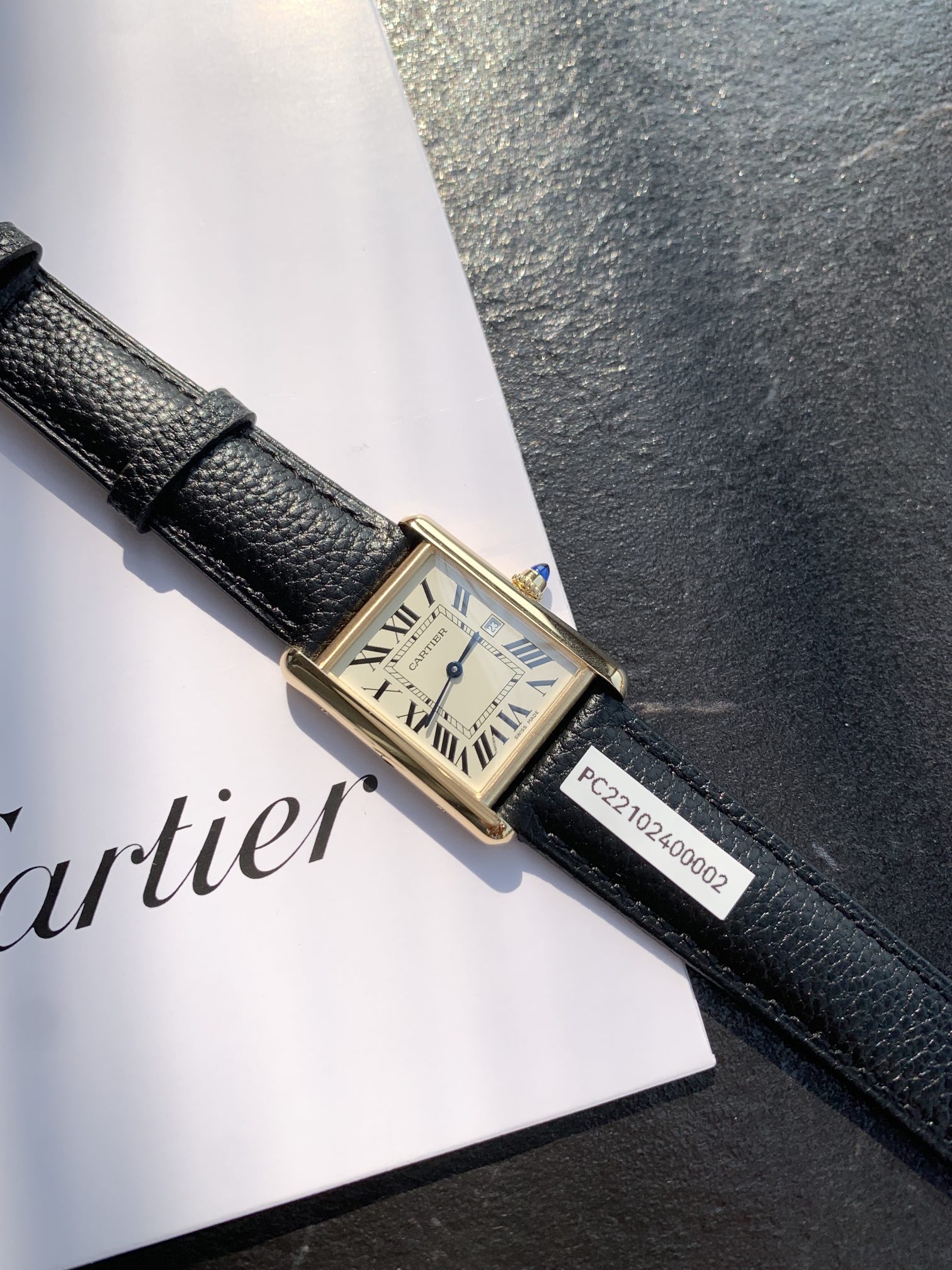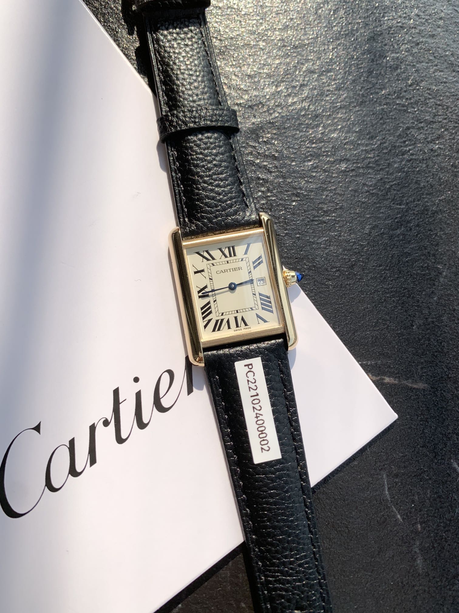 New Cartier Tank watch replica. 18k gold plated, Swiss quartz, 33.7mm size. Alligator strap, waterproof. With certificate and packaging.