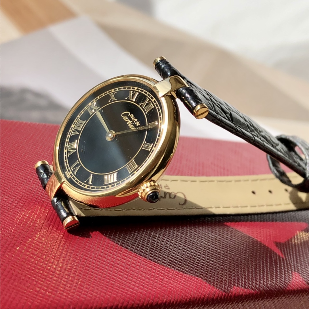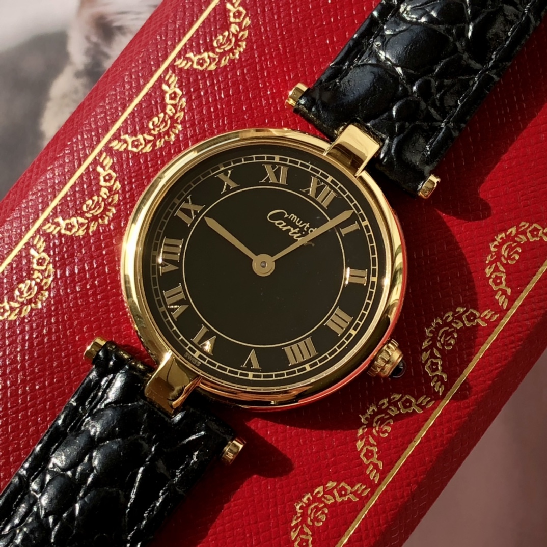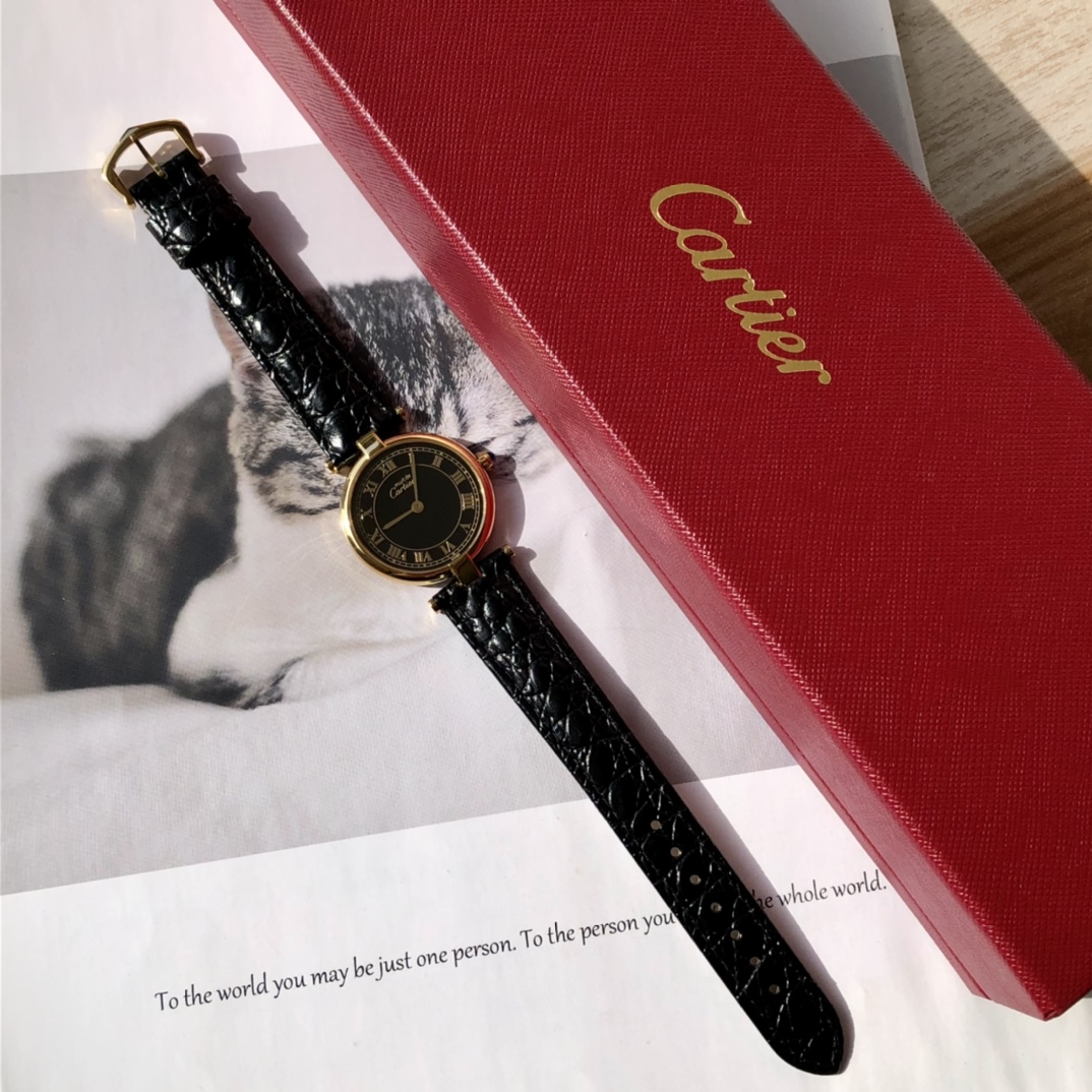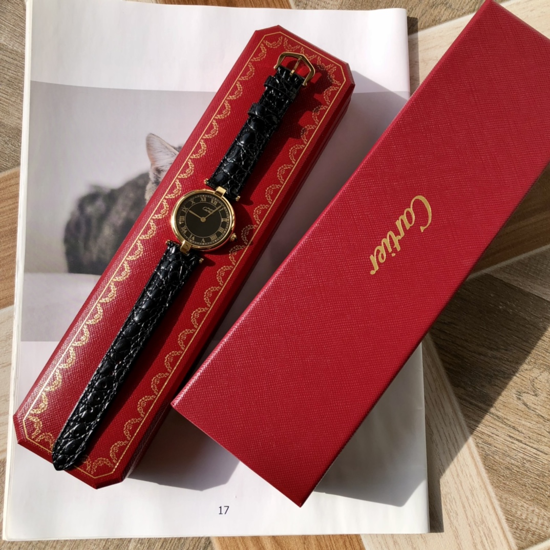 New batch has arrived! Cartier vintage, pre-owned quartz women's watch, case diameter ~30mm, exuding a very elegant and refined style. This watch carries a strong classical and grand aesthetic, with a design that is both bold and timeless, never going out of style even after a hundred years. The dial is connected to the strap at both ends with simple T-shaped metal links, using Italian calfskin straps with embossed crocodile pattern and double-sided leather for good breathability. Since this watch was produced in the 1980s, some parts have been replaced due to loss. Pre-owned beautiful watches not only carry a full vintage charm but are also not outdated at all! Comes with full packaging!
