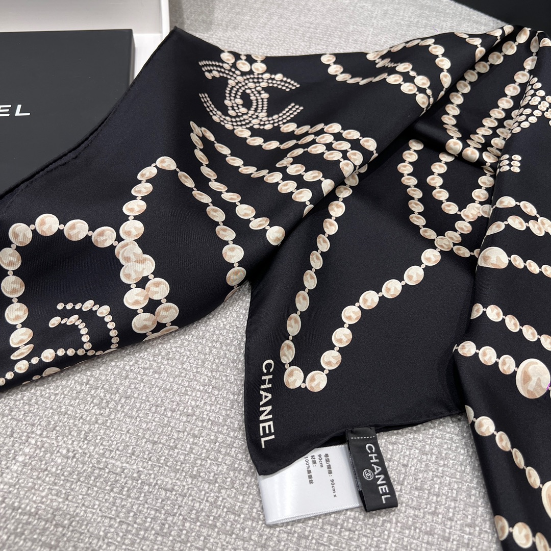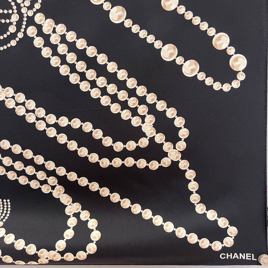New Chanel pearl necklace in black, 90x90cm, 100% silk. Elegant design with classic pearl elements, complete with original packaging.