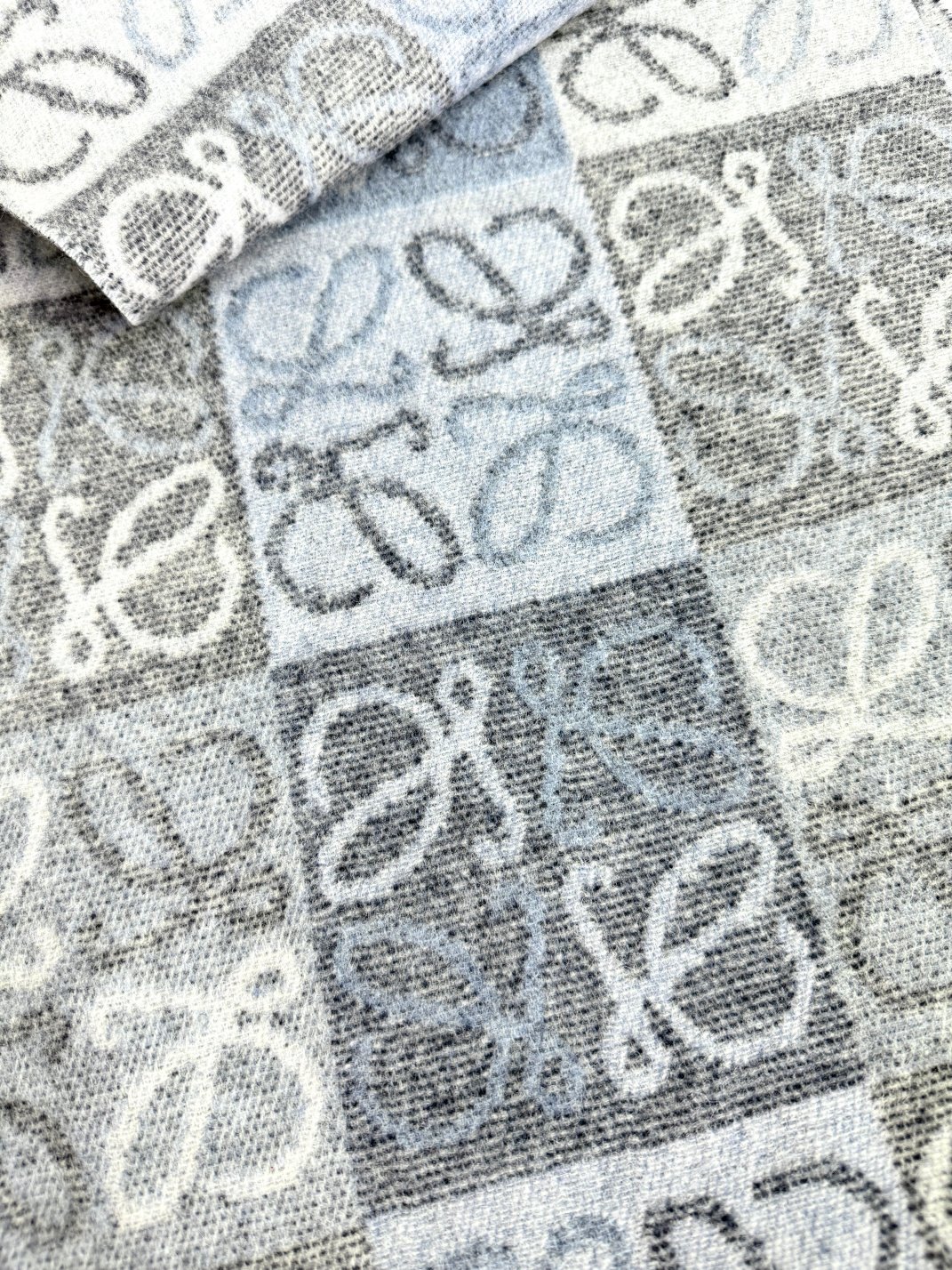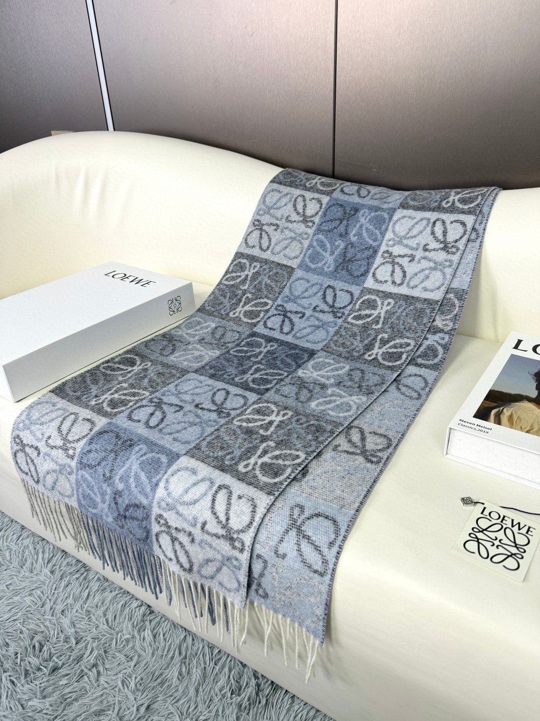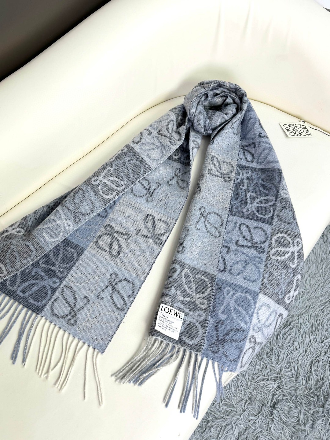 New two-tone checkerboard scarf. Material: wool and cashmere. Size: 40x180. Colors: glacier blue, beige. Upgraded weaving, rich colors, soft texture. Features Anagram pattern and retro color block design.