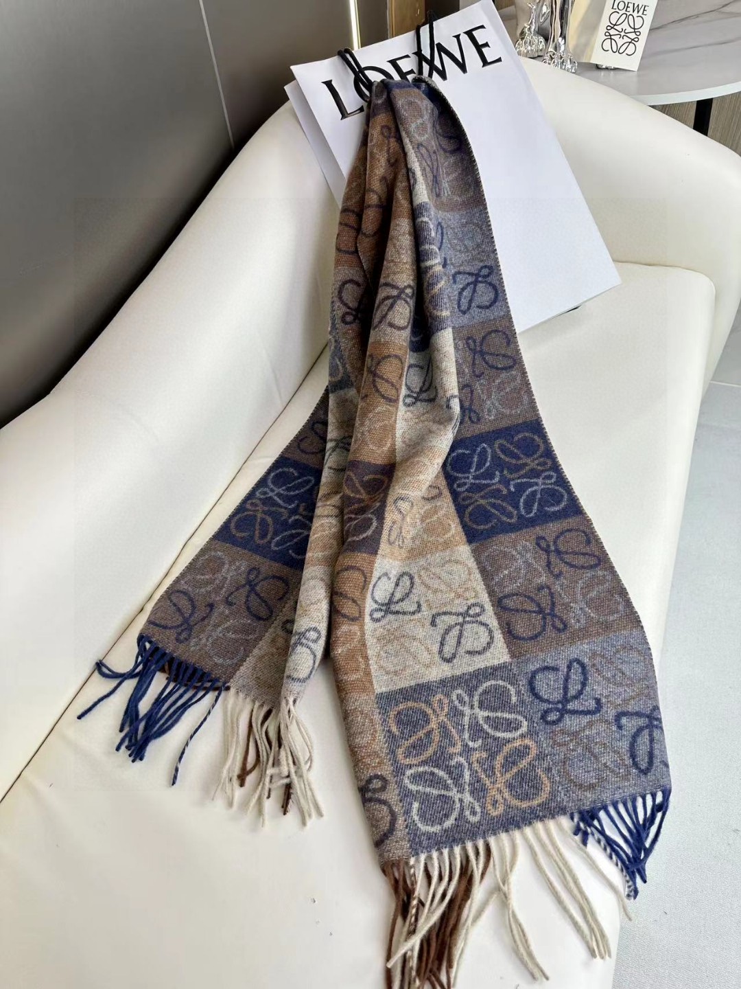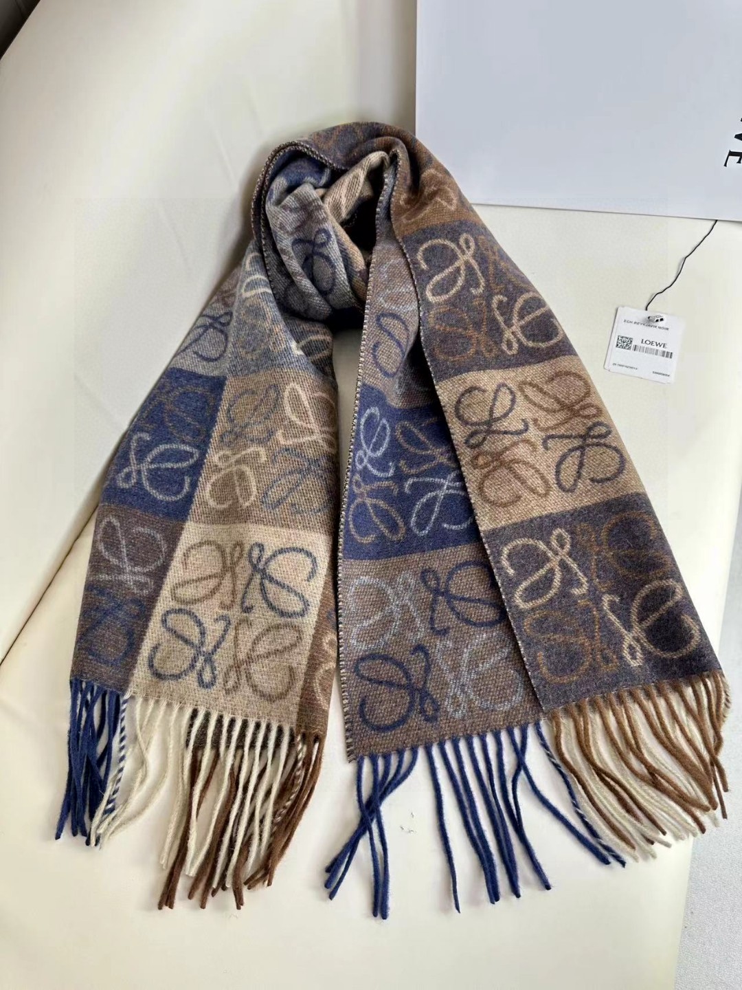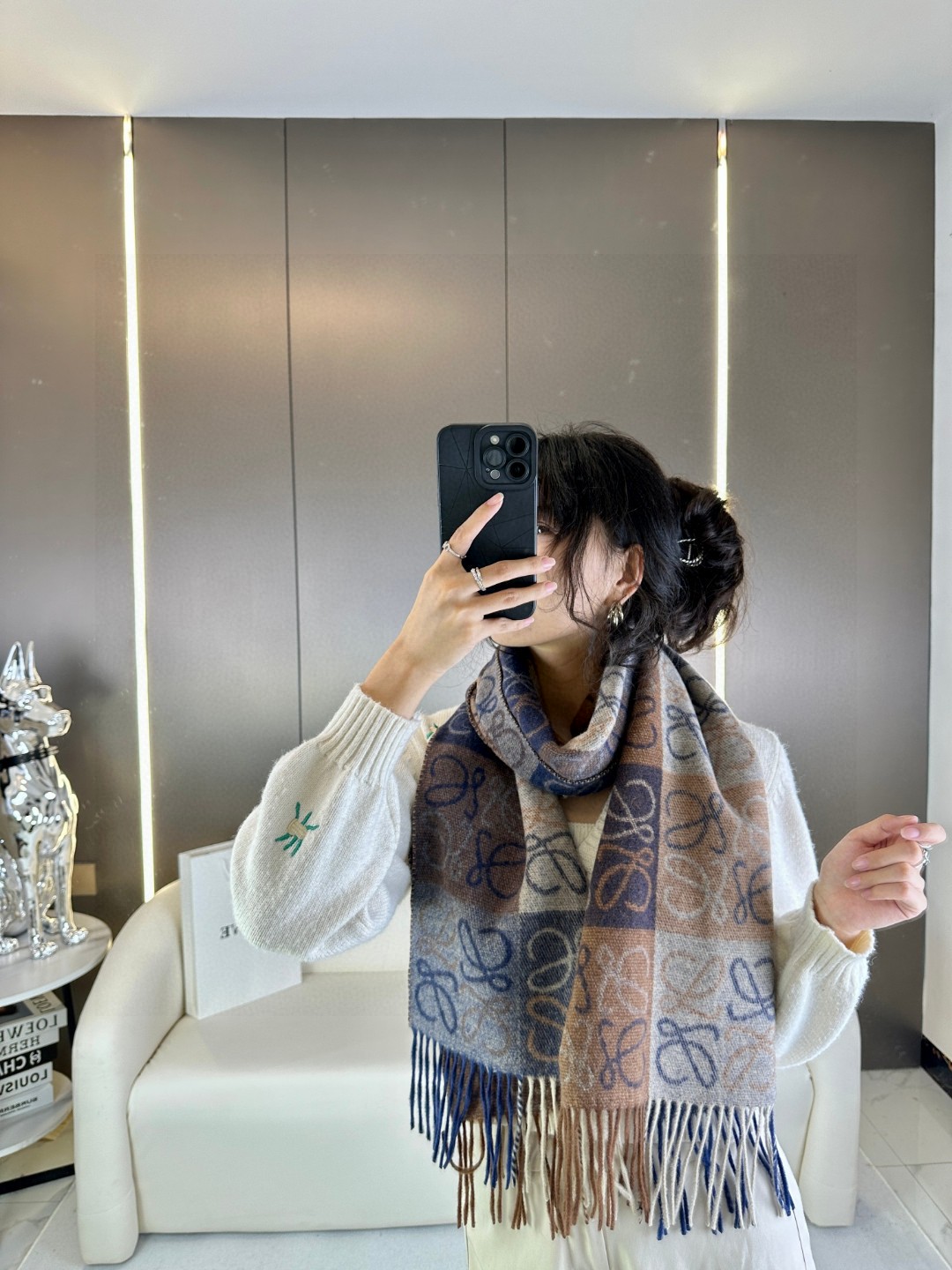 New two-tone checkerboard scarf, wool and cashmere blend, size 40x180. Green color, upgraded weaving for richer color and soft texture. Features anagram pattern, retro style with four-color拼接.