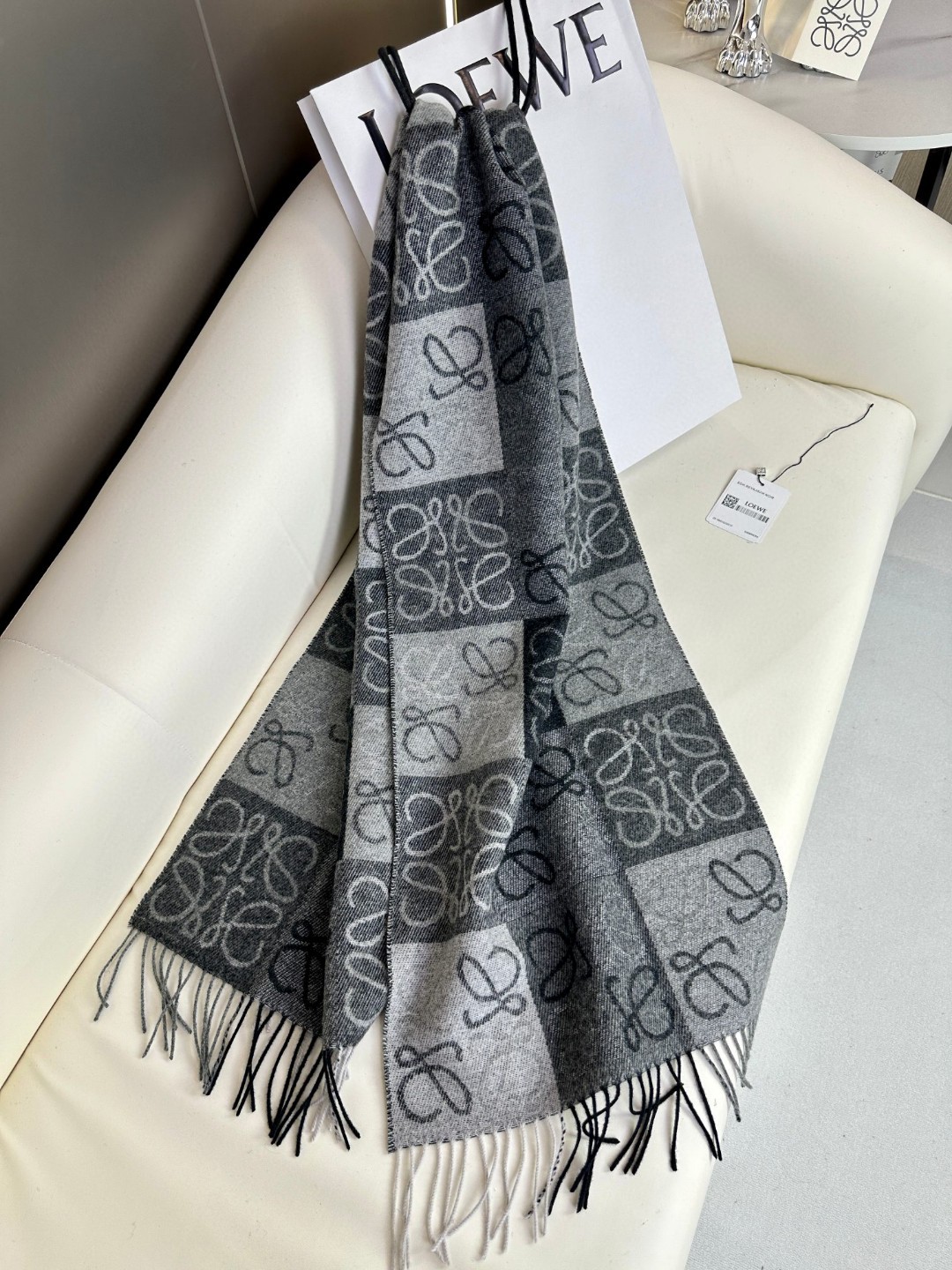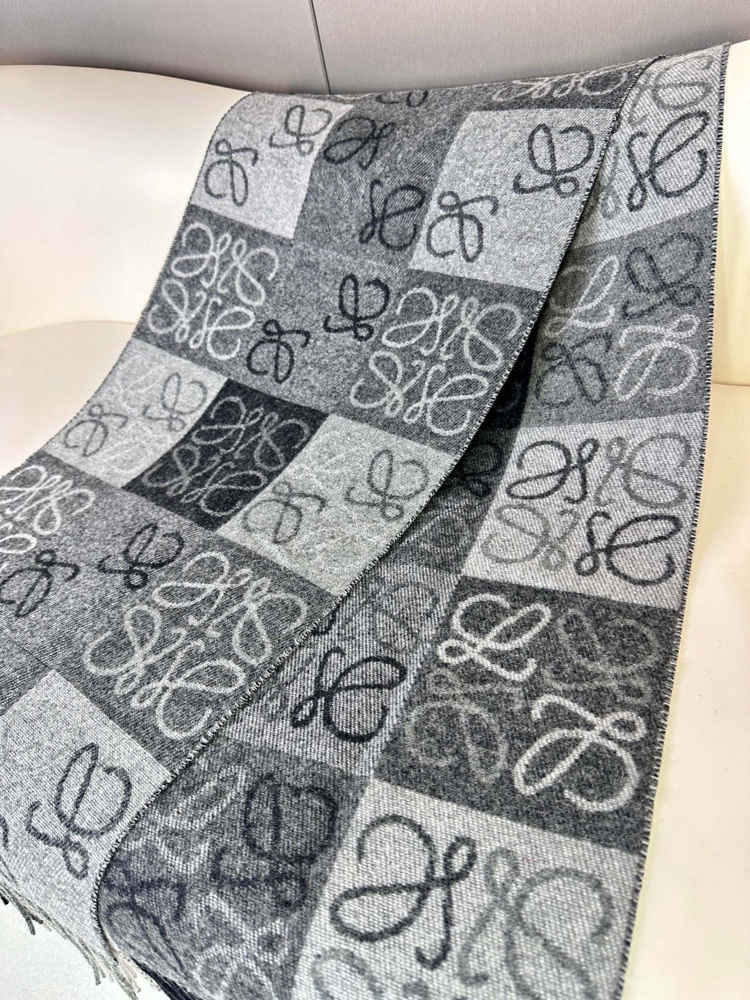 New two-tone checkerboard scarf, wool and cashmere blend, size 40x180cm, gray color. Upgraded yarn for richer color and softer feel. Features Anagram pattern, retro style, four-color拼接. Excellent skin touch, luxurious and elegant.