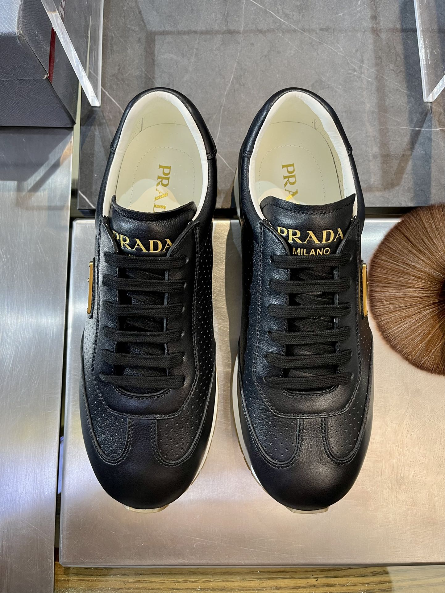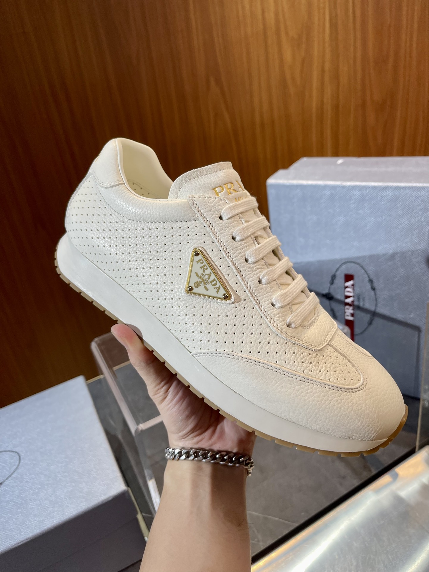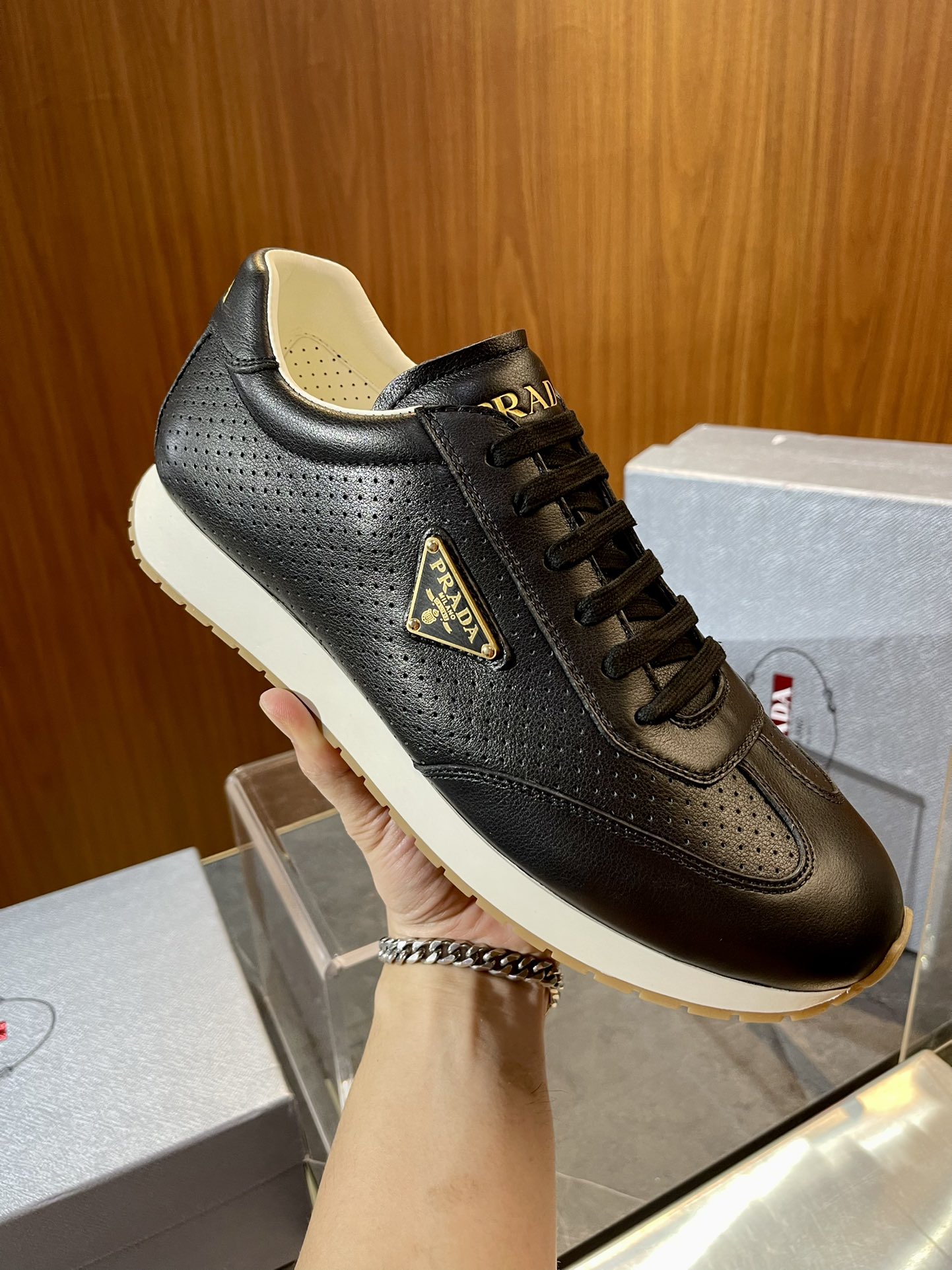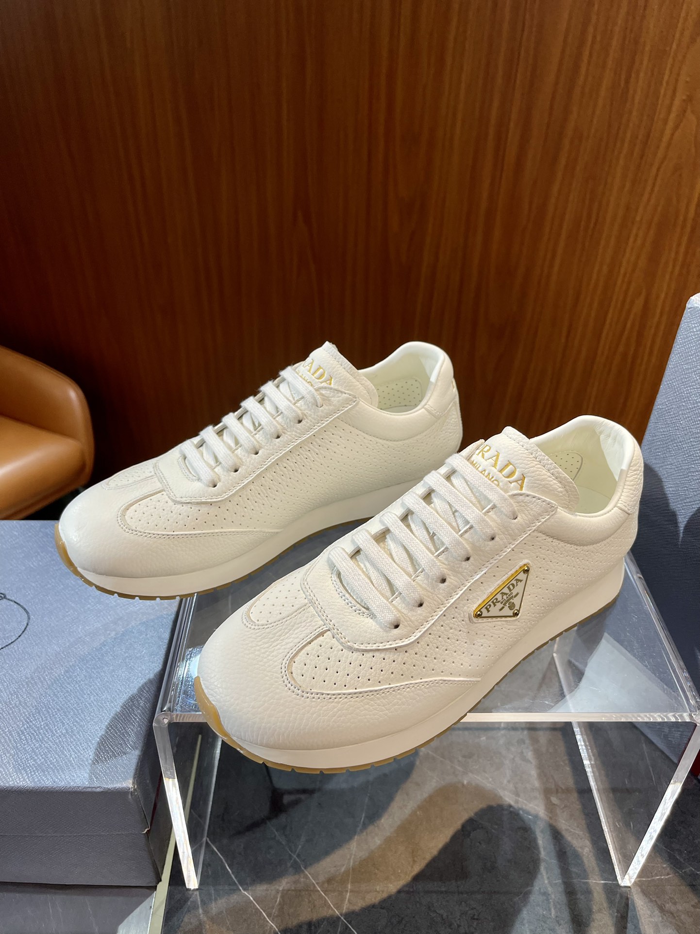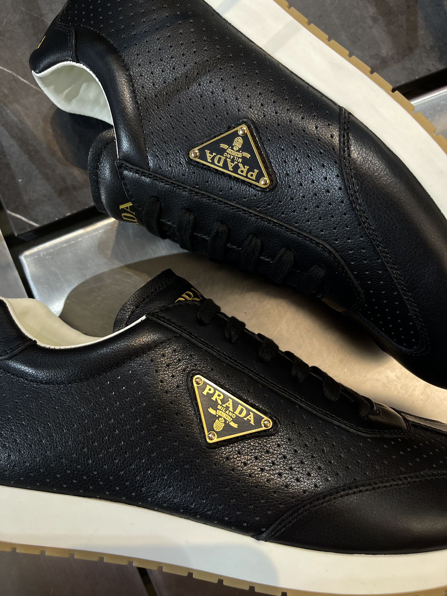 PRADA men's leather sneakers in sizes 39-44. Features soft lines, lightweight durable sole, enamel triangle metal logo, and screen-printed tongue logo.