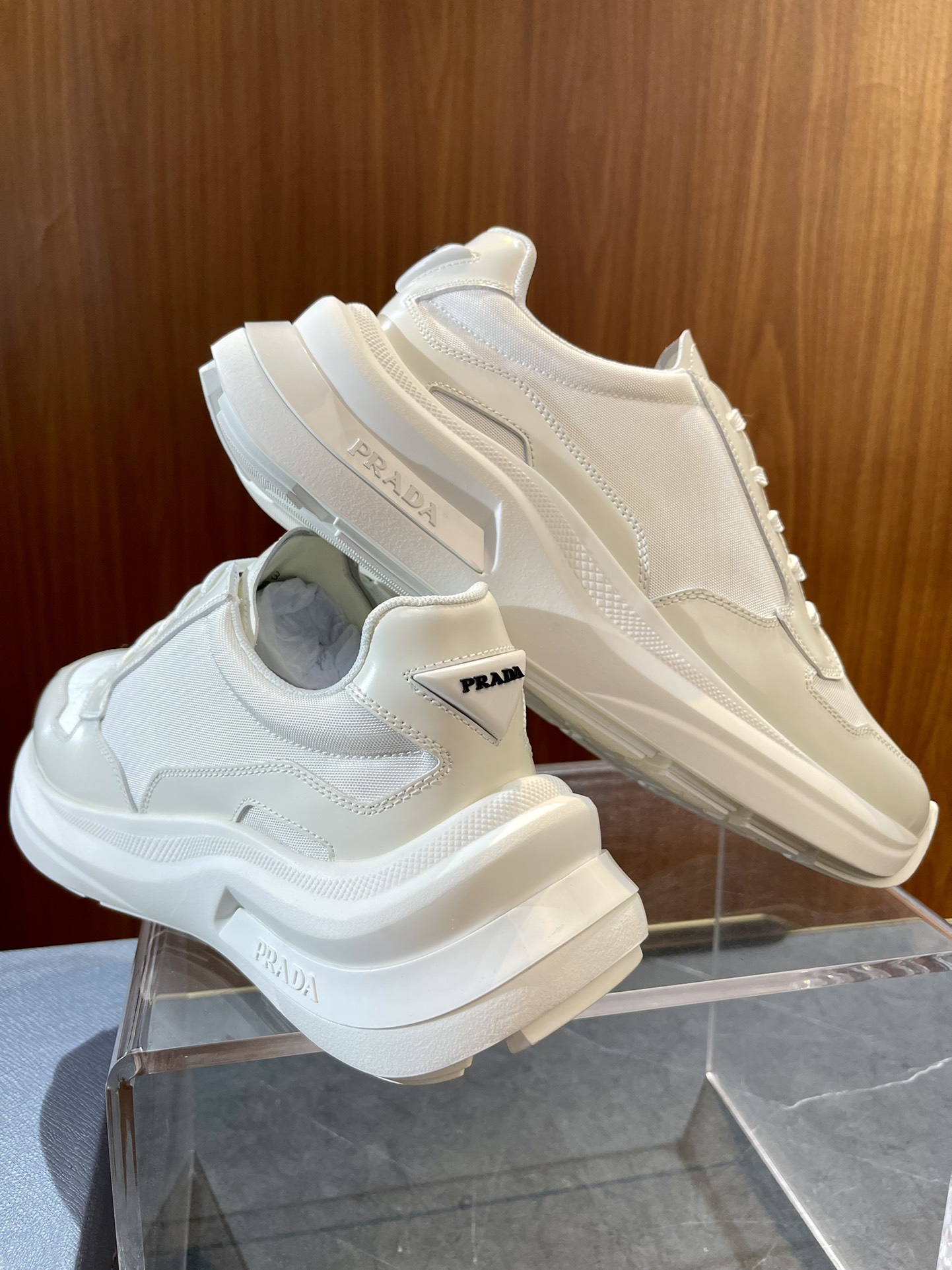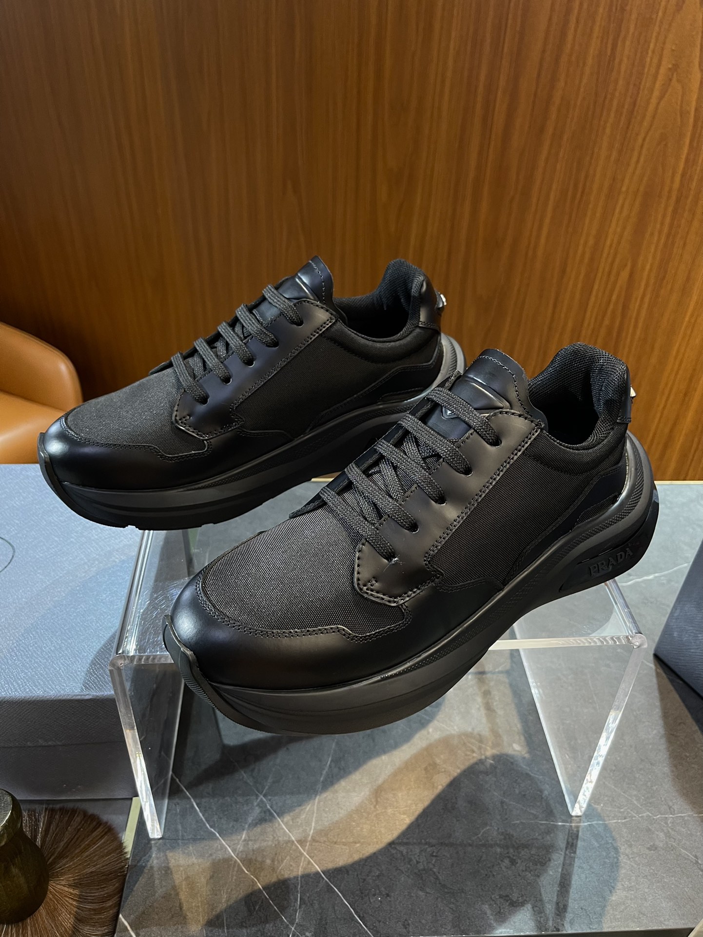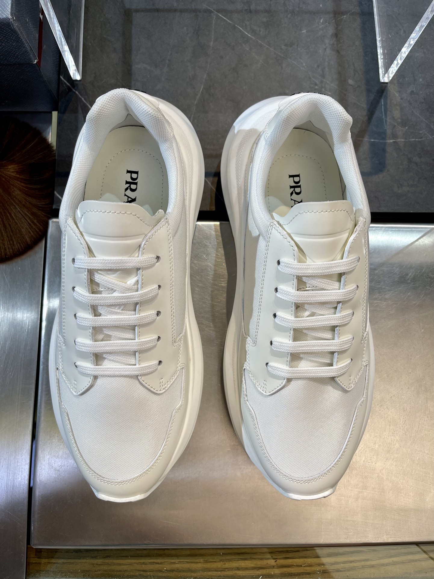 Prada men's platform sneakers, sizes 39-44. Hidden laces, hand-stitched details, lightweight sole with 6.5cm height increase. Modern classic design.