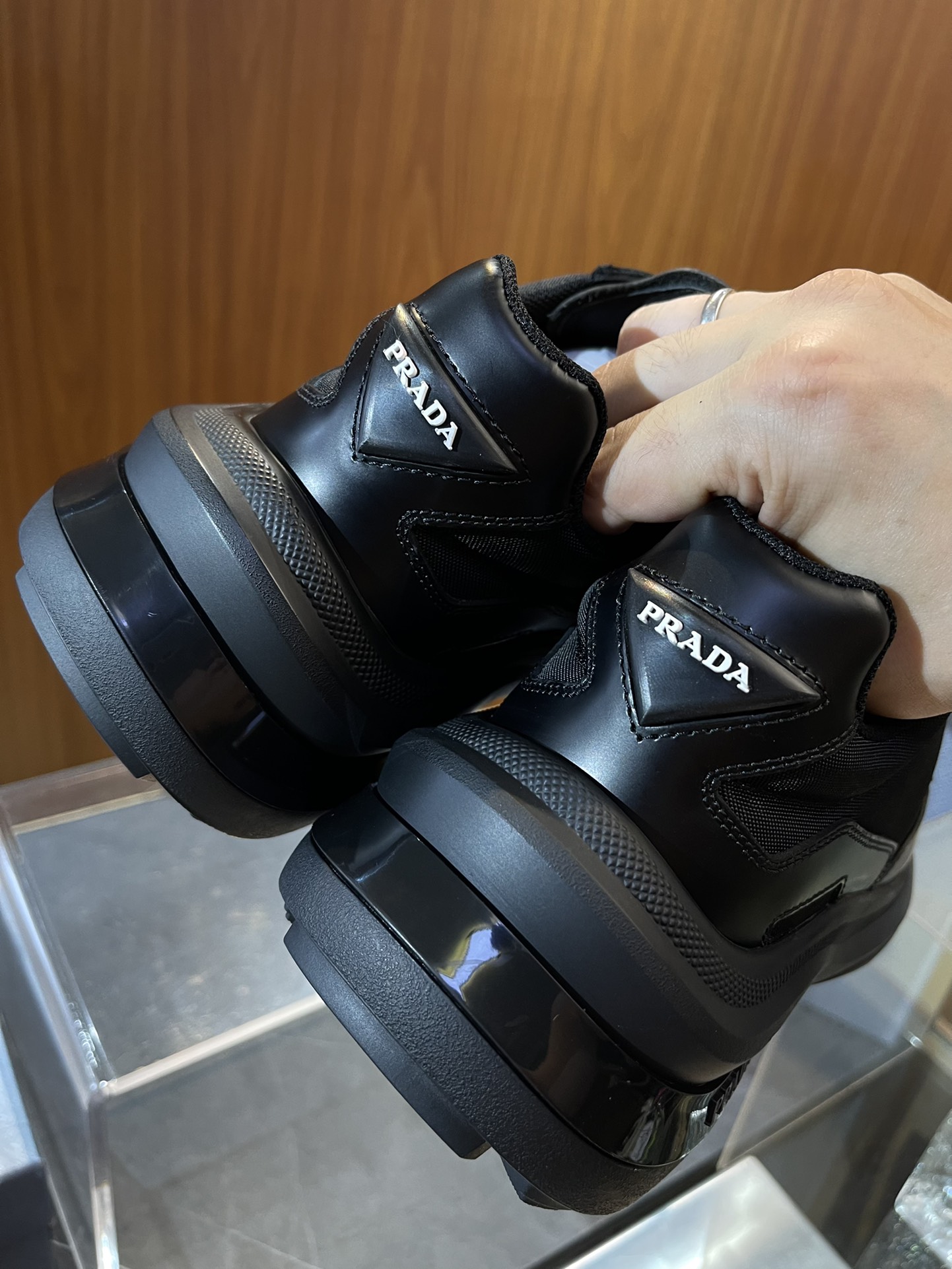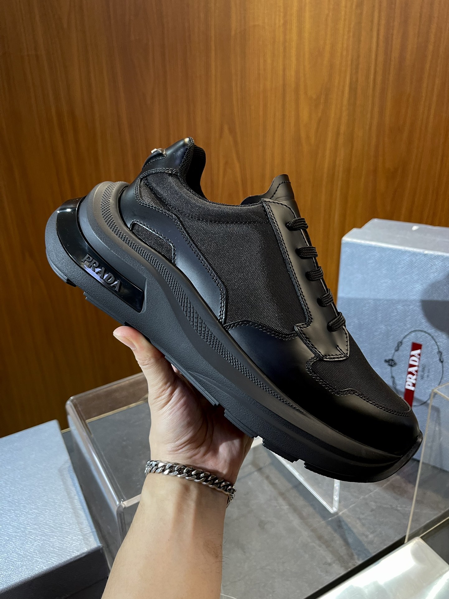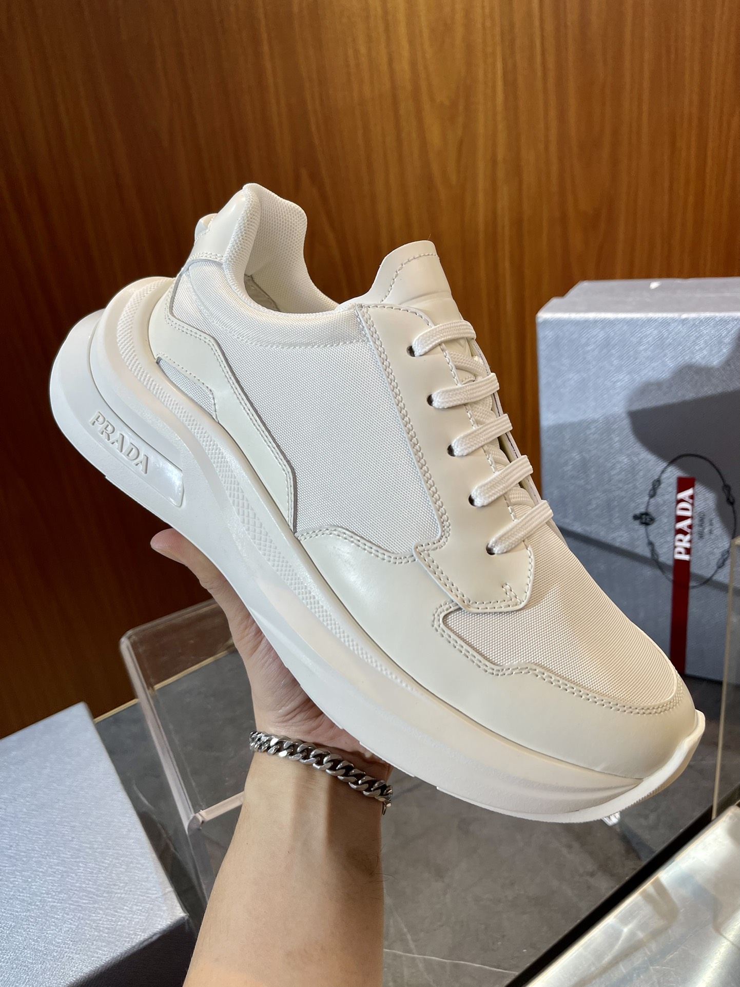 Prada men's platform sneakers, sizes 39-44. Hidden laces, hand-stitched details, lightweight sole with 6.5cm height increase. Modern classic design.
