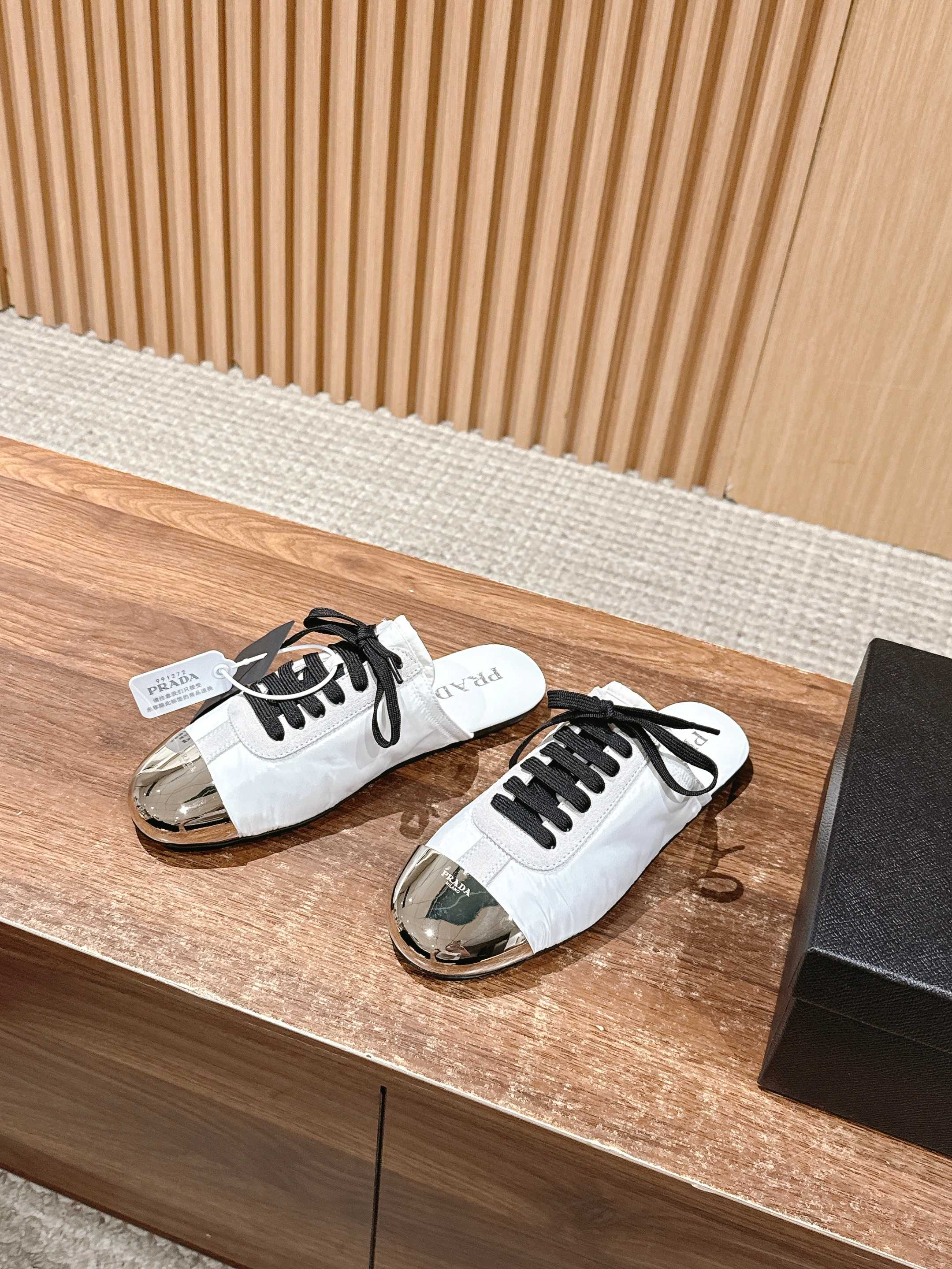 Prada new metal toe low-profile training shoes. Upper: suede/fabric. Lining: lambskin. Sole: TPU. Sizes 35-41. Lightweight, comfortable, stylish.