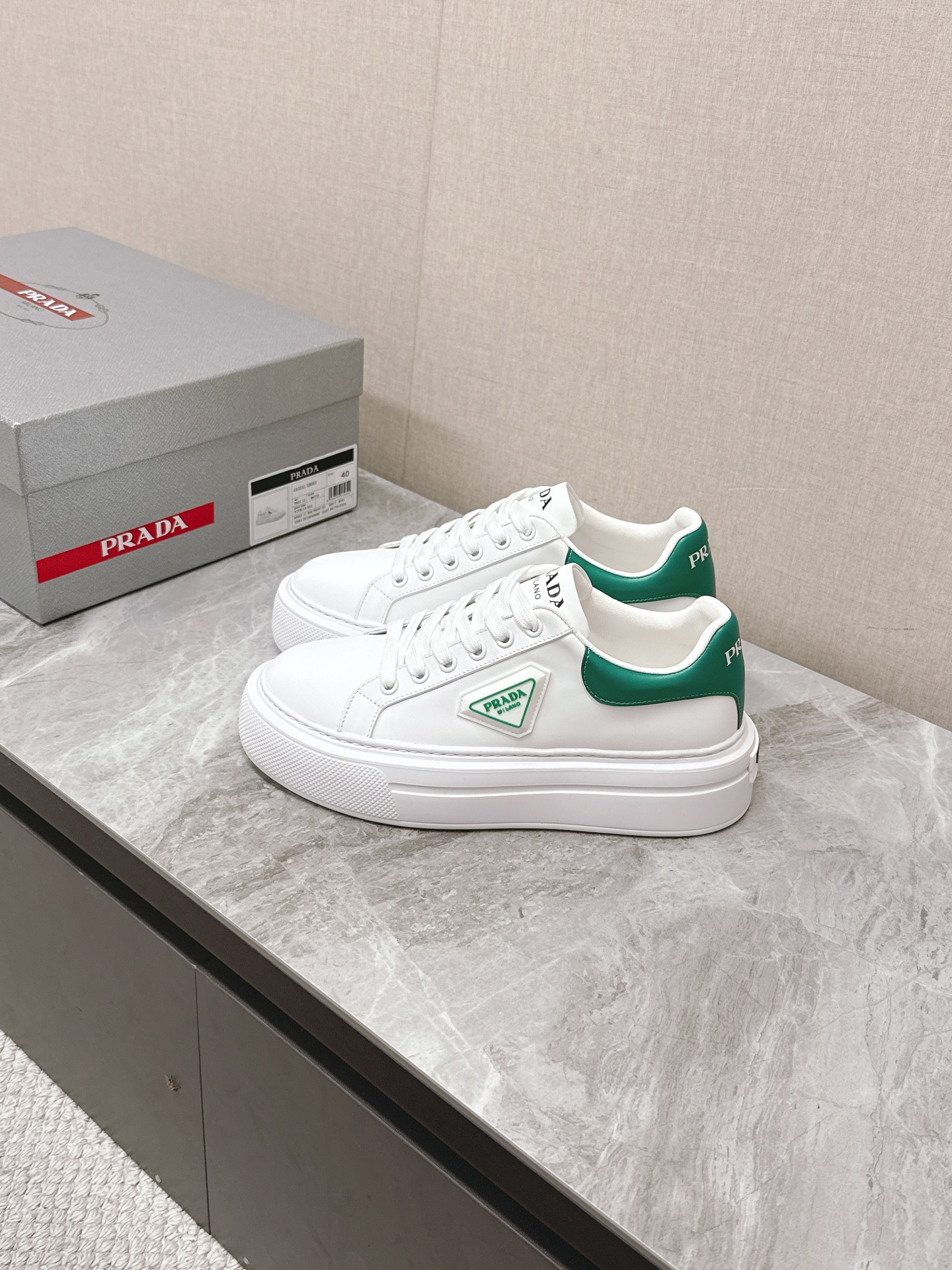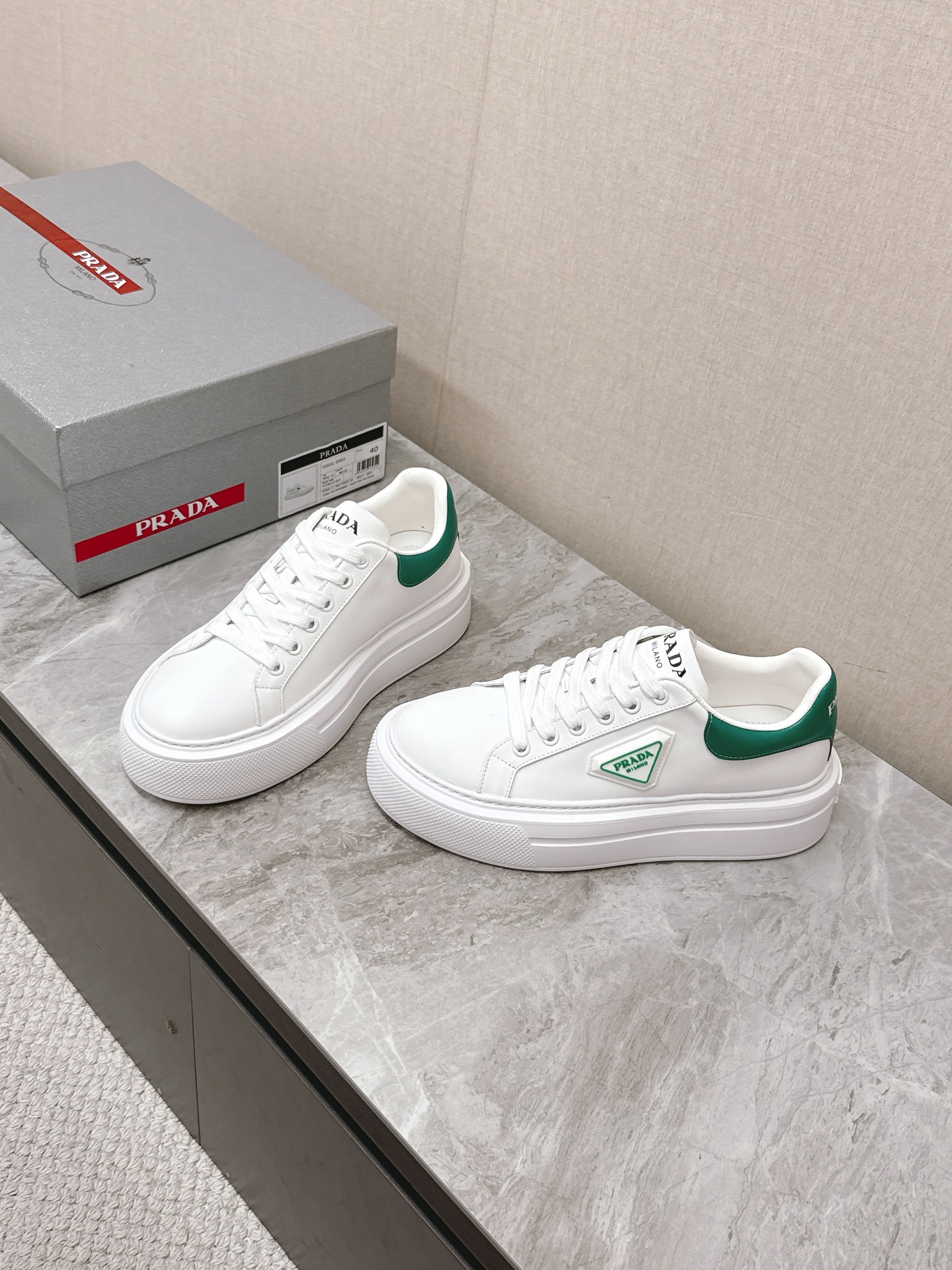 PRADA retro platform sneakers for couples. Classic white with triangle logo. Versatile and stylish. Made from imported calfskin and sheepskin. Sizes 35-44.