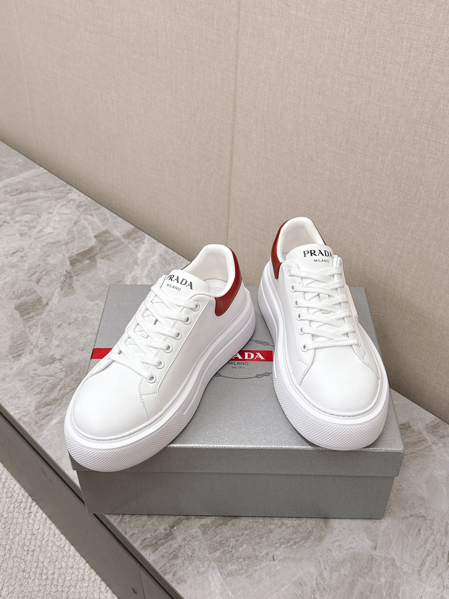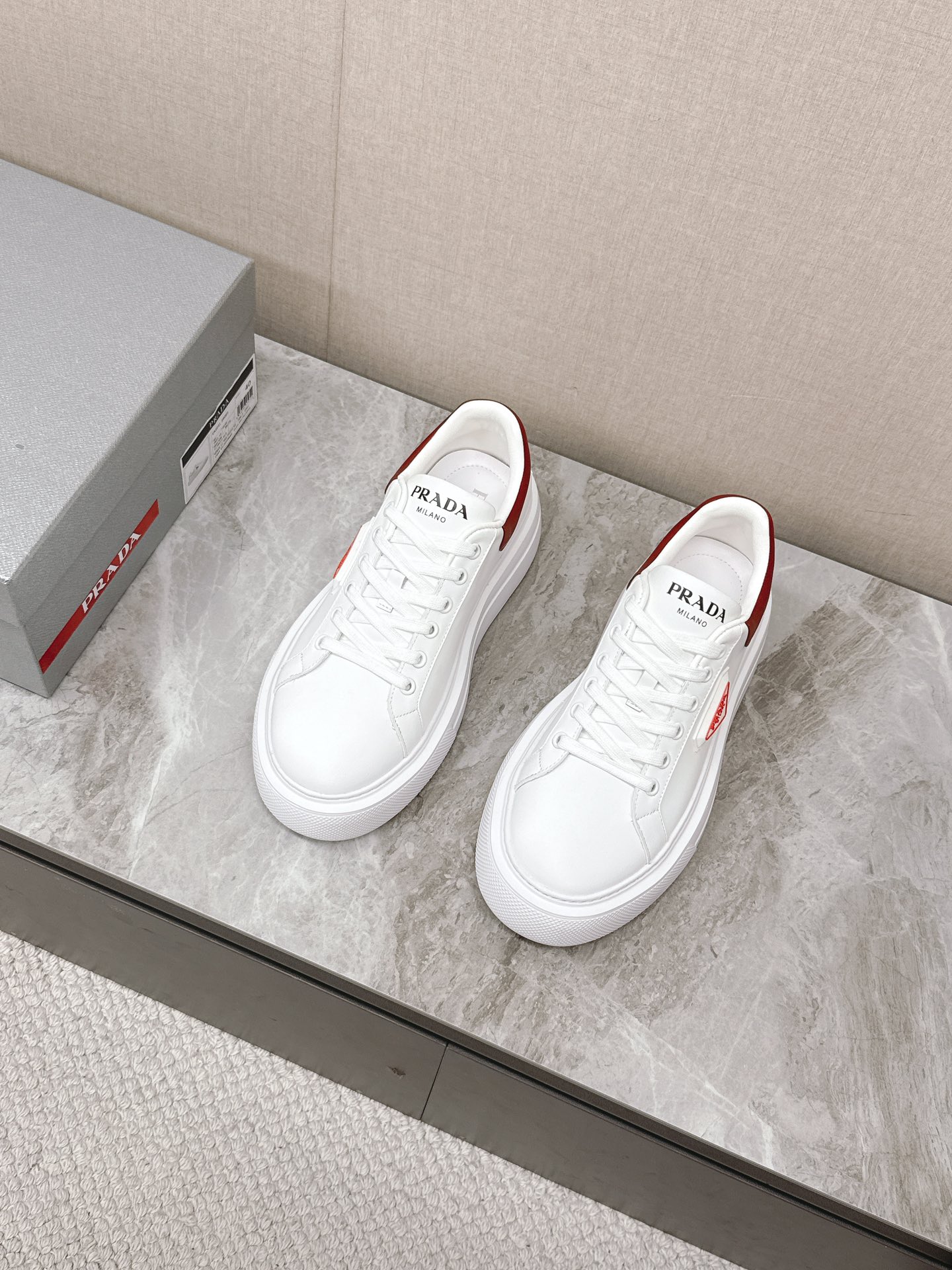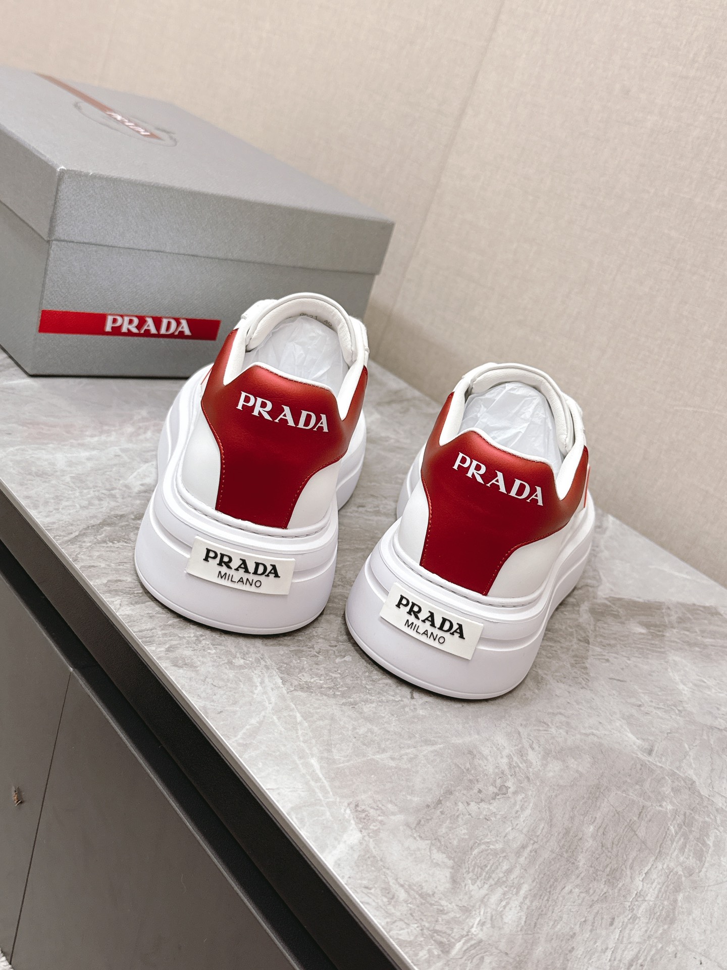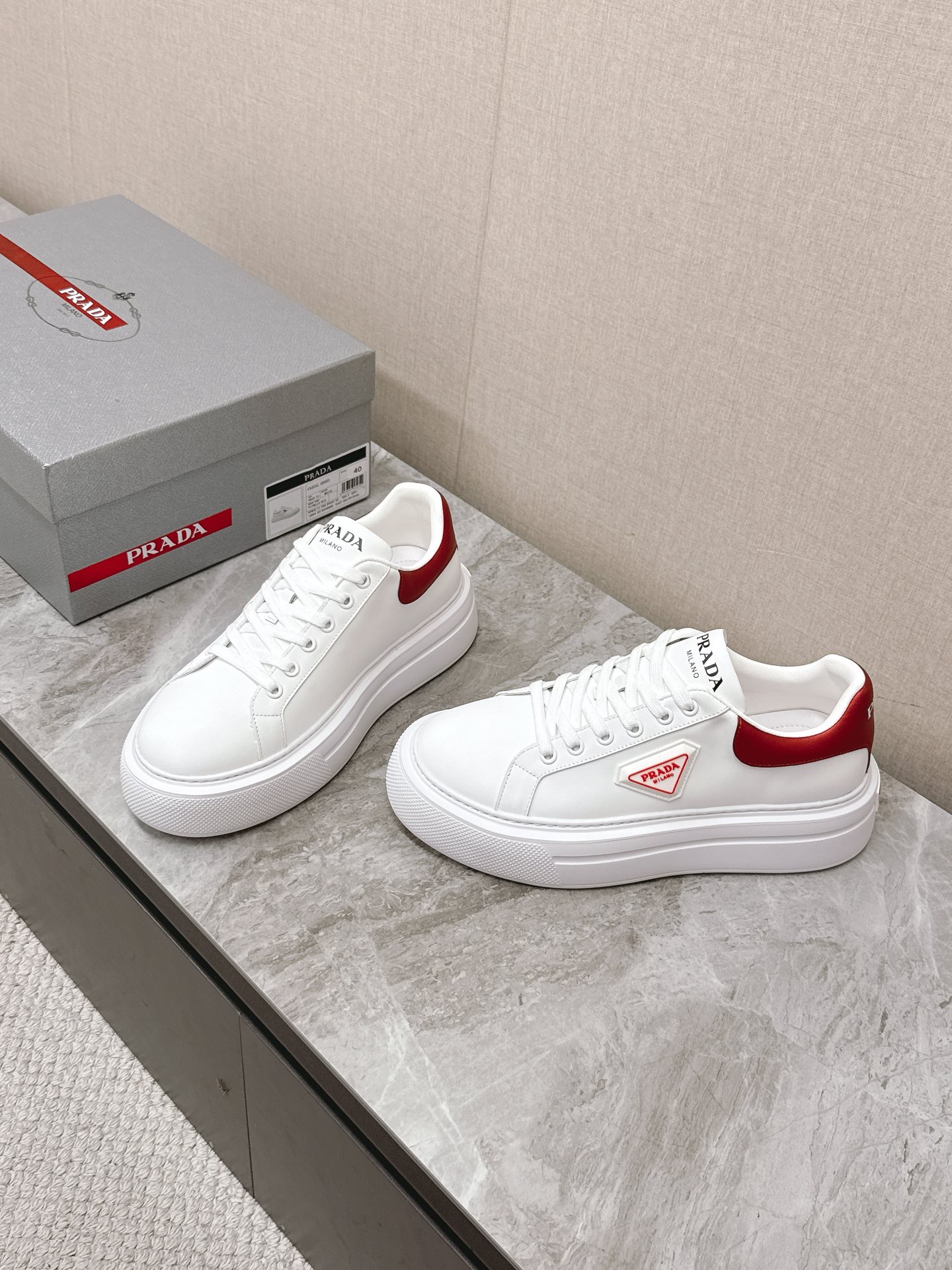 PRADA retro platform sneakers for couples, iconic triangle logo. Versatile and fashionable. Imported calfskin upper, mixed sheepskin lining, non-slip rubber sole. Sizes 35-44.