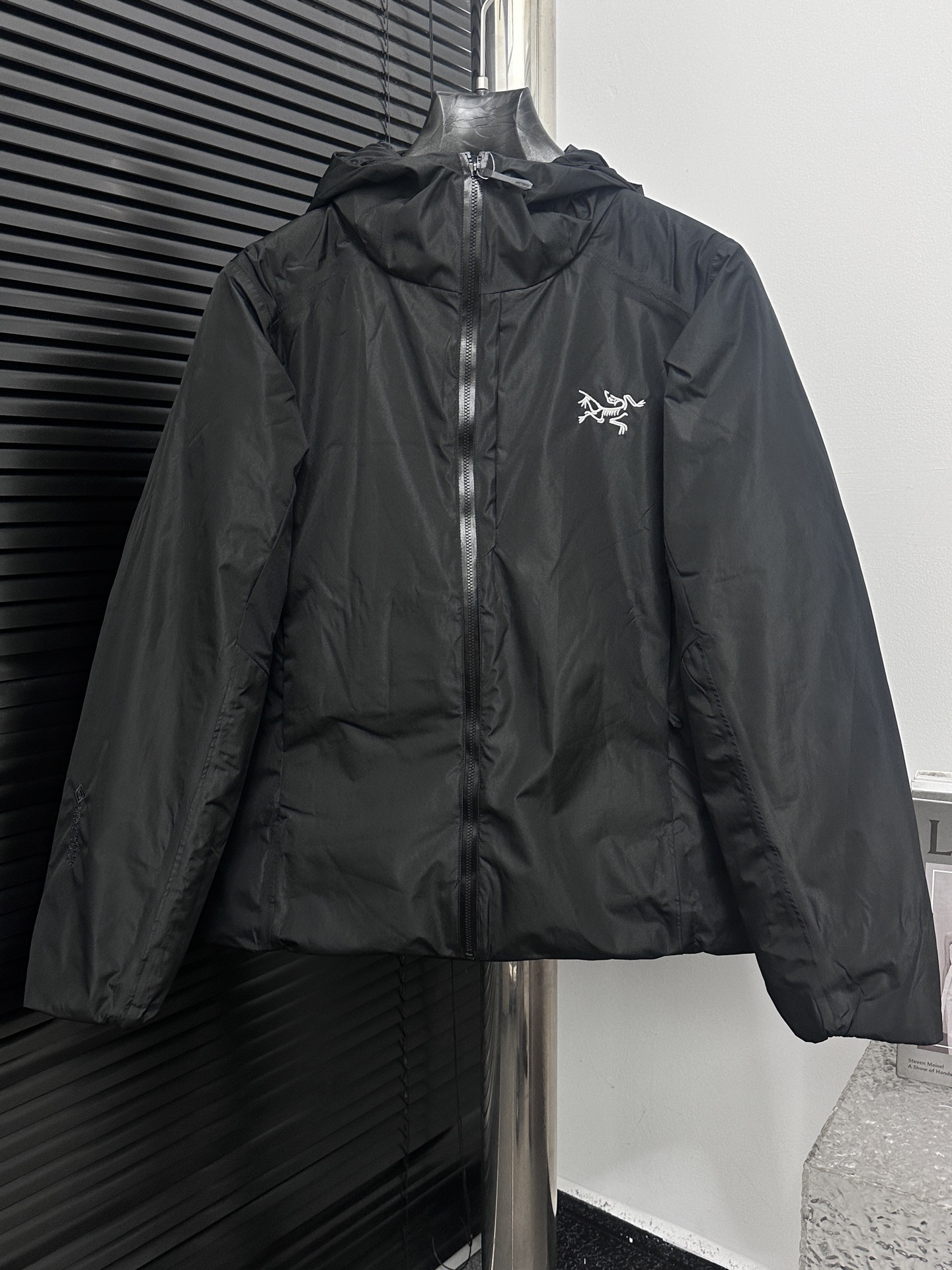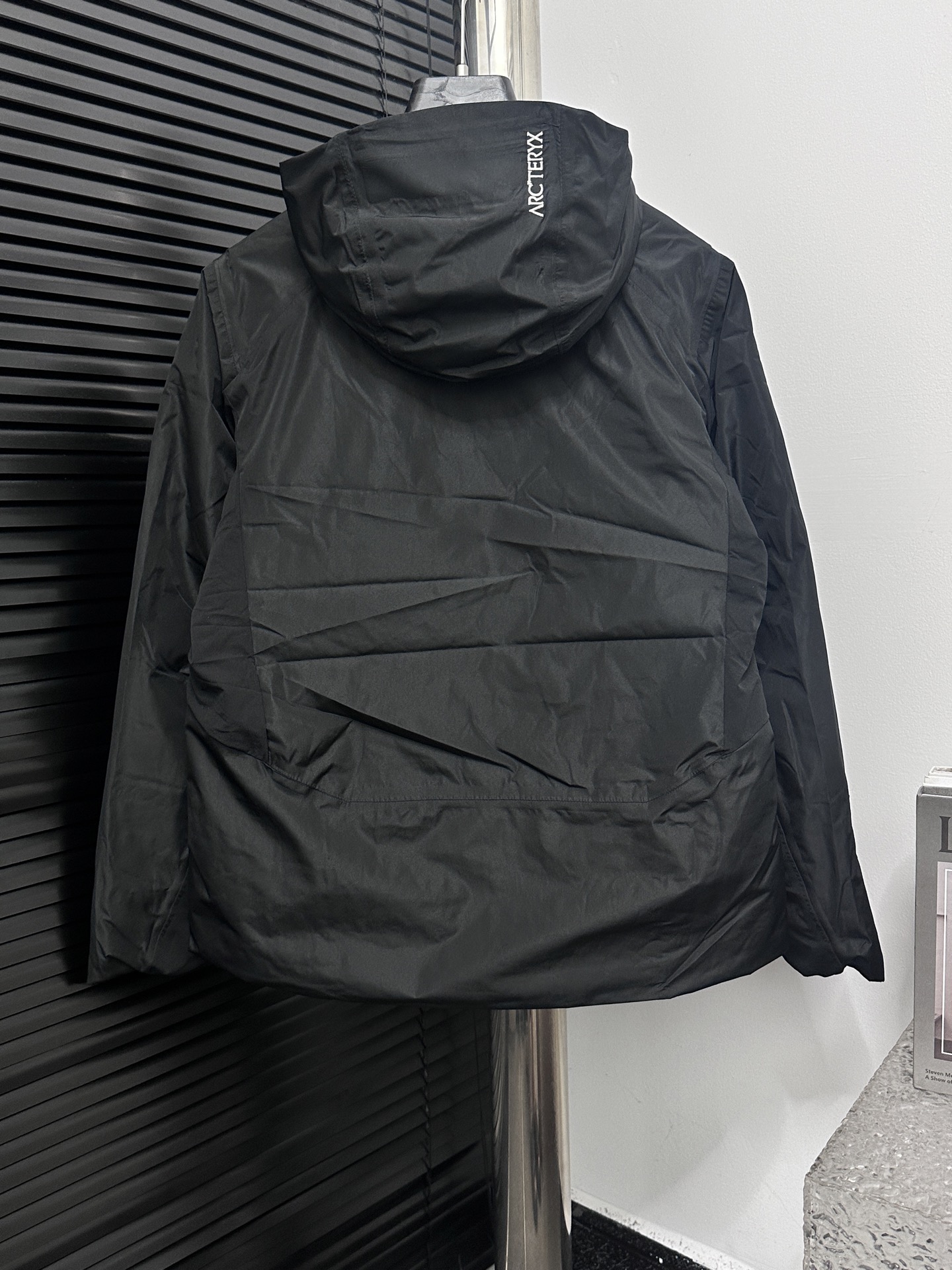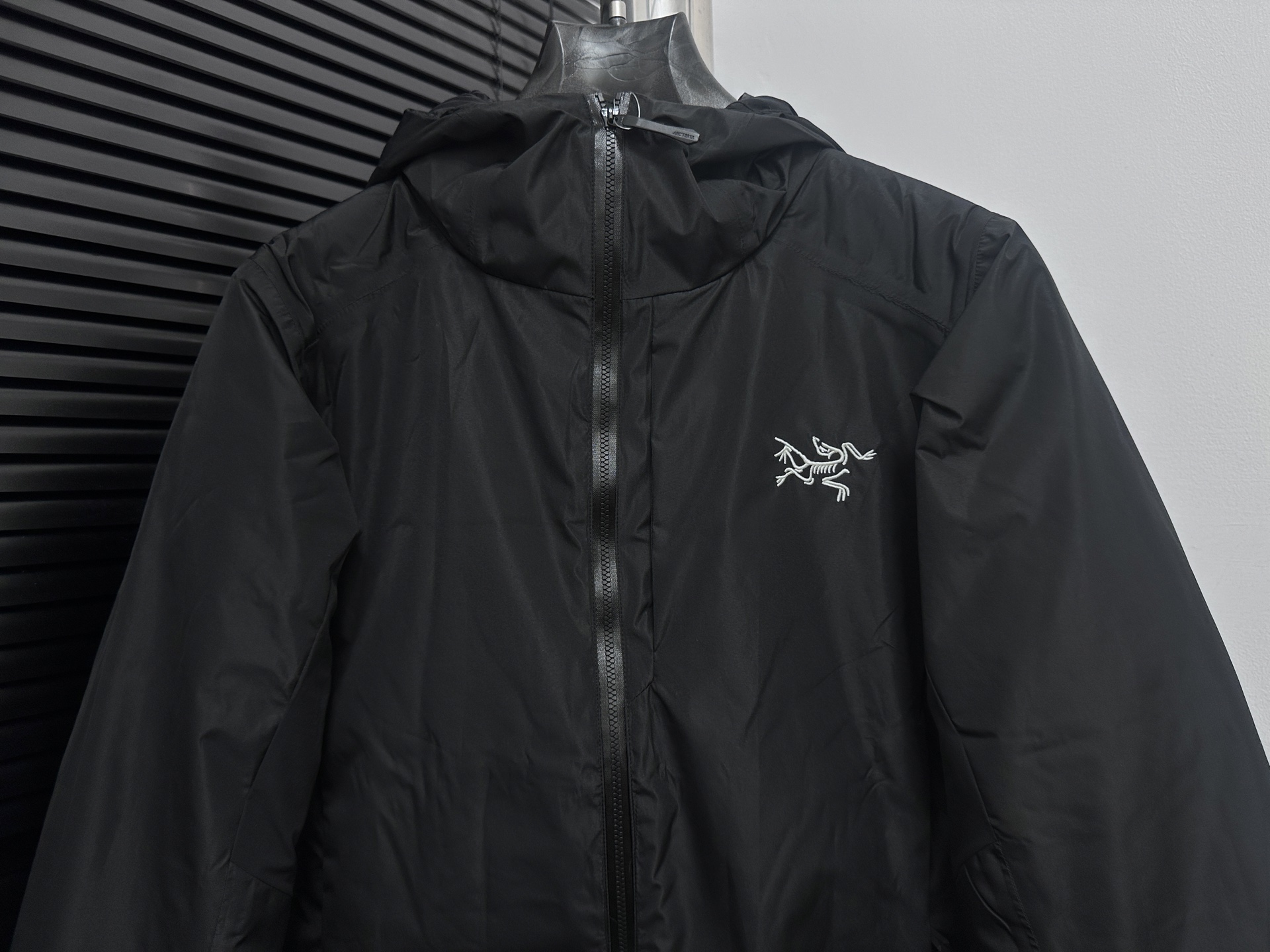 Solano Down Hoody with 750 fill white duck down, Gore-Tex fabric for wind and rain protection, breathable softshell panels.