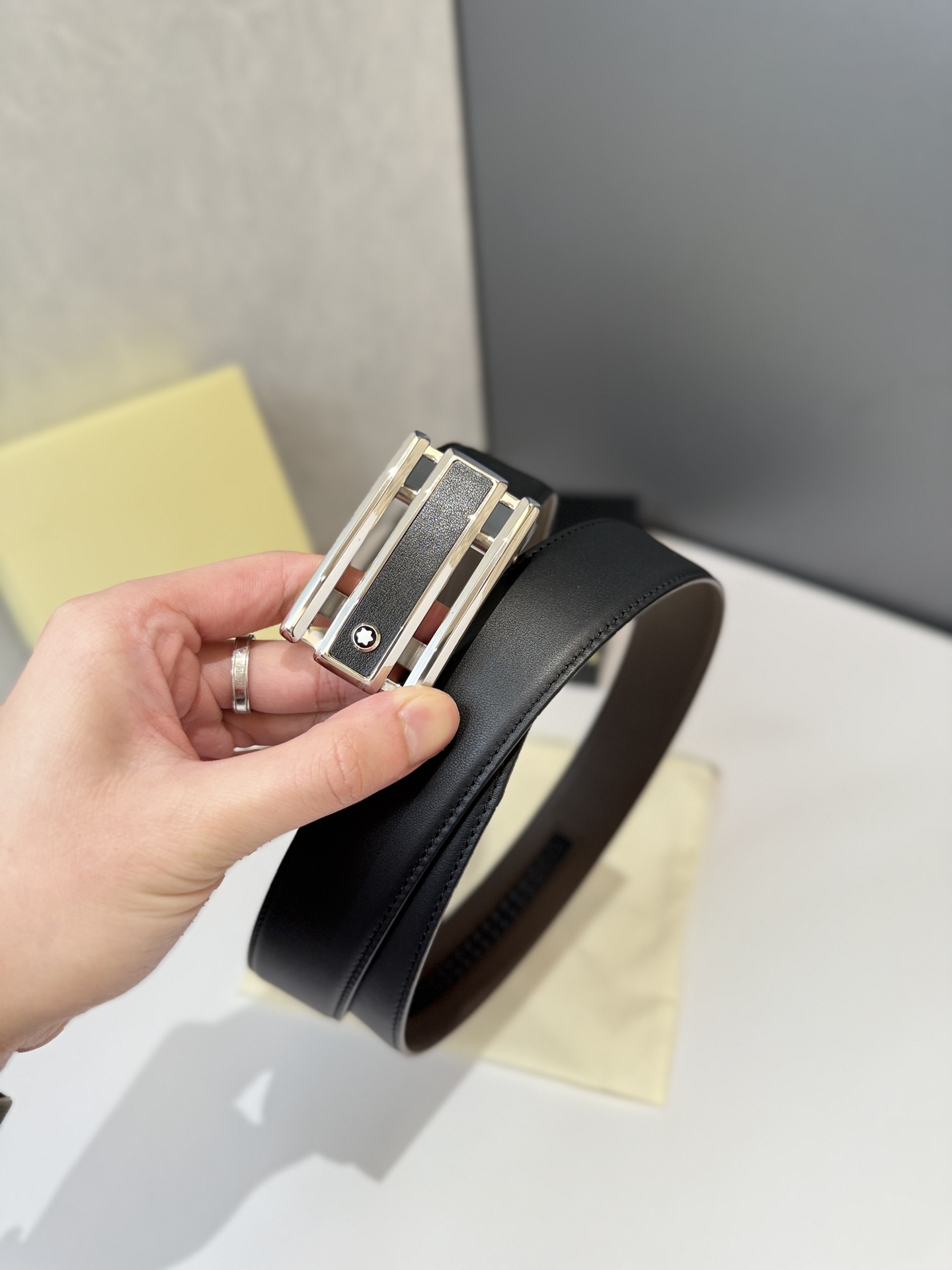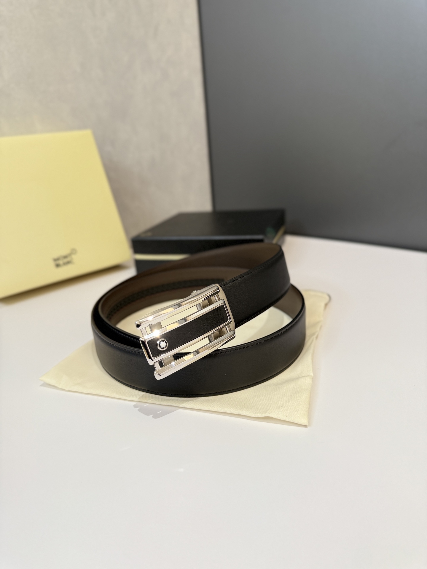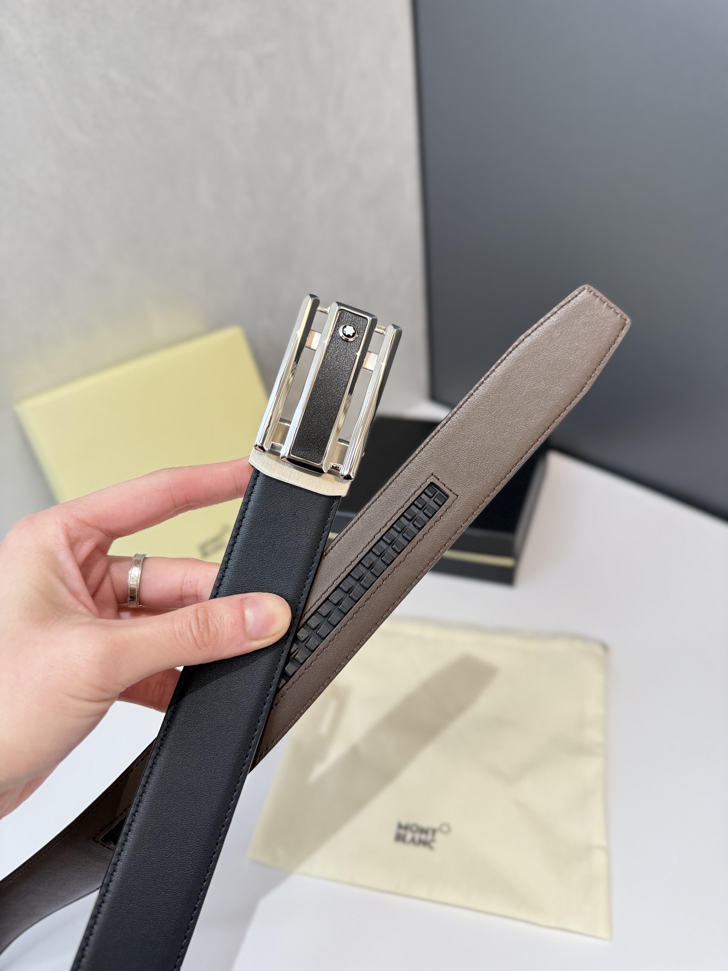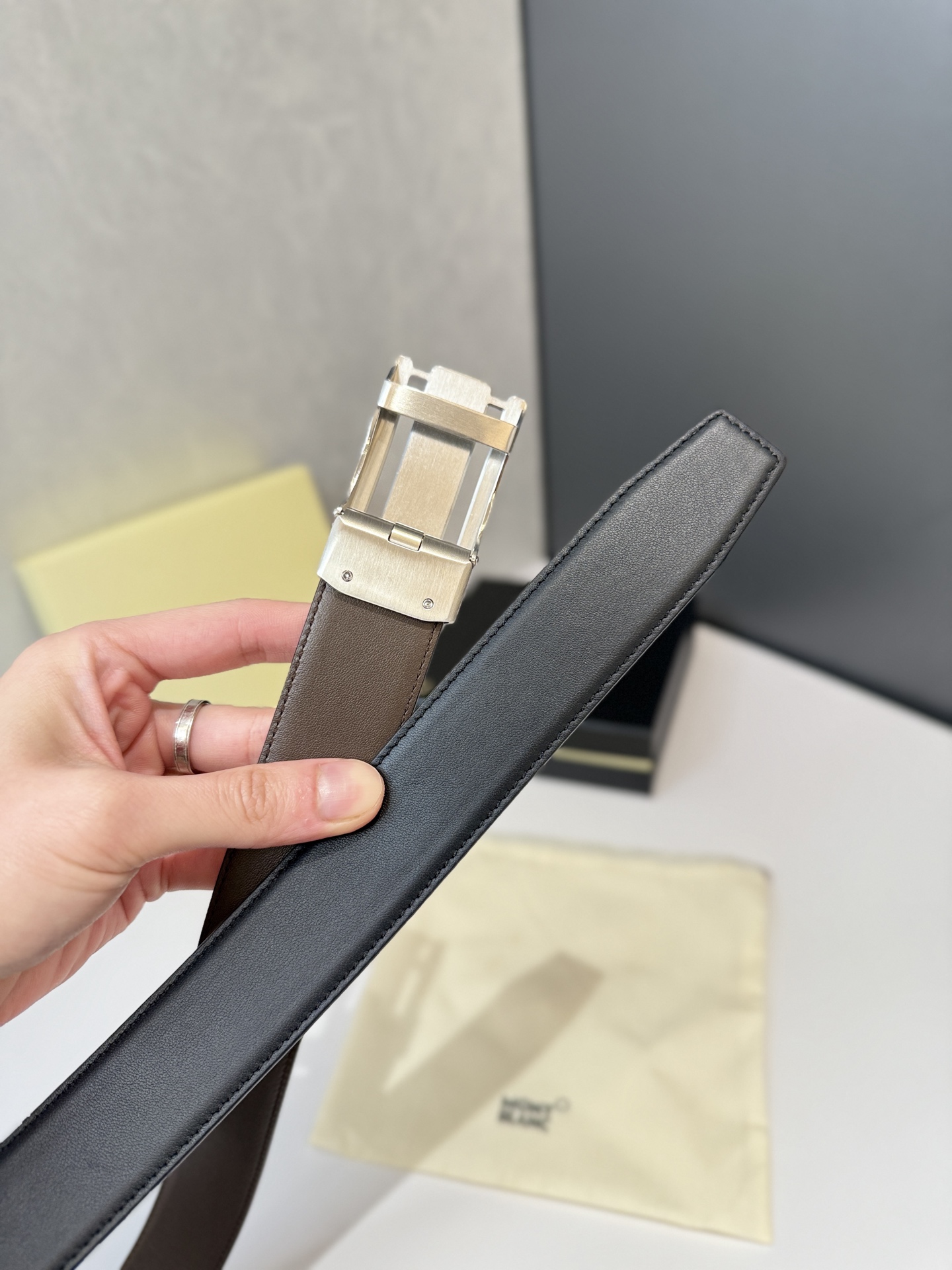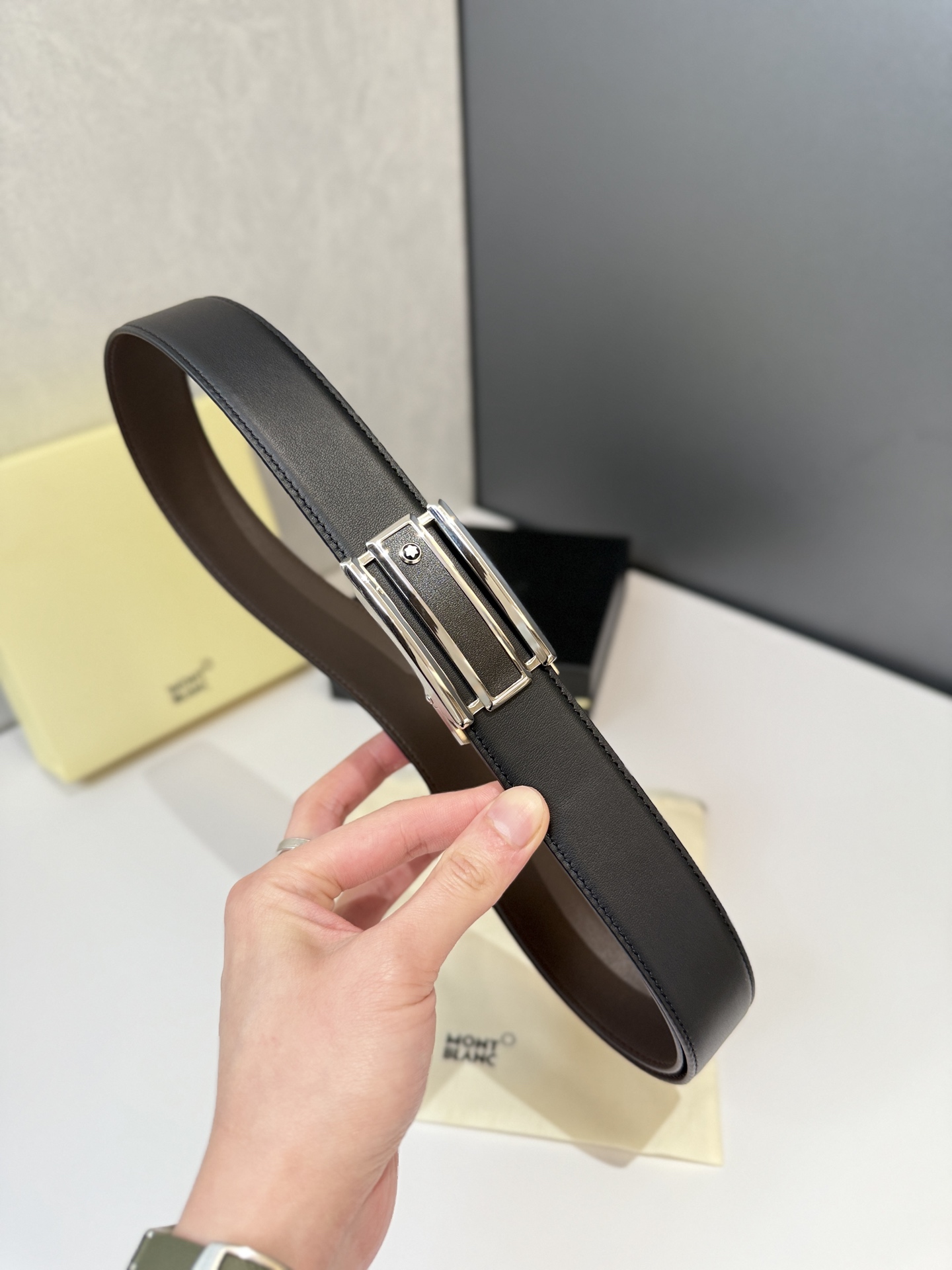 Montblanc automatic smooth buckle belt is one of the classic accessories of the luxury brand Montblanc, known for its exquisite design, high-quality materials, and excellent craftsmanship. Montblanc belts are usually suitable for business, formal occasions, or daily wear, showcasing a low-key sense of luxury. Stainless steel automatic hardware paired with double-sided original leather. Length can be adjusted.