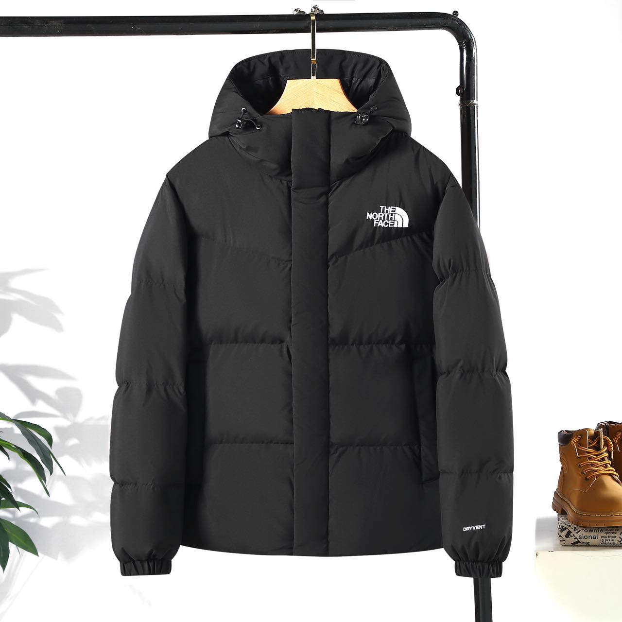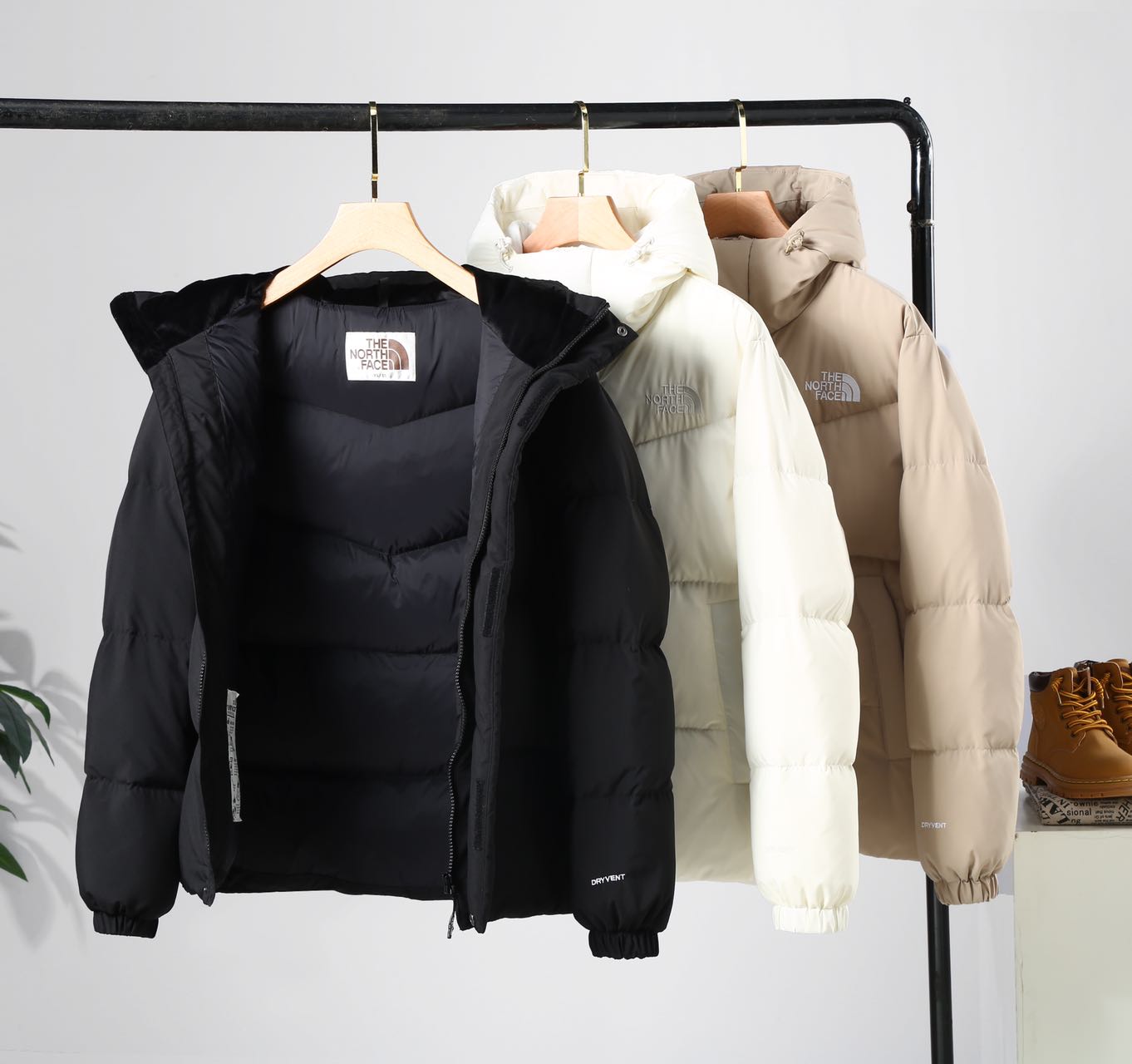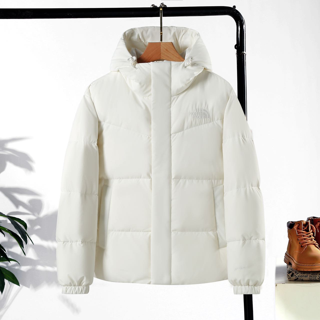 Top North Face down jacket, unisex hooded design. 3D cut, 90% white duck down, 800 fill. Slim fit, windproof, stylish. Colors: Black, Khaki, White. Sizes: XS-2XL.