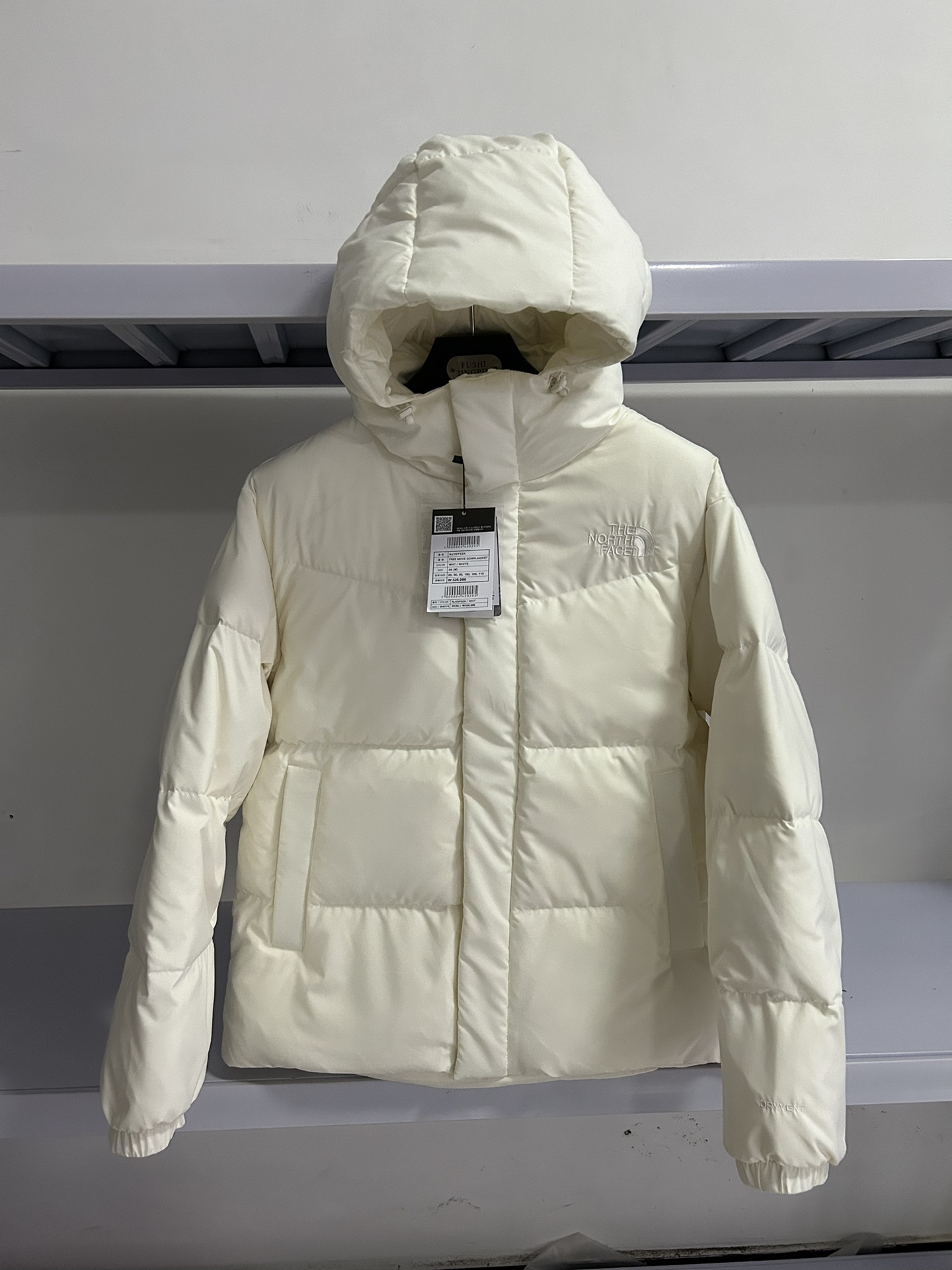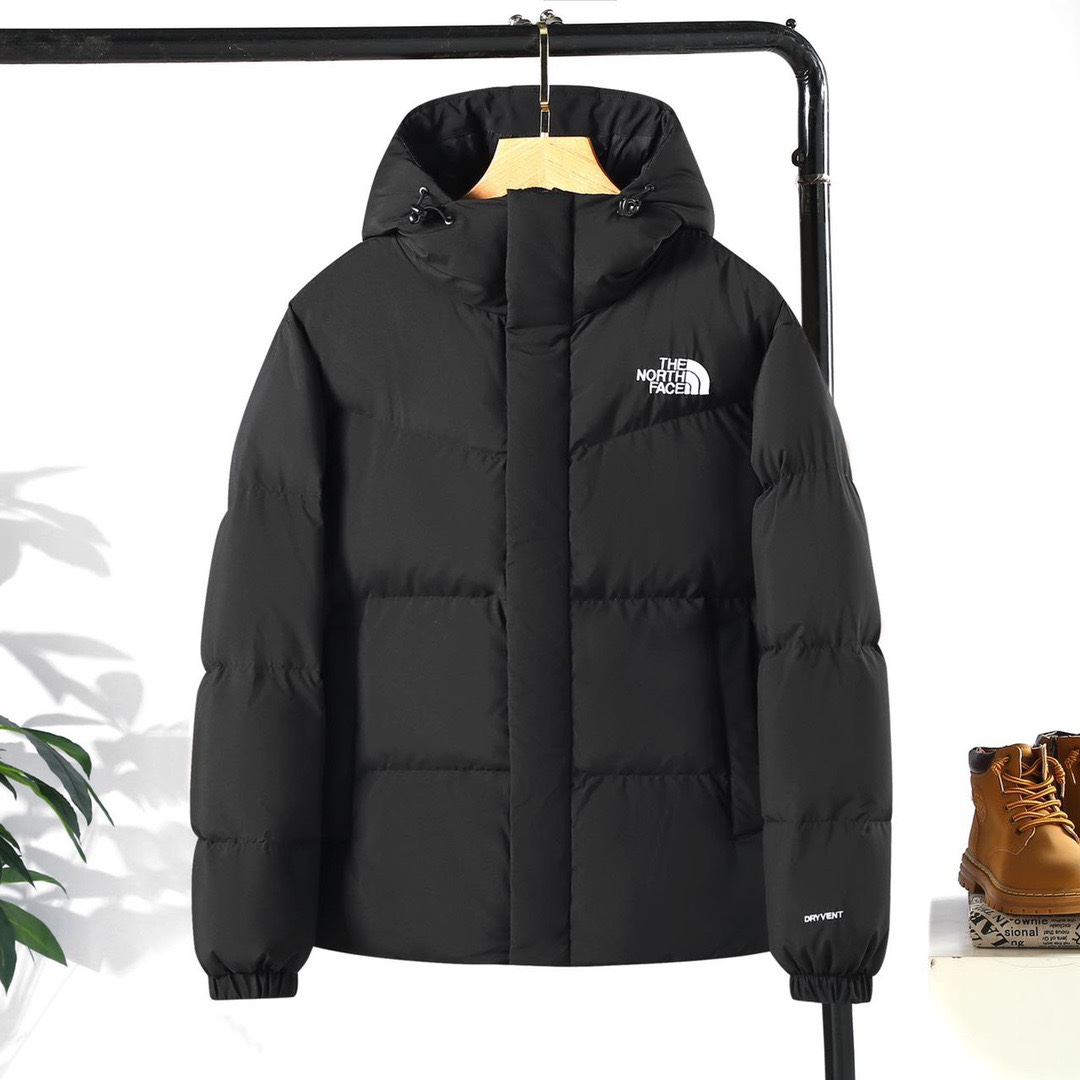 Top North Face down jacket, unisex hooded design. 3D cut, 90% white duck down, 800 fill. Stylish, warm, windproof. Colors: Black, Khaki, White. Sizes: XS-2XL.