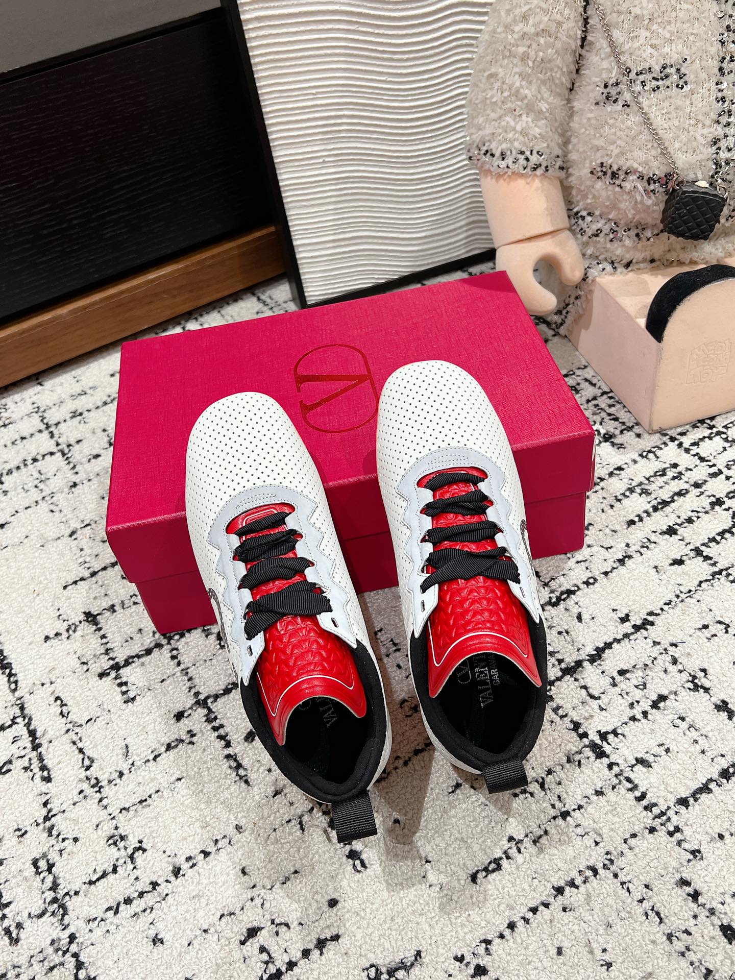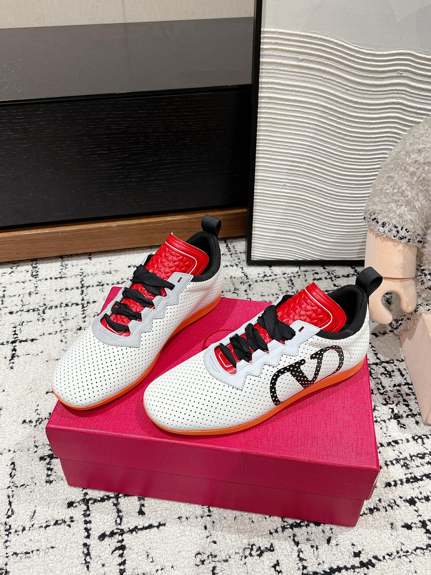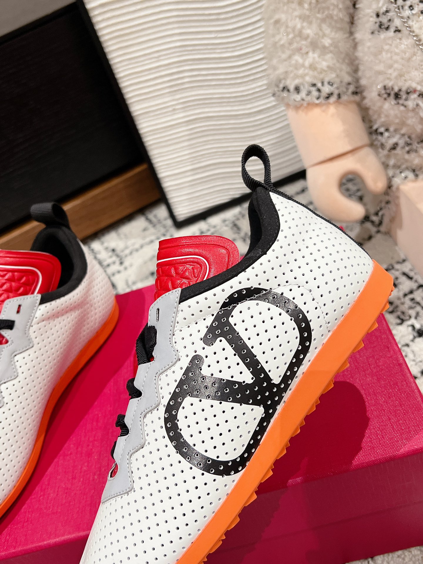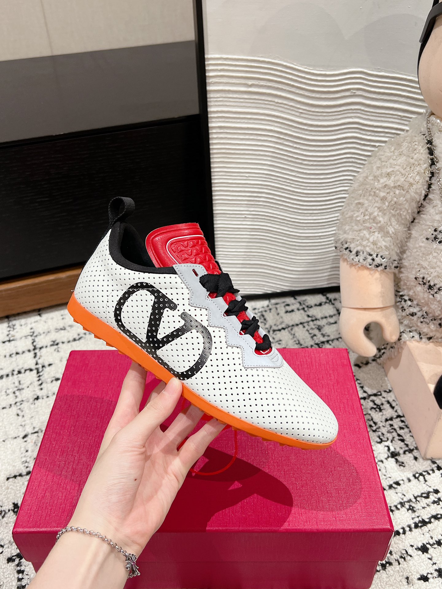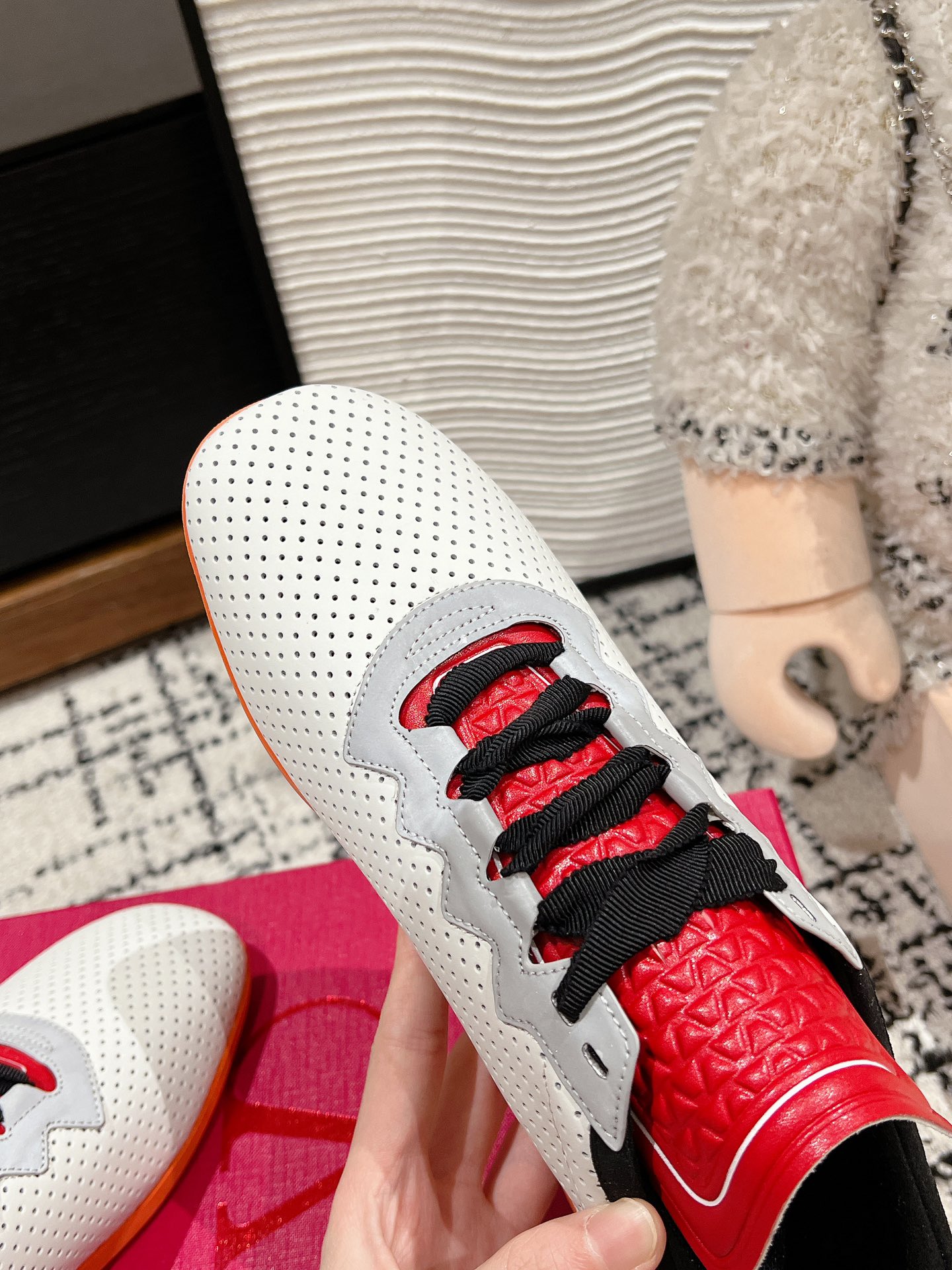 Valentino FW25 new unisex ballet sneakers. Calfskin upper with perforations, color-blocking, and signature V logo. Retro thin sole and comfortable fit. Women's 35-40, Men's 39-44.