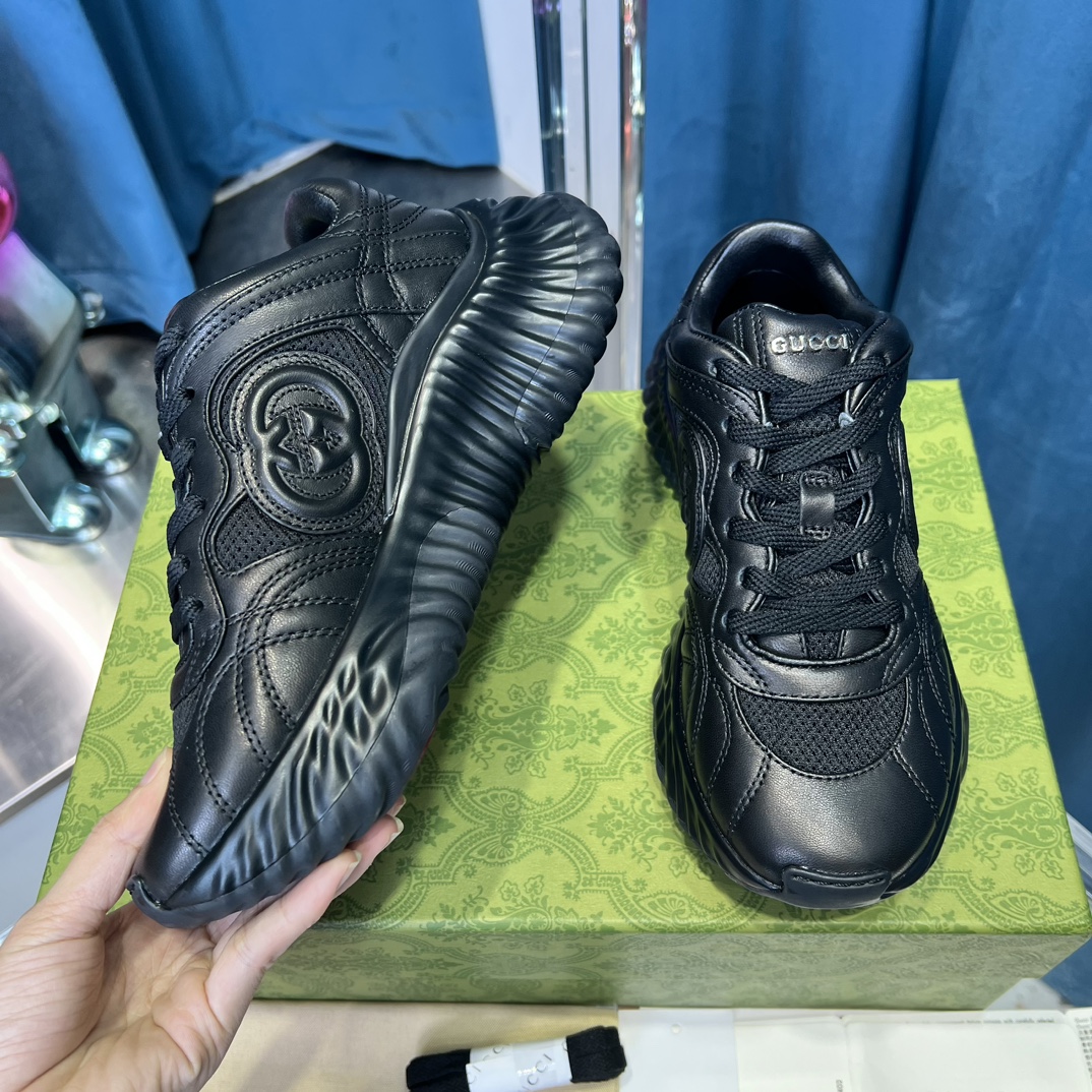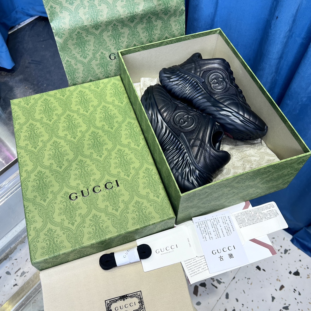 Original version purchased for development and production. Gucci Ripple series sneakers use innovative stitching techniques to create a flowing texture like water. The leather design is paired with three-dimensional interlocking double G leather appliqués and Gucci letter metal accessories, achieving a free-flowing texture for the entire shoe with a 3D effect.