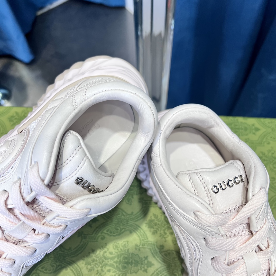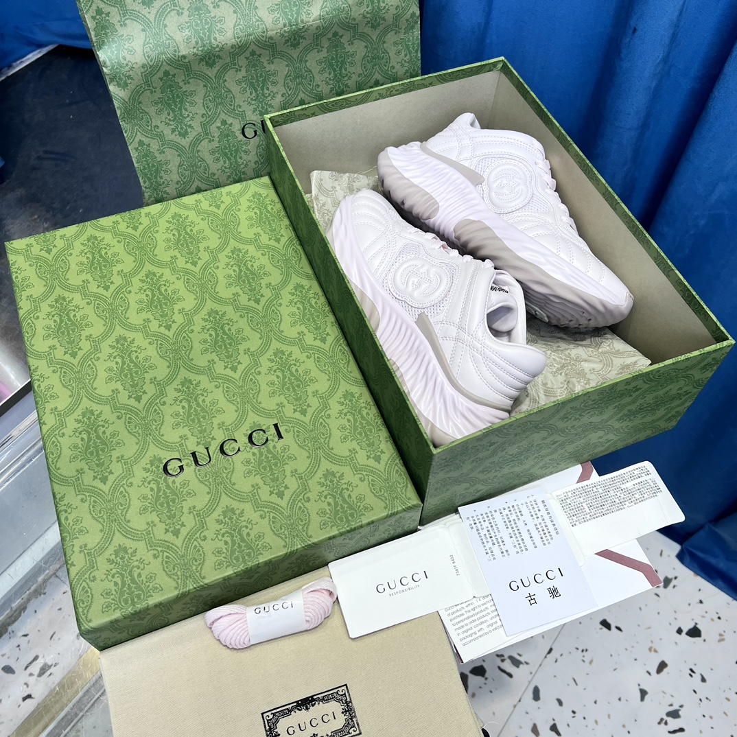 Original version purchased for development and production. Gucci Ripple series sneakers are crafted using innovative stitching techniques to create a fluid, water-like texture. The leather design is paired with three-dimensional interlocking double G leather appliqués and Gucci letter metal hardware, achieving a free-flowing texture with 3D effects throughout the shoe.