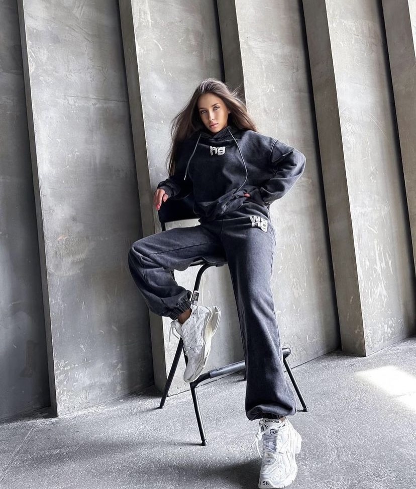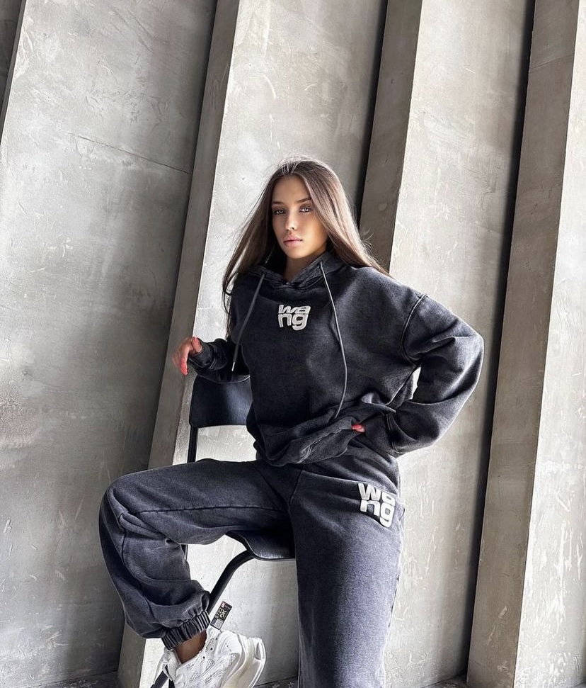 Style No. 20239000 Alexander* Wang's new sportswear set, 'wang' letter print long-sleeve hooded sweatshirt + elastic waist tapered-leg casual pants, gray, SML, [Size M; shoulder width 54, bust 108, sleeve length 57, length 64; waist 66 elastic, length 107]