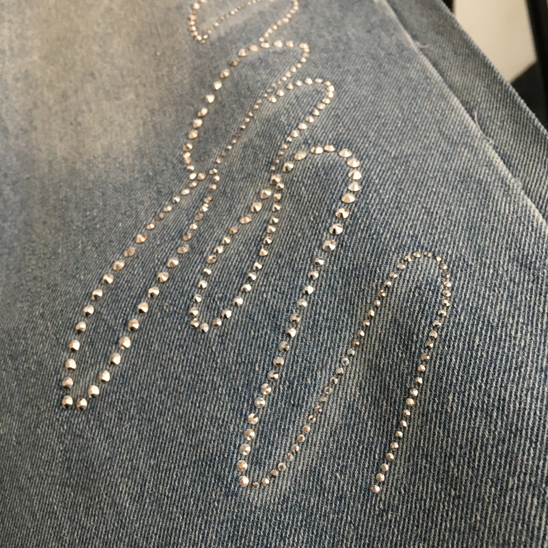 Alexander King's new stylish rhinestone denim pants in blue, sizes SML.