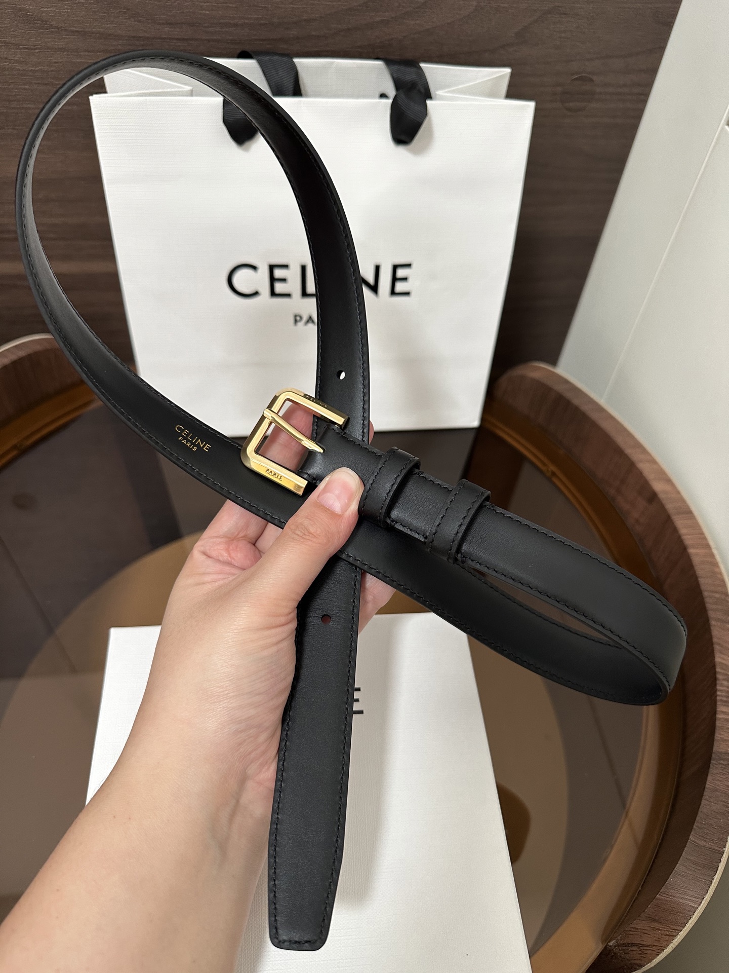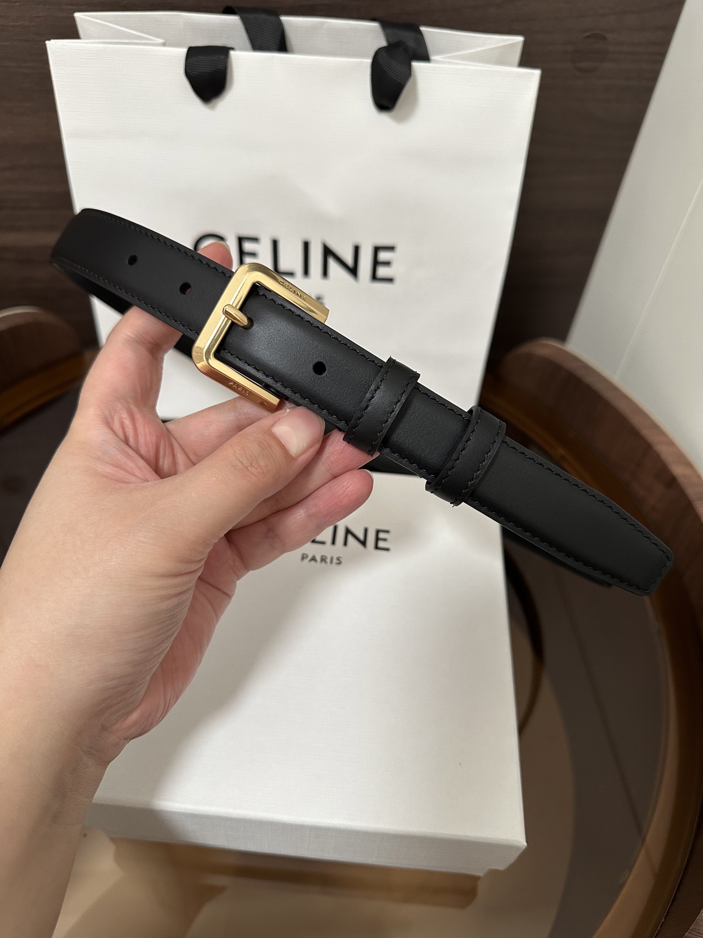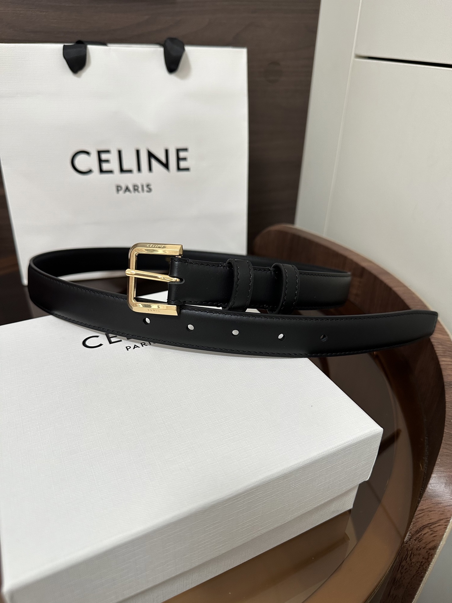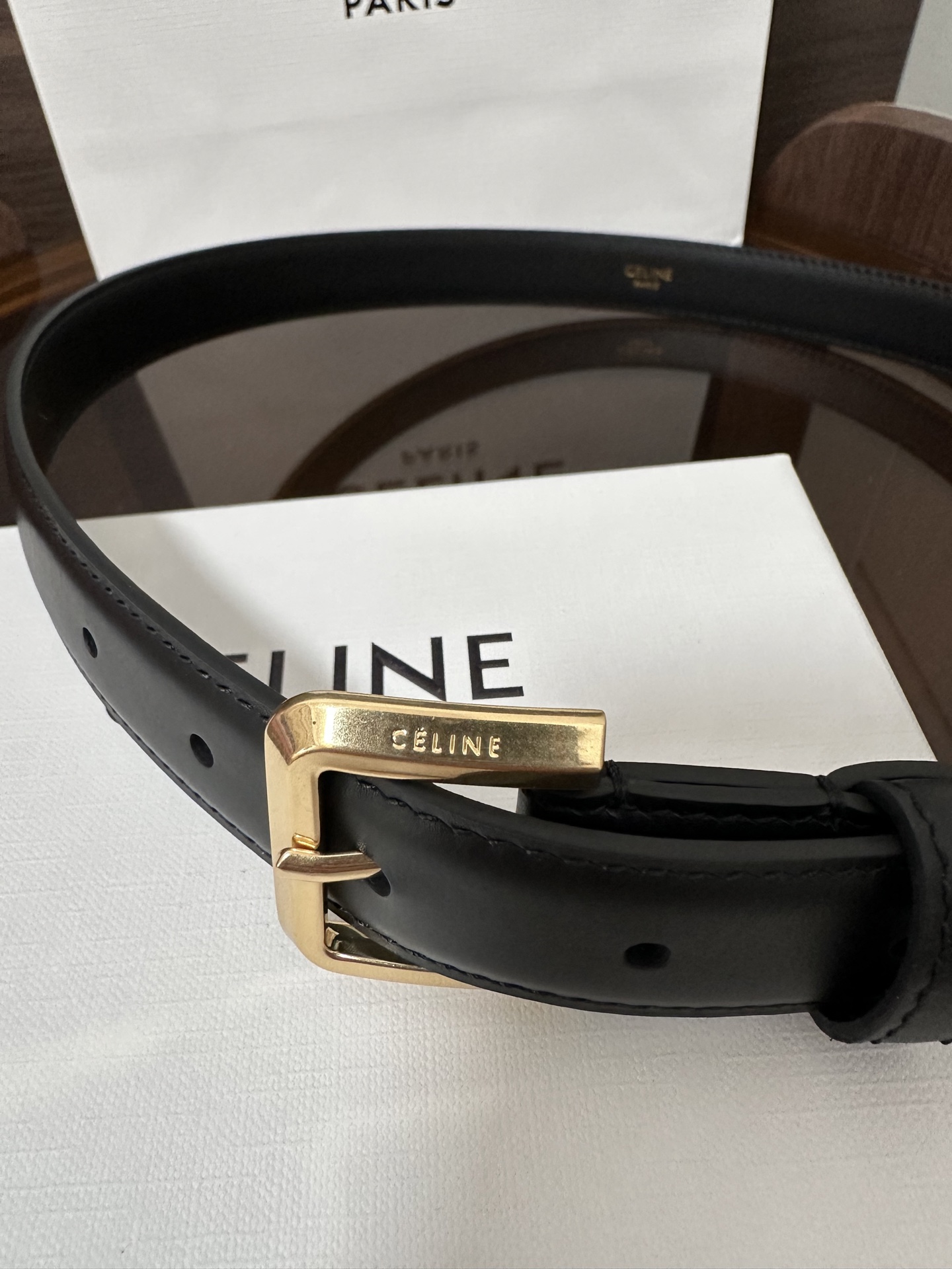 CÉLINE Western Smooth Calfskin Belt with Gold Metal Hardware Square Buckle Width: 2.5cm