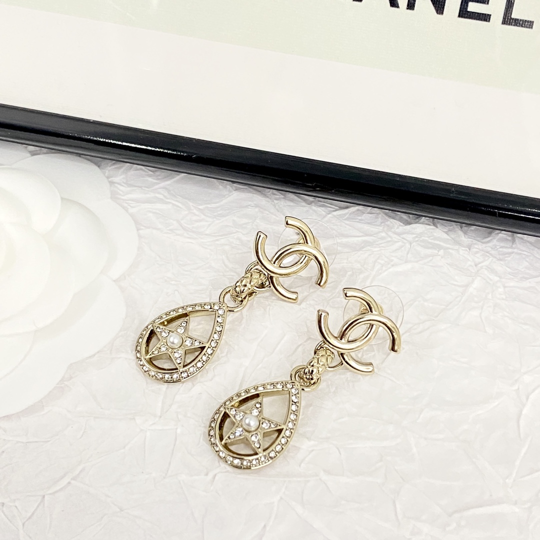 Chanel镂空双C耳钉 with crystal stars, elegant for daily wear or special occasions.