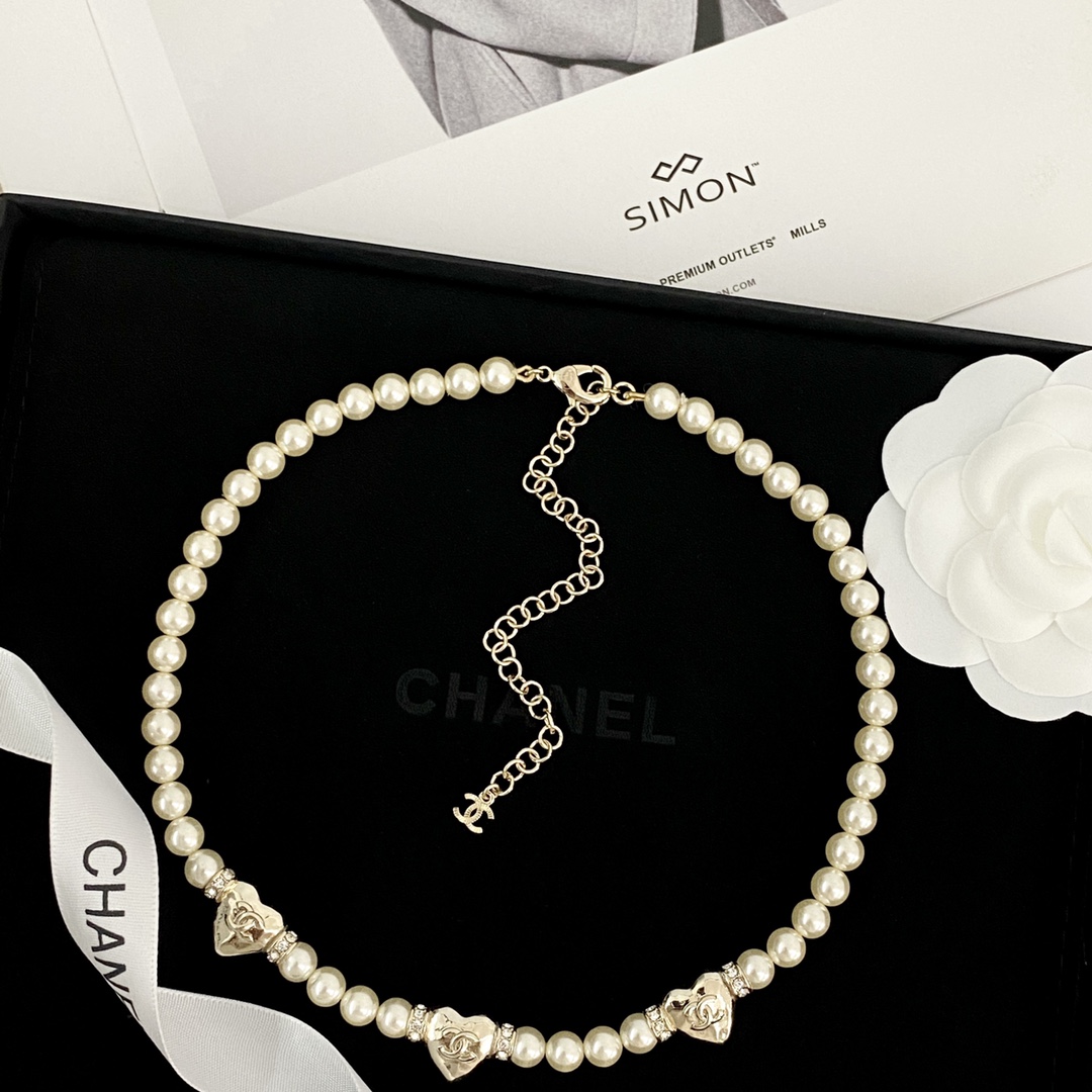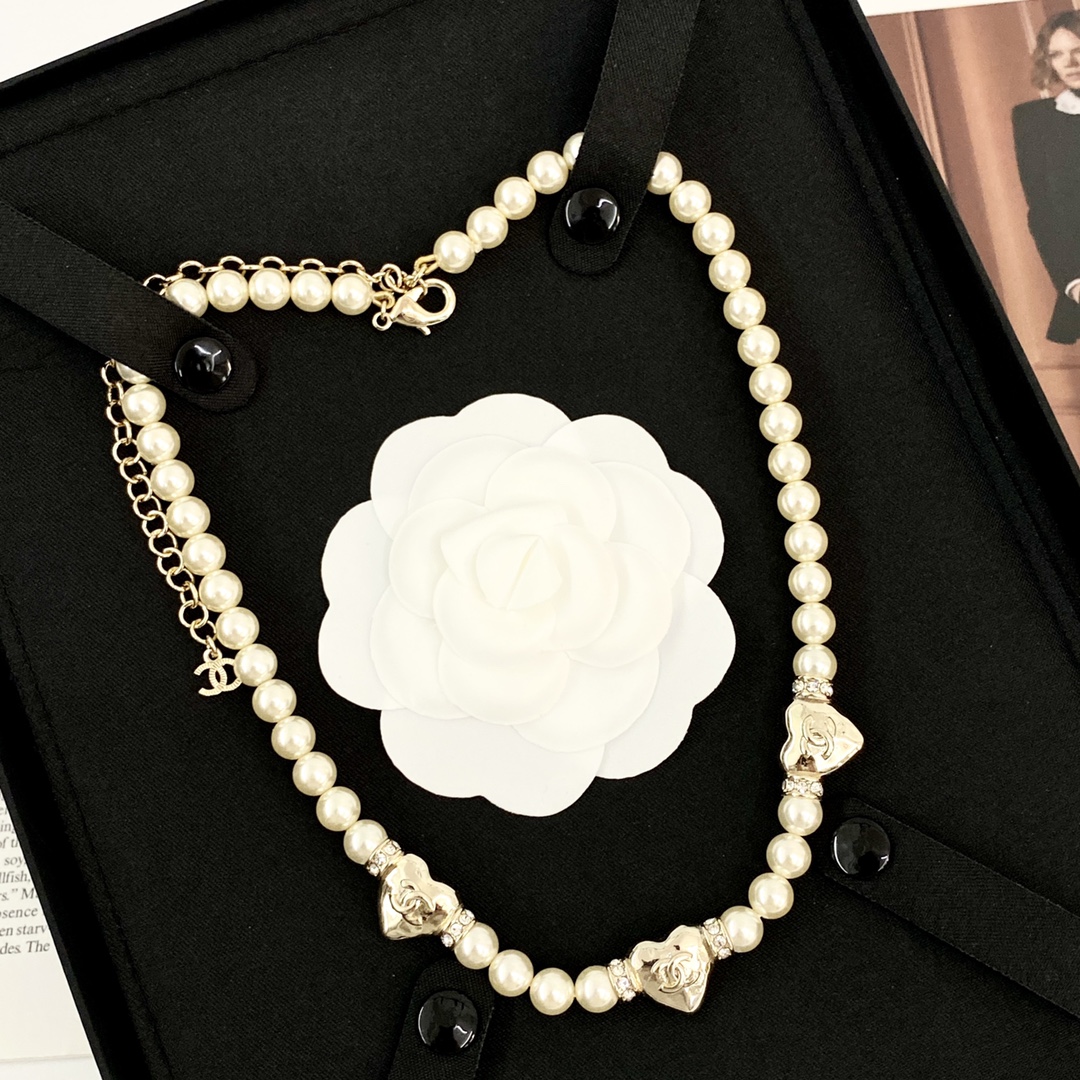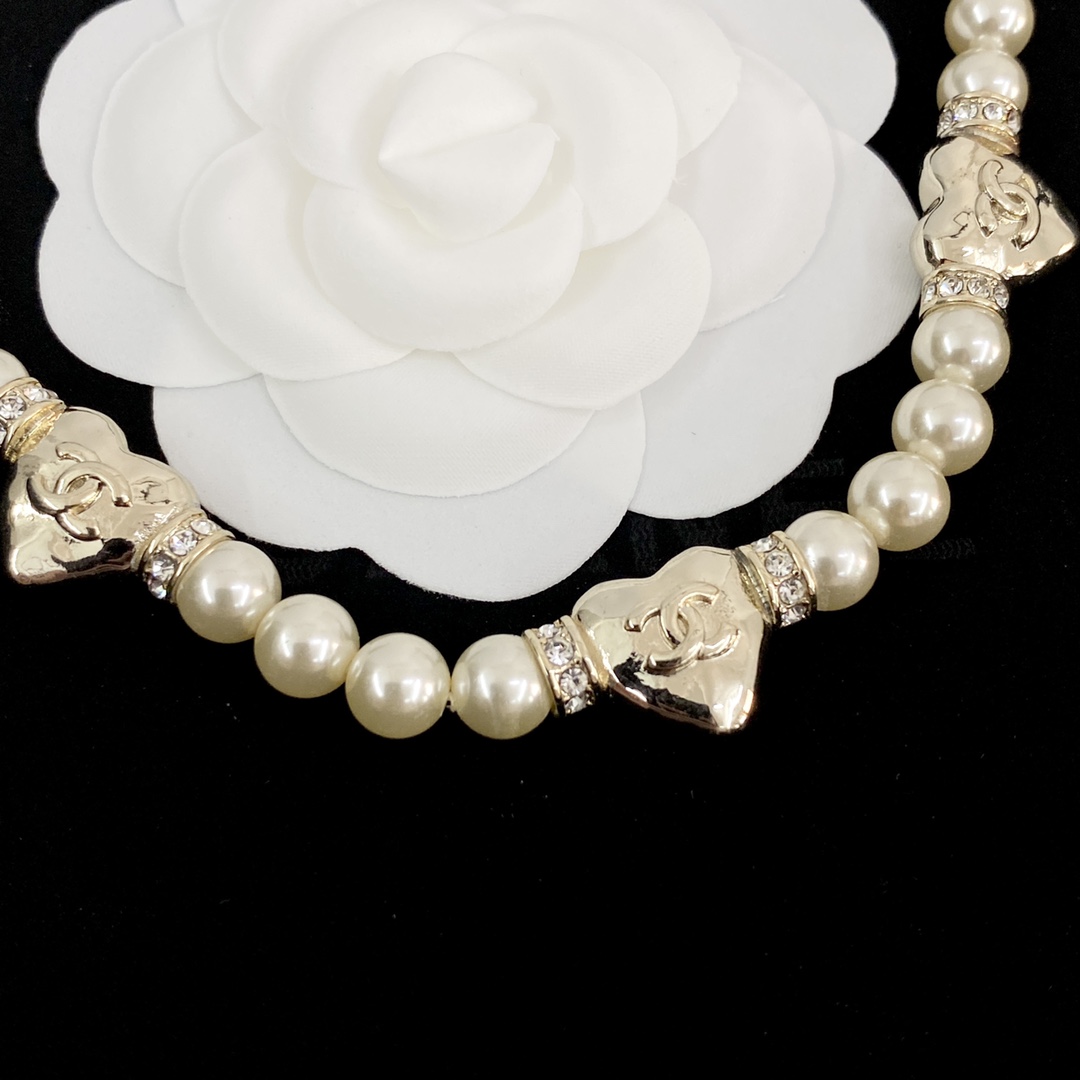 Chanel Pearl Heart Choker Necklace: Sweet and elegant pearl design with mini heart charm and sparkling accents, perfect for daily wear or special occasions.