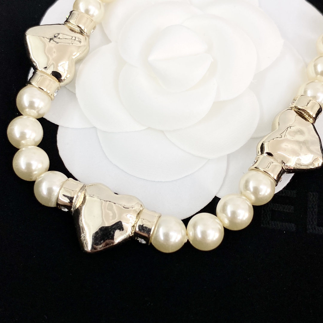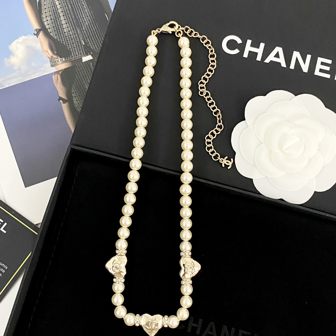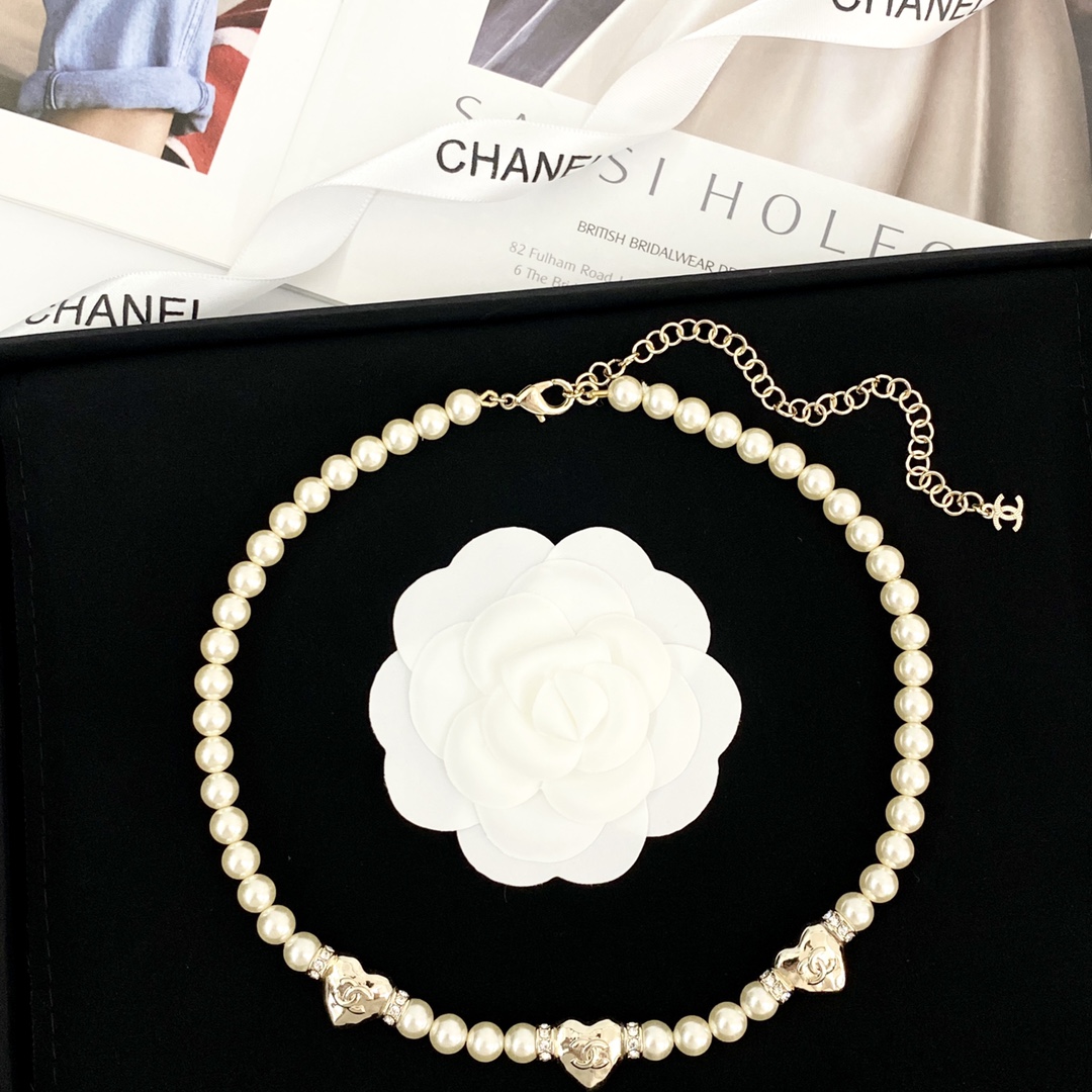 Chanel Pearl Heart Choker Necklace: Sweet and elegant pearl design with mini heart charm and sparkling accents, perfect for daily wear or special occasions.