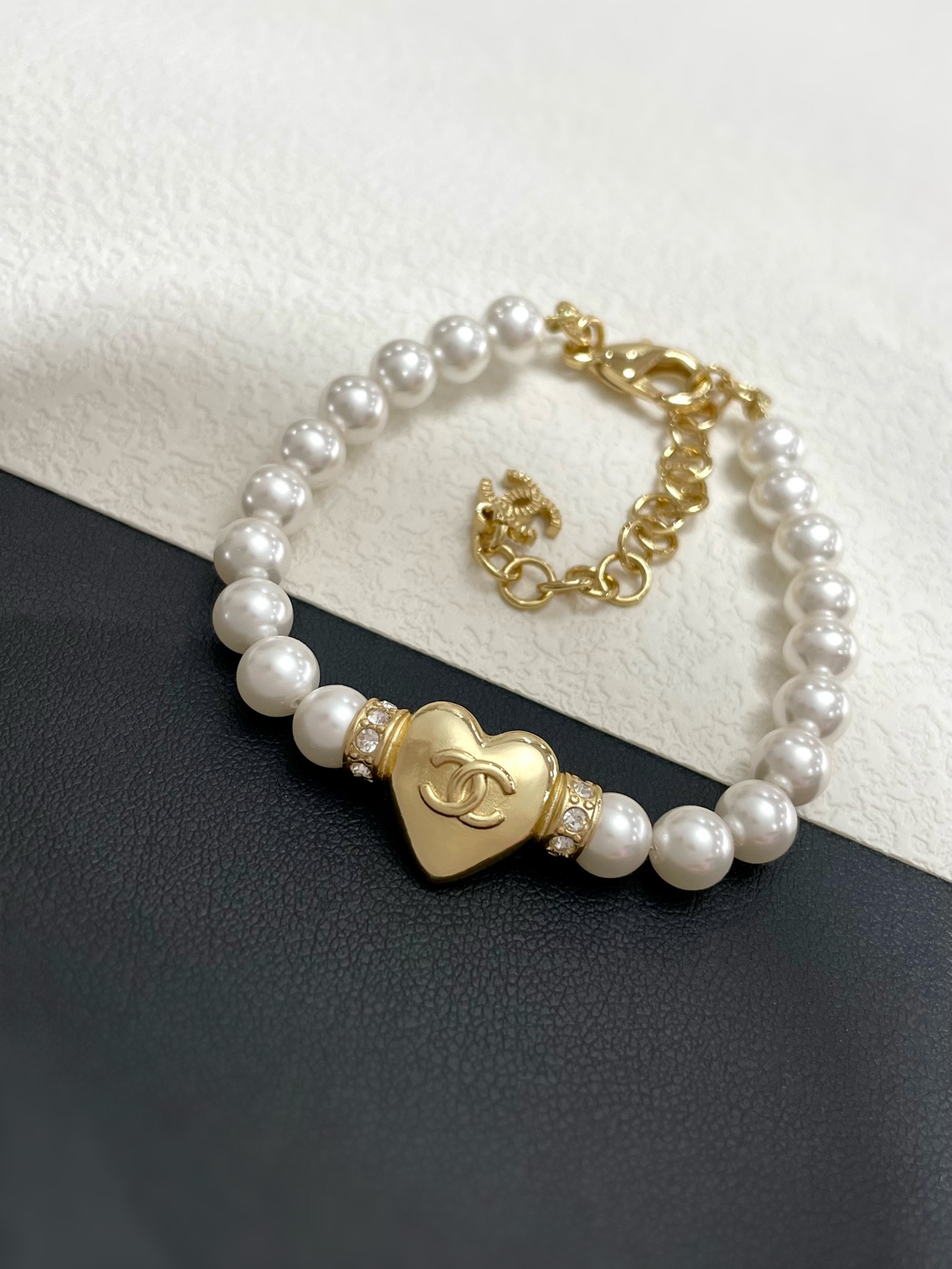 Chanel-style Gold Double C Heart Pearl Bracelet