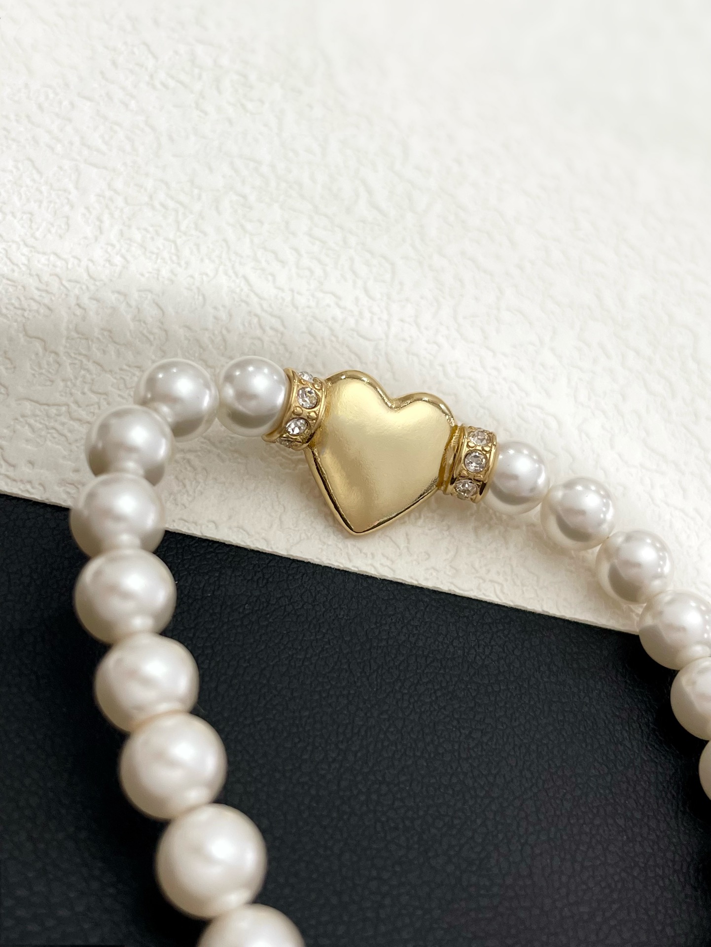 Chanel-style Gold Double C Heart Pearl Bracelet Three-dimensional vintage metal heart with pearls and crystals Gentle, exquisite, and youth-enhancing Hand-set sparkling crystals Adjustable length
