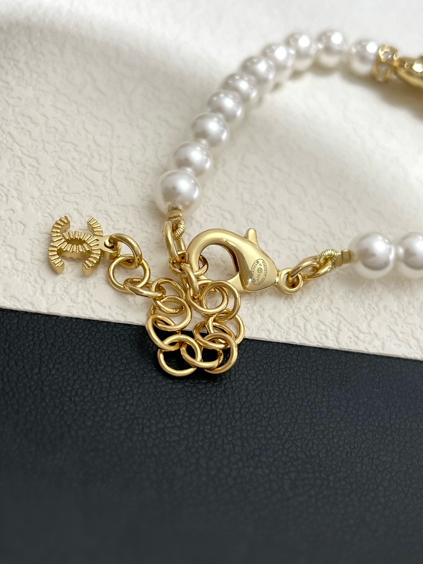 Chanel-style gold double C heart pearl bracelet with crystal, adjustable length.