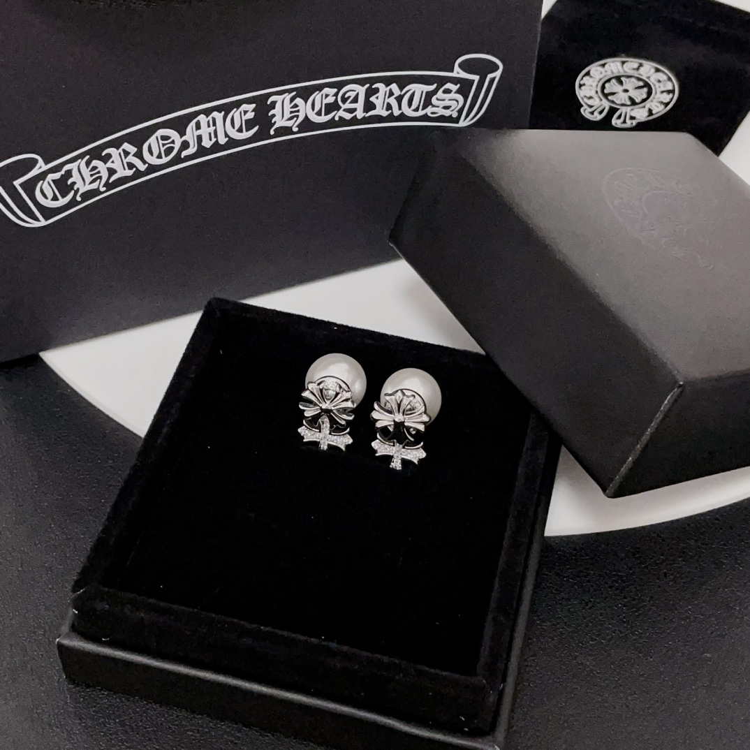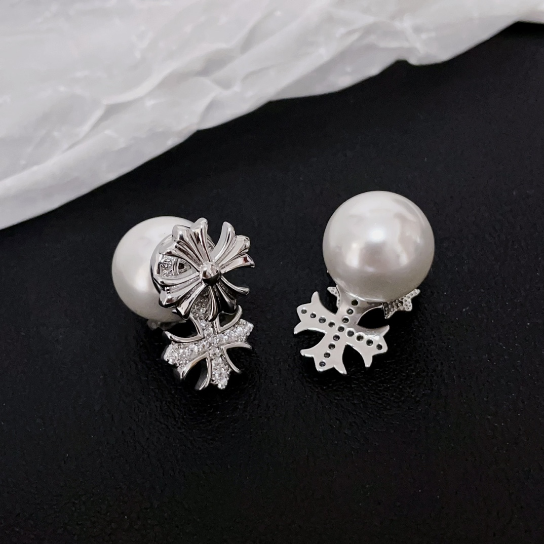 Chrome Hearts Cross Pearl Two-Way Earrings: A cool rock style with elegant classical beauty. The gentleness of pearls combines with the edginess of Chrome Hearts, seamlessly matching suits, dresses, and even street style—effortlessly pulling off various looks.
