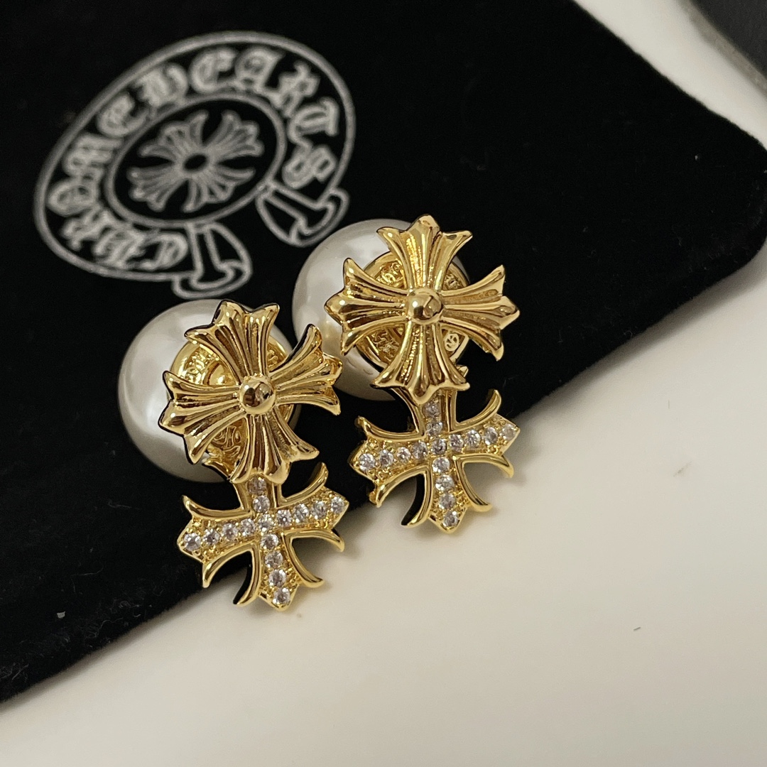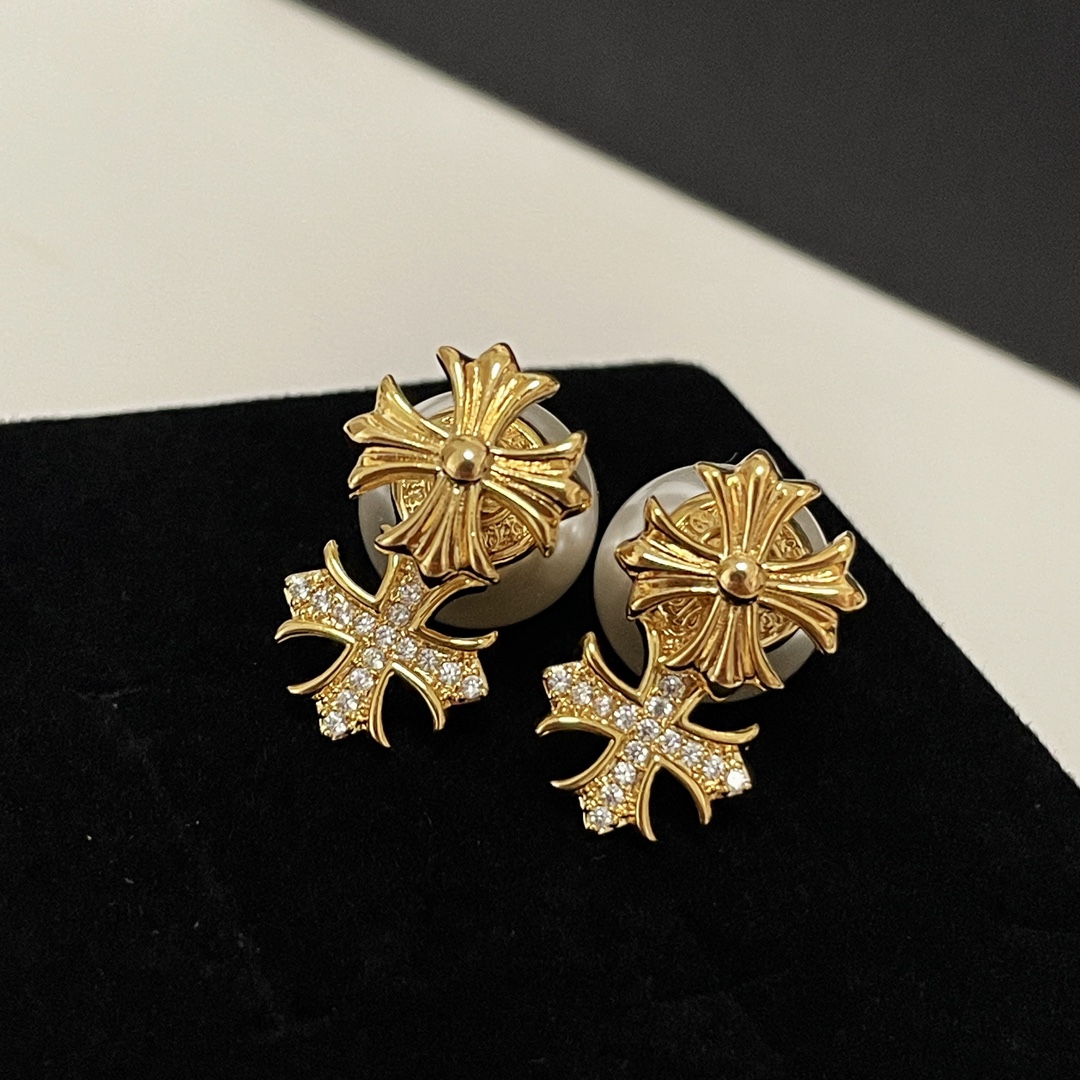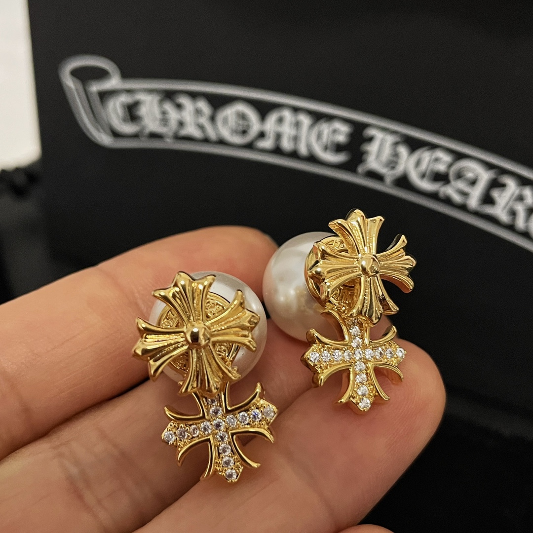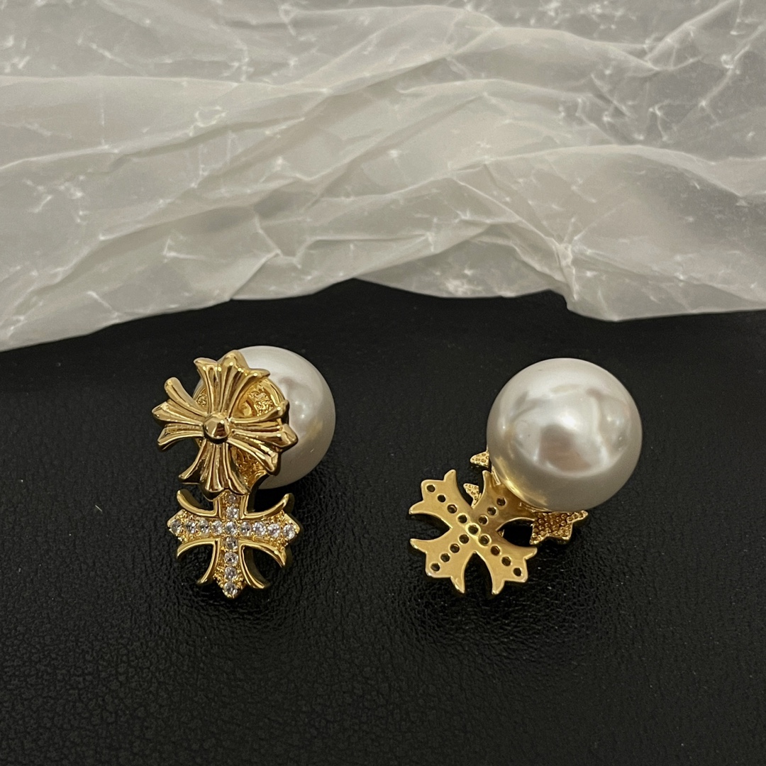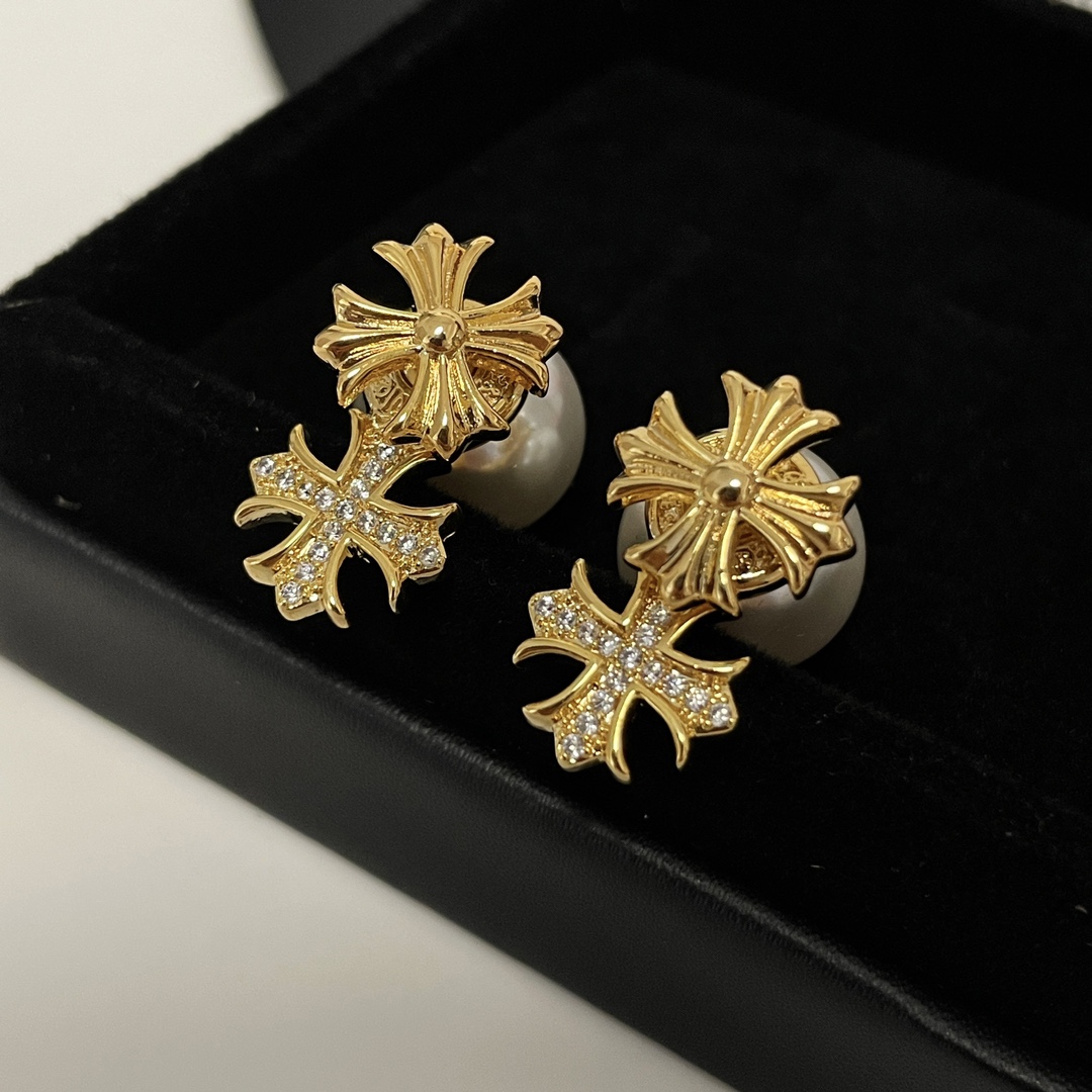Chrome Hearts alloy gold diamond cross pearl earrings, versatile for various styles.