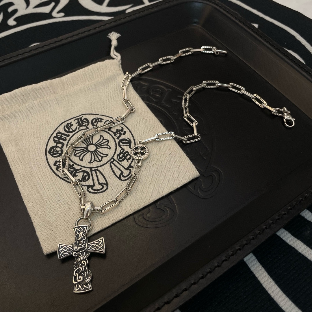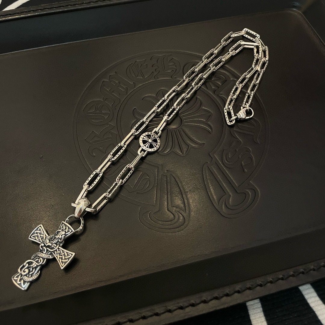New [Counter Quality] Chrome Hearts Chrome Hearts Classic Buckle Necklace, Dragon Cross Pendant, Concave and Convex Modeling with Different Pattern Design Styles Presenting a Unique Cross, the Scout Flower is the Symbol of Chrome Hearts, So It Lasts Longer. Genuine Version Chrome Hearts Chrome Hearts, Different from Ordinary Light Versions on the Market, Aligned with Standard Quality, Look at the Character Imprint Details, Retro Aged Gray Oxidation Degree. Exquisite Craft Version!!! Pure Handmade ~ Genuine Mold Opening, Must-Have for Fashion Trends, Suitable for Both Men and Women, Couple's Same Style, Official Website Original Version, Rock Punk Thai Silver Style, Retro Elements, Trendy and Versatile!