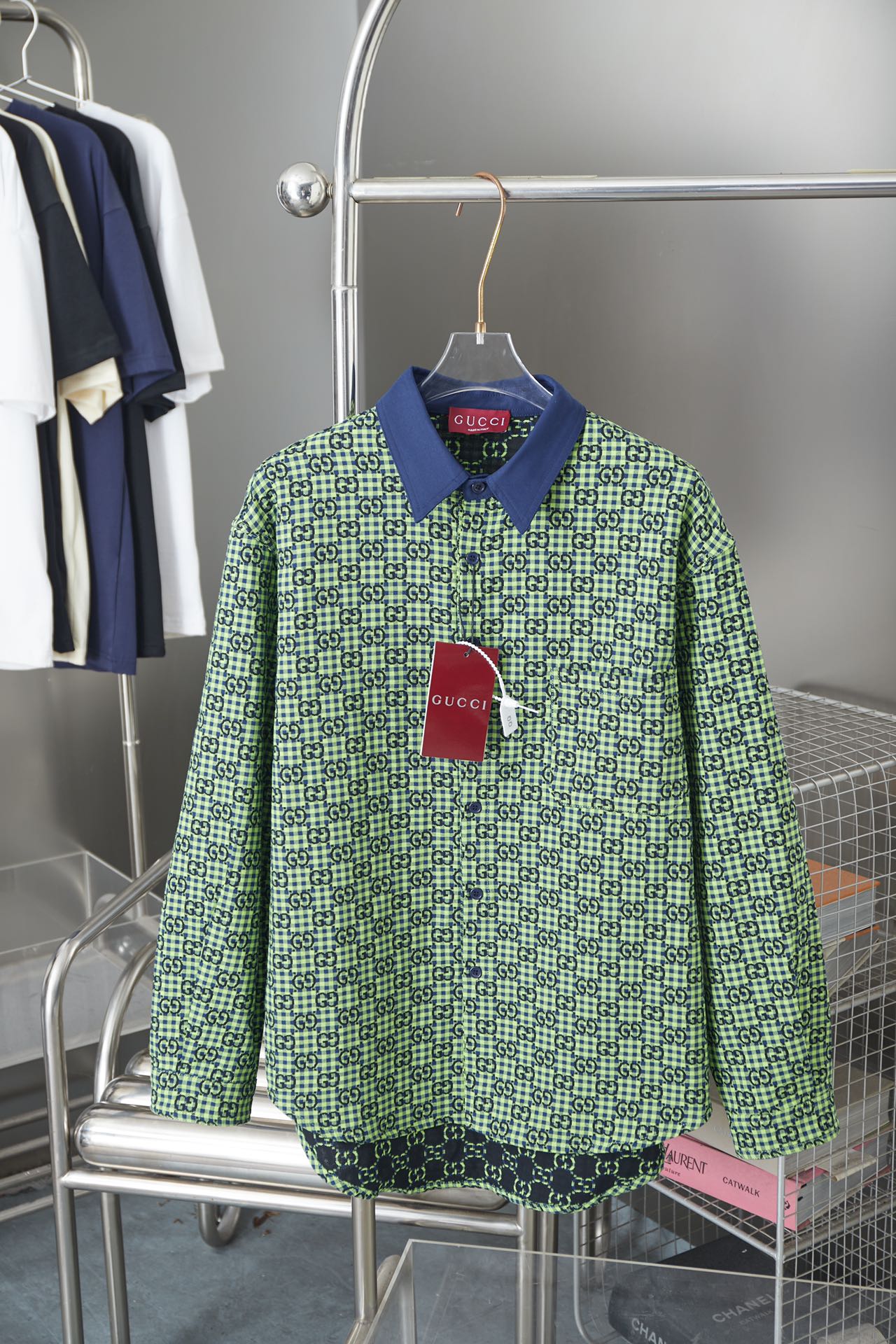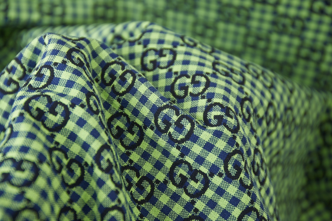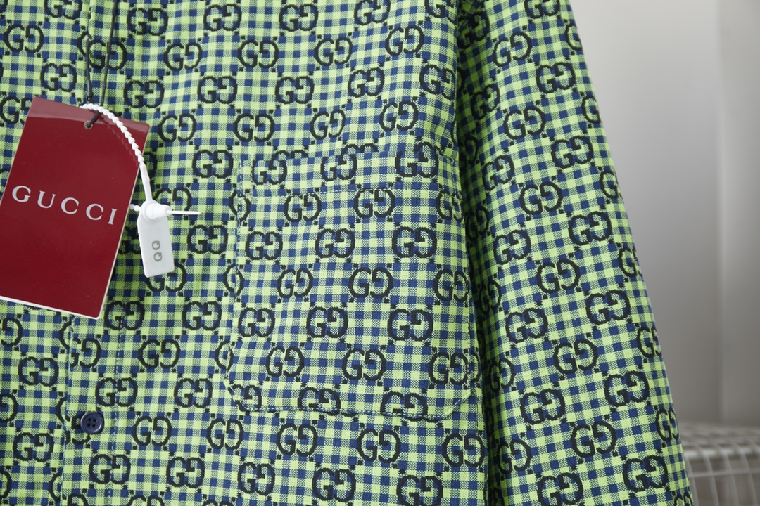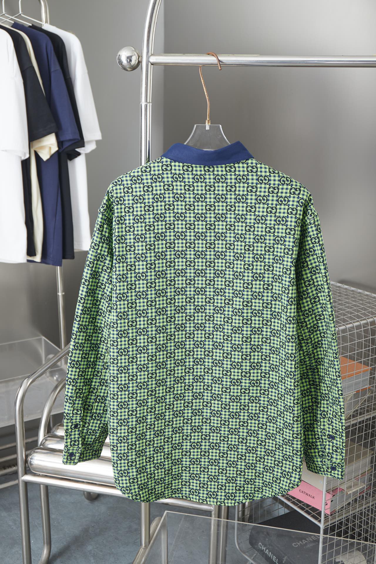 GU Ancient Family GC 24SS Small G Jacquette Linen Long Sleeve Shirt. Features high-end wool-linen blend, laser-cut patterns, chest pocket, color contrast design. Colors: Green/Blue. Sizes: XS/S/M/L.