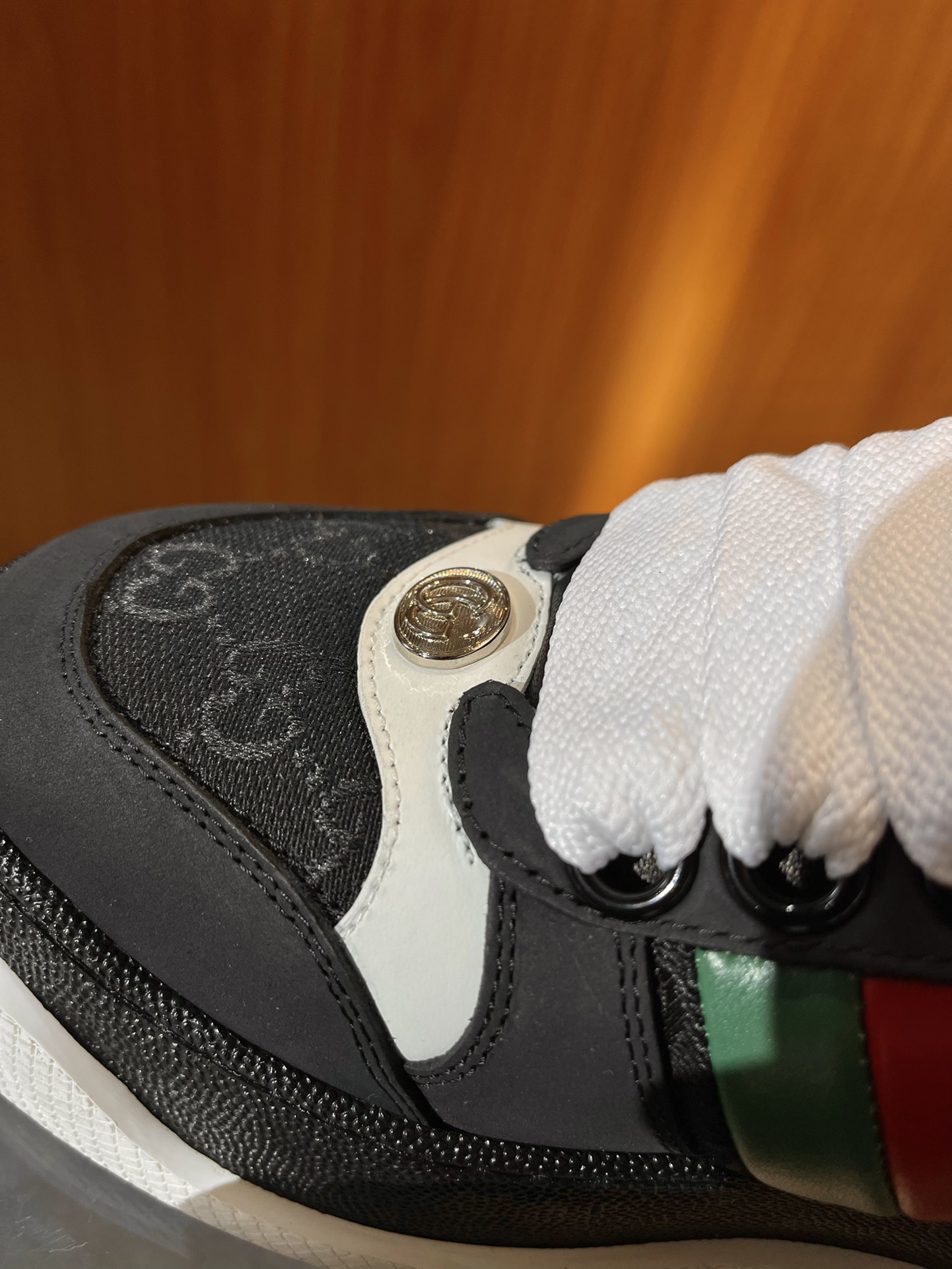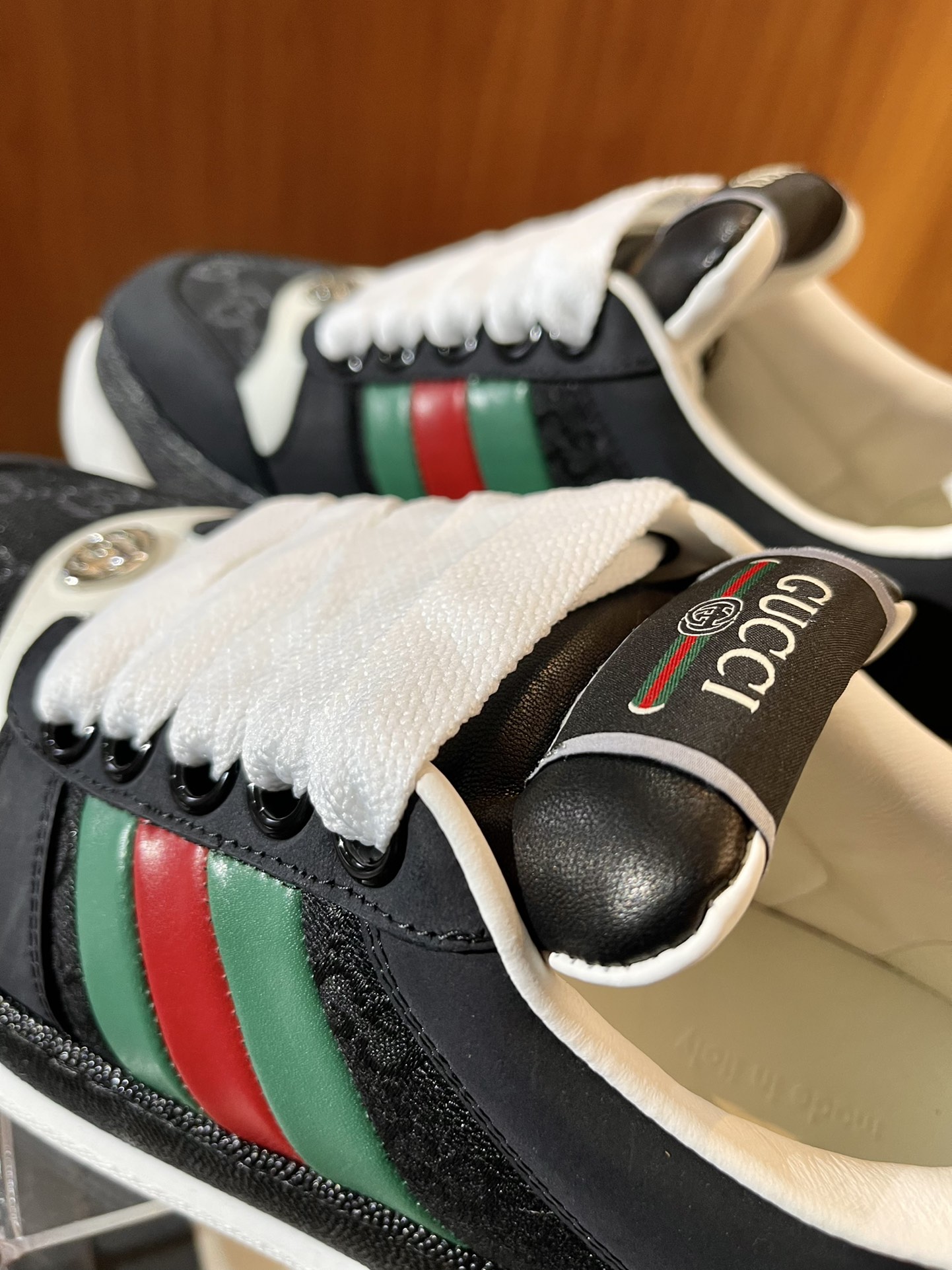 The GG logo has always been an important design element in various Guc series. On this Screener series black Original GG canvas men's sports shoes, the classic GG pattern is strikingly embellished on the shoe body.