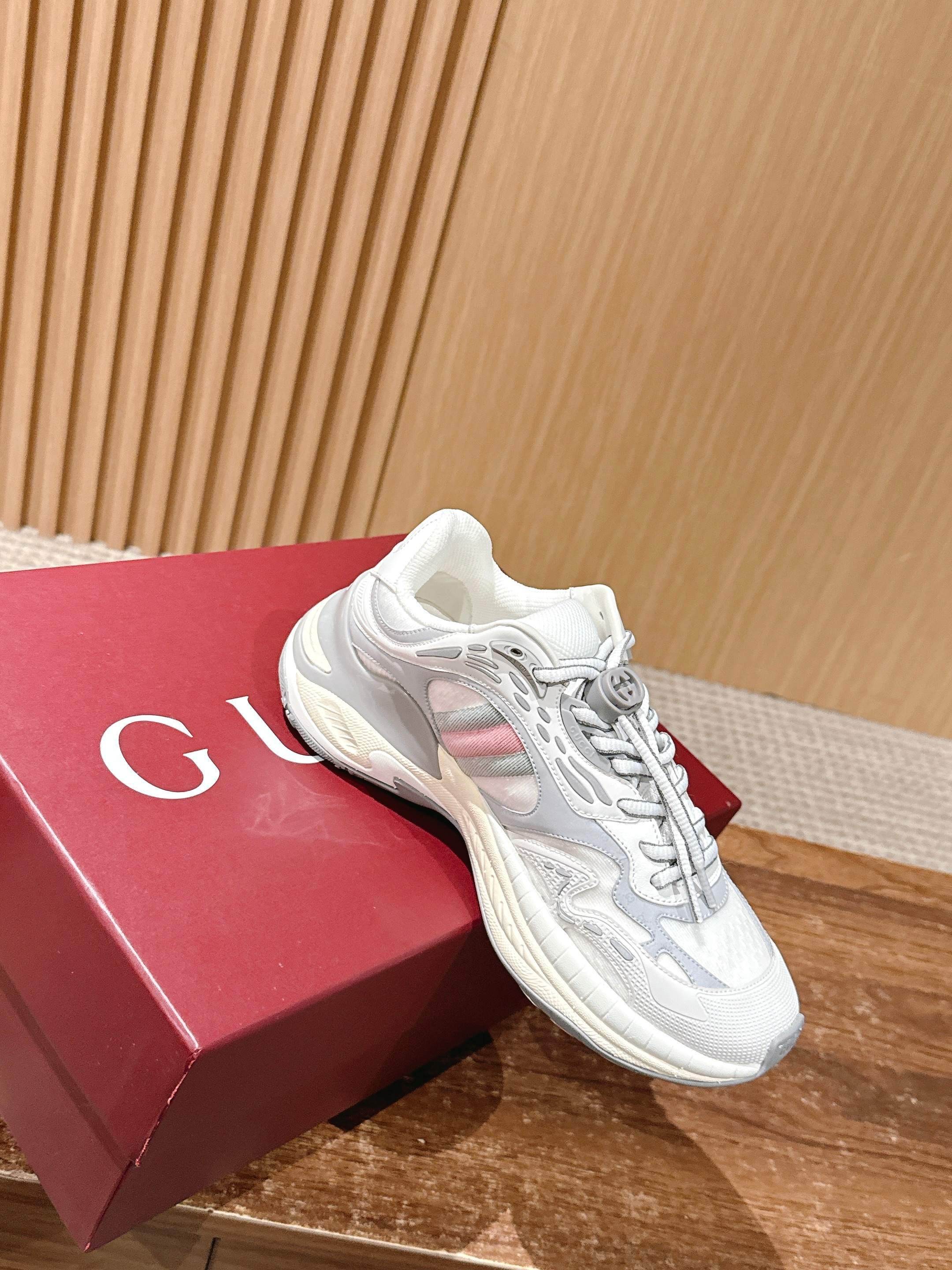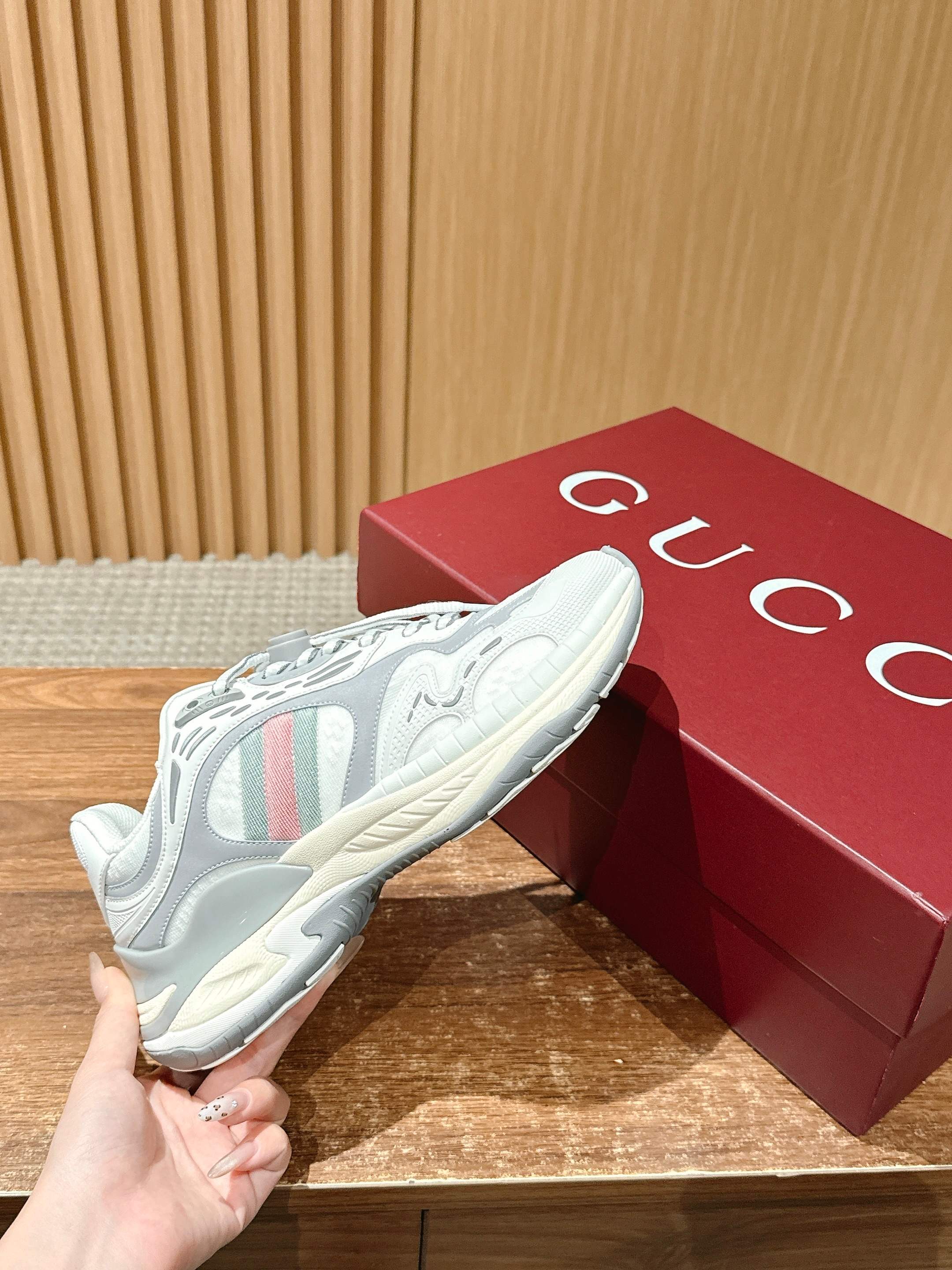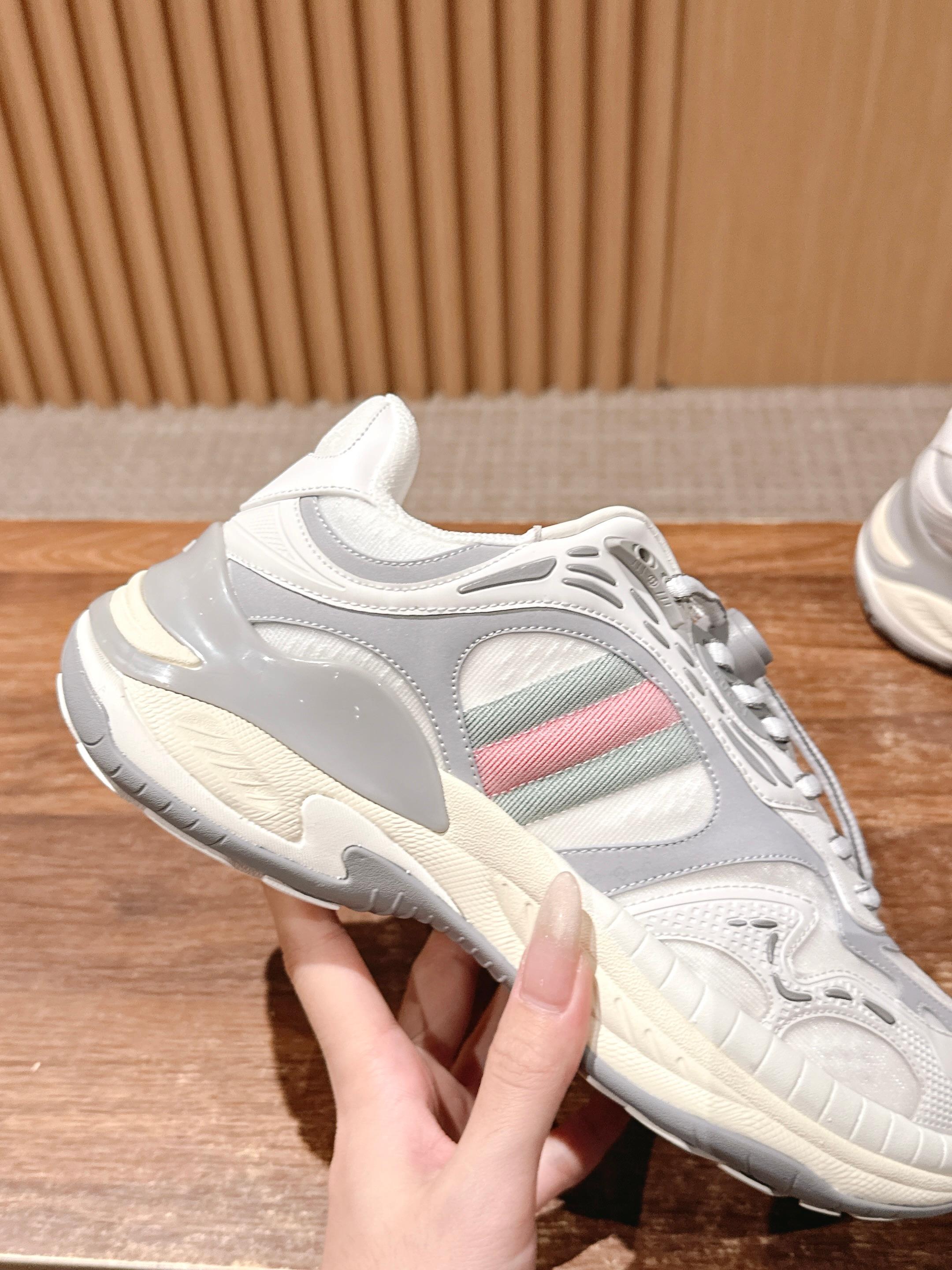 [Top Version] Gucci 2.0# Gucci new unisex casual sneakers newly interpret the brand's iconic striped woven tape element. These sneakers refresh and reinterpret iconic details, using a thick EVA sole paired with a dynamic silhouette to provide a stable and comfortable wearing experience. Leather lining. GG reflective piping. Padded woven tape. Decorated with GG. EVA rubber sole. Lace-up fastening, equipped with interlocking double G laces. Thick sole approximately 5 cm.