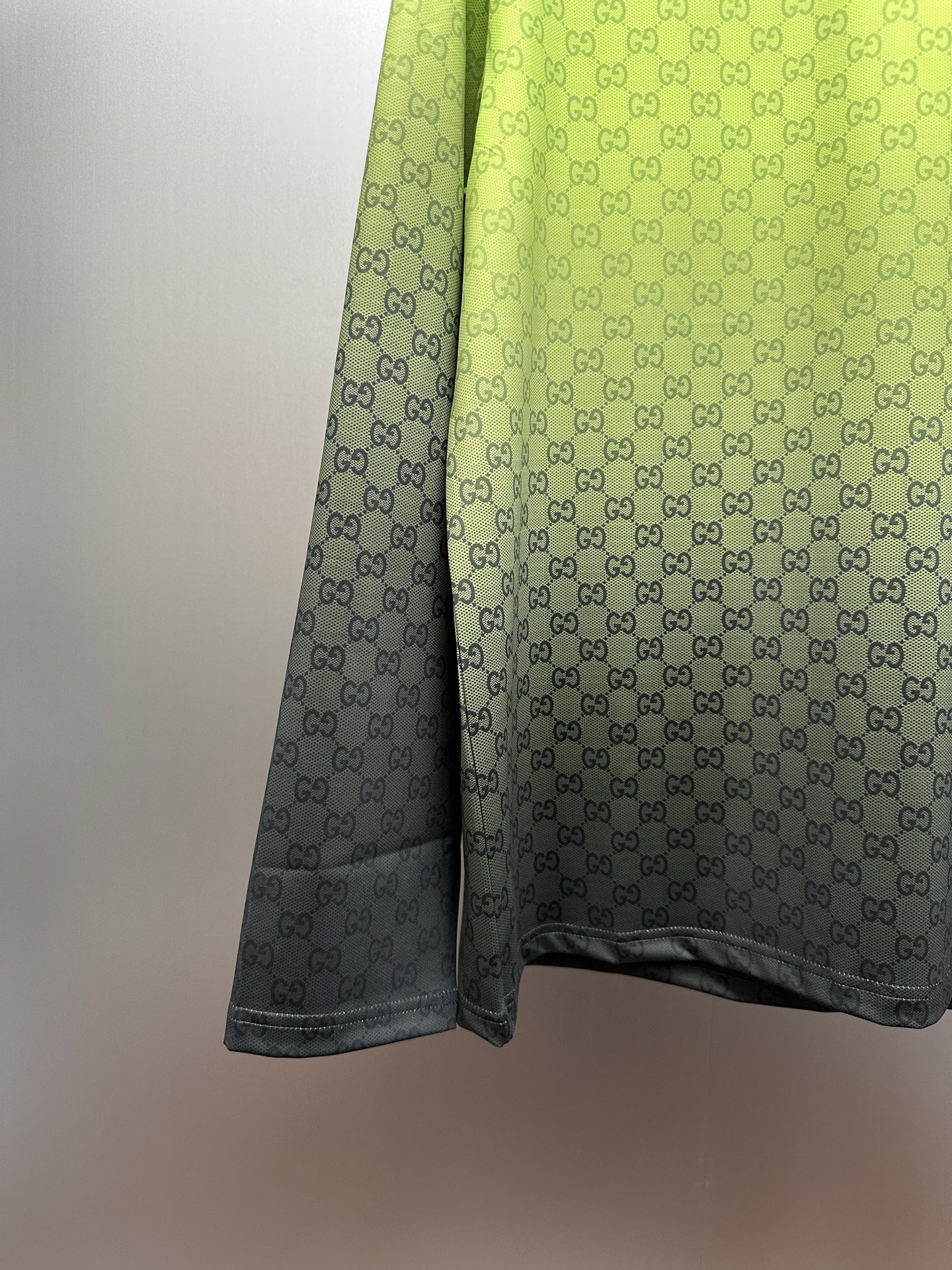 The brand presents a variety of gradient color schemes, aiming to highlight the texture of the fabric and the highly recognizable GG pattern. This T-shirt is made from lemon green to black gradient jersey cotton, adorned with an all-over gradient GG print, releasing a unique charm.
