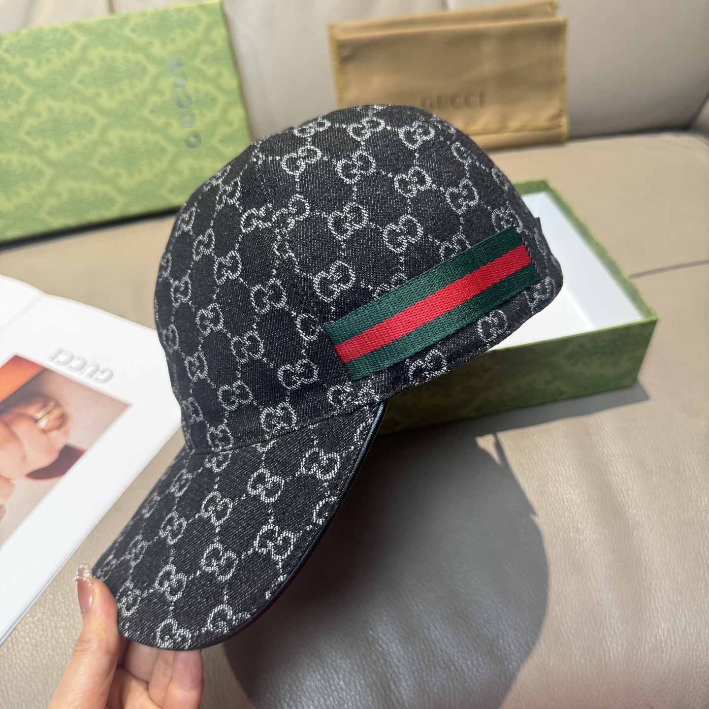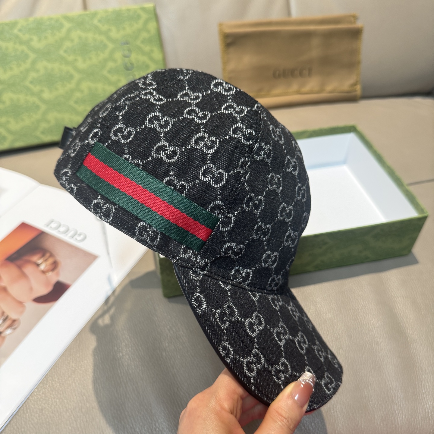 Gucci classic baseball cap with double G denim jacquard, retro design, 1:1 custom. Original denim and top grain leather, lightweight and breathable. Adjustable patch, unisex.