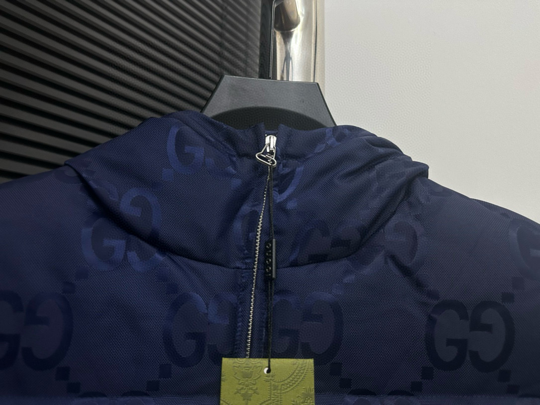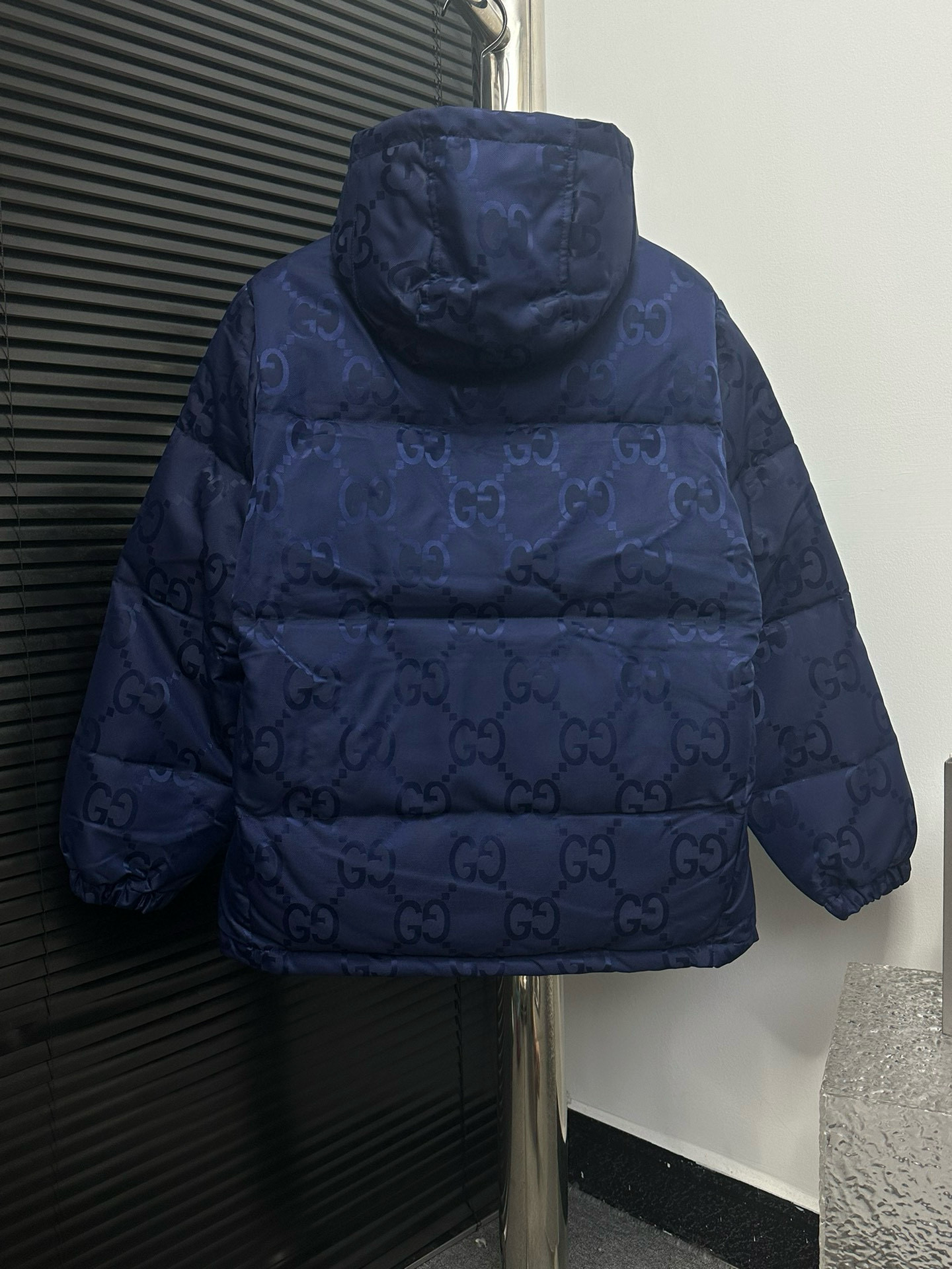 GUCCI Embroidered Hooded Down Jacket. Custom nylon fabric, 90% white duck down. Unisex sizes 42-50.