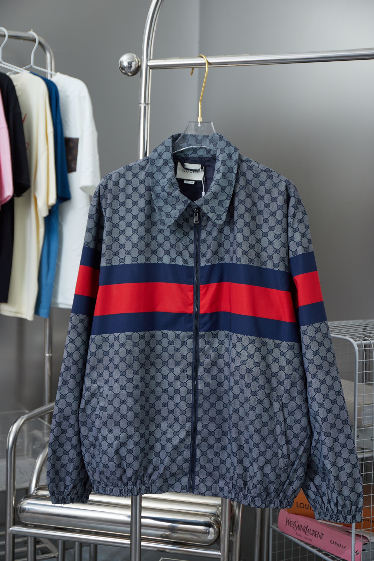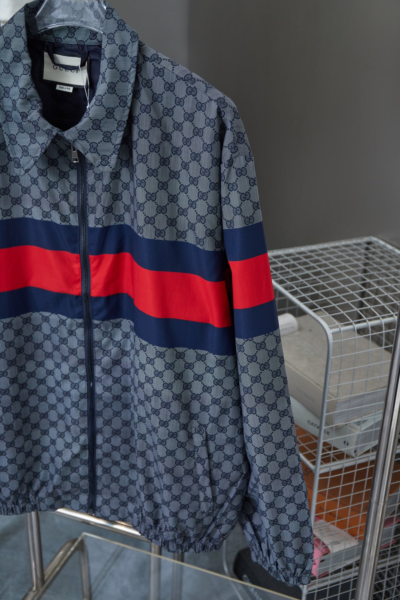 GUCCI GC Patterned Jacket. Nylon material, digital printing, T400 lining. Custom logo zipper, hand-stitched label. Colors: White/Dark Gray. Sizes: XS/S/M/L.