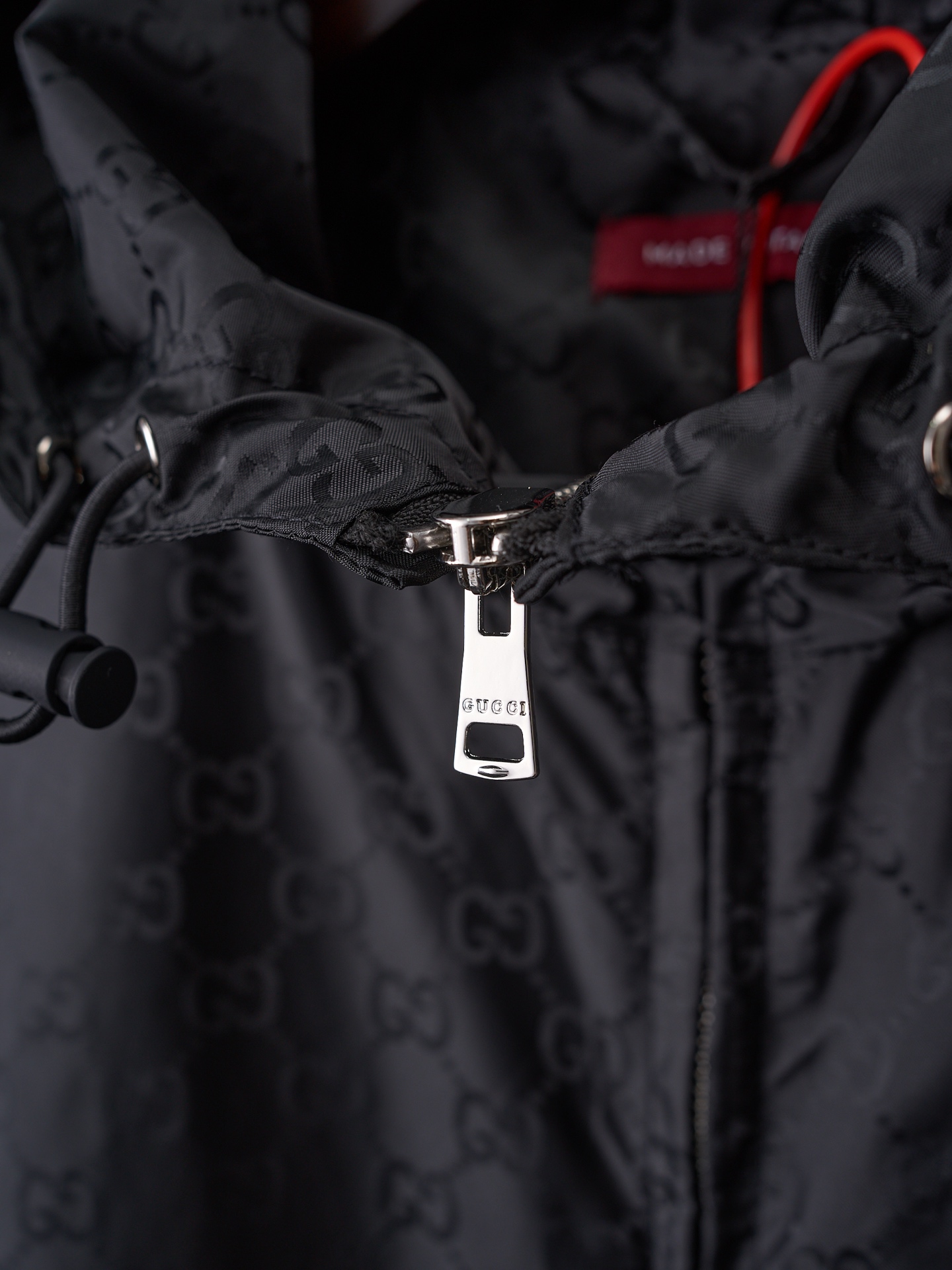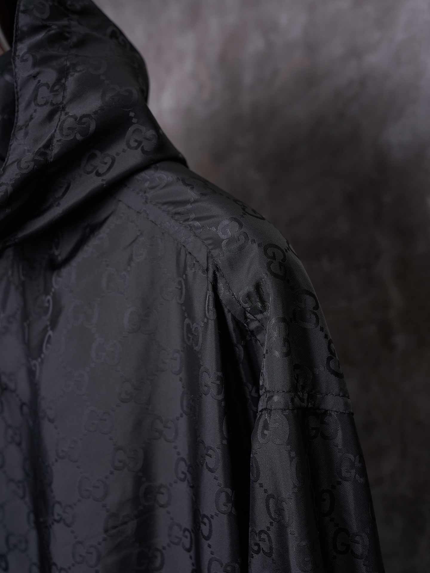 Custom high-density woven mercerized nylon fabric, excellent texture, comfortable and skin-friendly. Custom shimmering mercerized jacquard technical cotton-blend fabric, excellent texture, comfortable and skin-friendly. Primarily based on obsidian black, resembling star tracks under the night sky, encountering GG patterns covering the garment. Originating from the brand's profound cultural heritage, subtly emerging in a faintly visible manner. The hood flutters gently, adding a sense of agility and elegance to the overall silhouette. With its unique design for flexible switching between clothing and bag, it becomes a model of perfect integration of fashion and function.