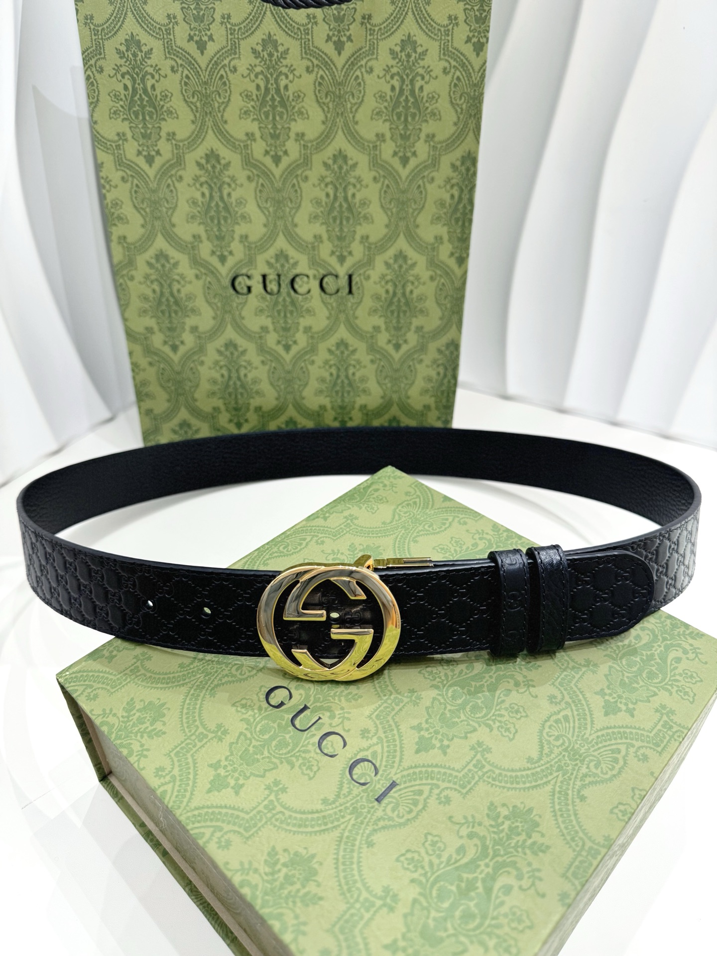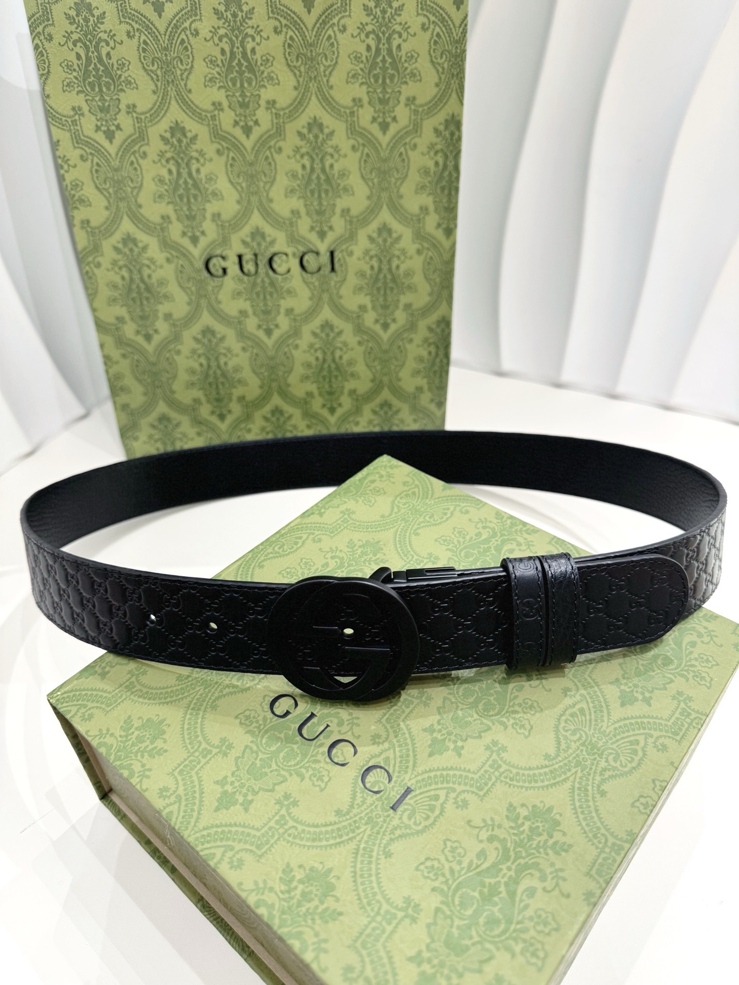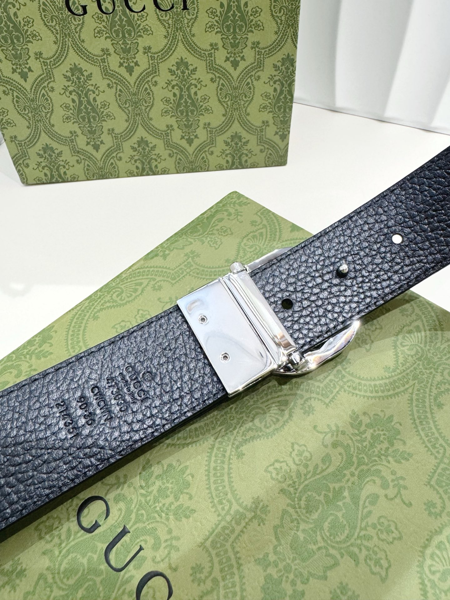 Gucci Men's Reversible Belt One side features hot-stamped top-grain leather, the reverse side is solid-color leather. Equipped with an interlocking G buckle. Width: 3.8cm Size: 90–110
