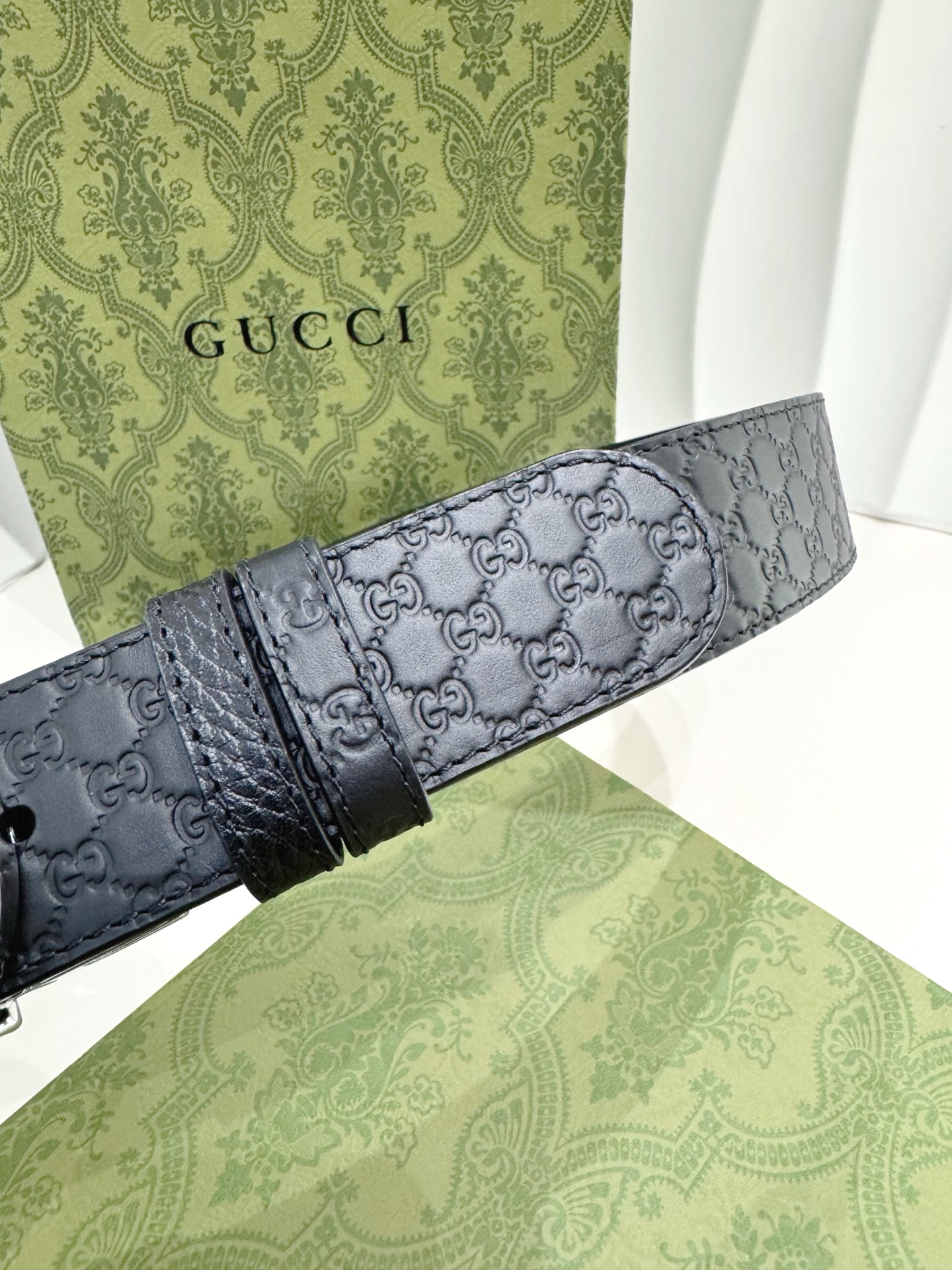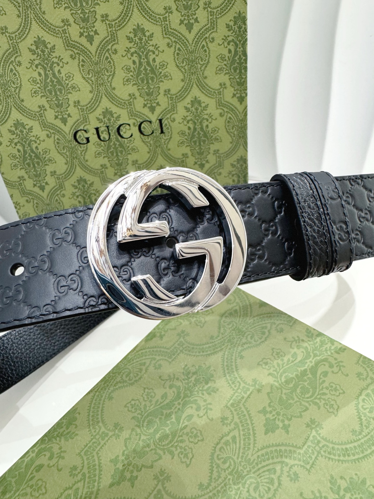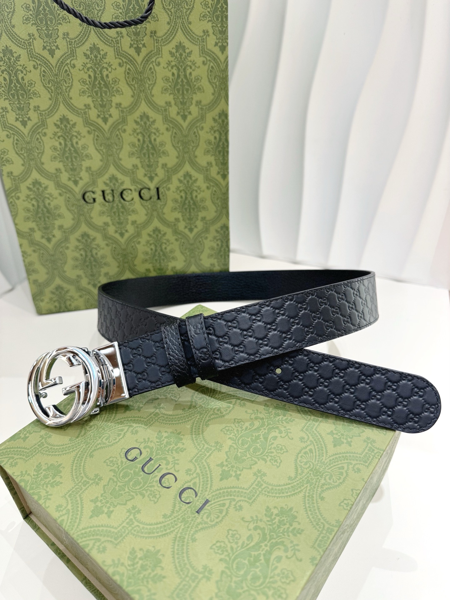 Gucci Men's Reversible Belt One side features hot-stamped top-grain leather, the reverse side is solid-color leather. Equipped with an interlocking G buckle. Width: 3.8cm Size: 90–110