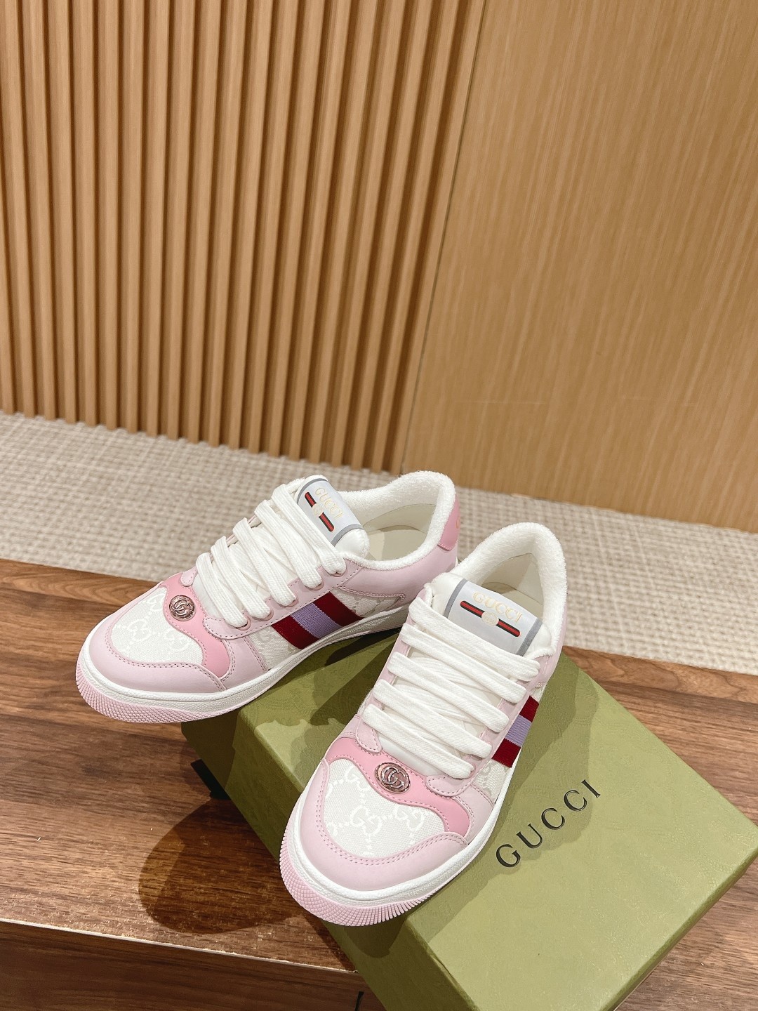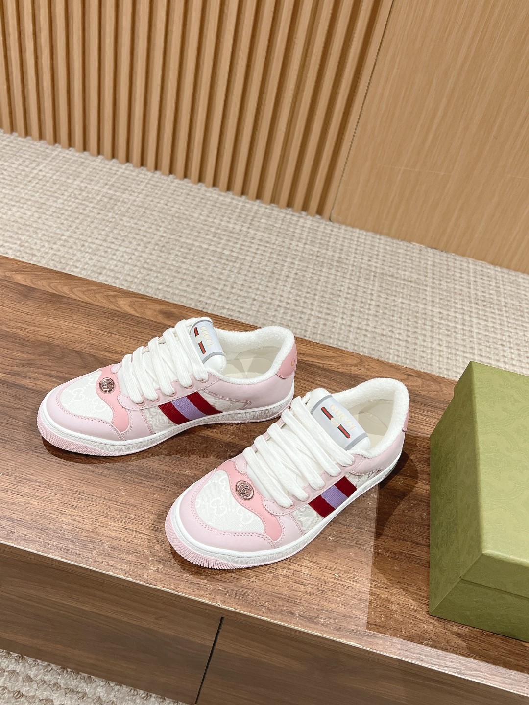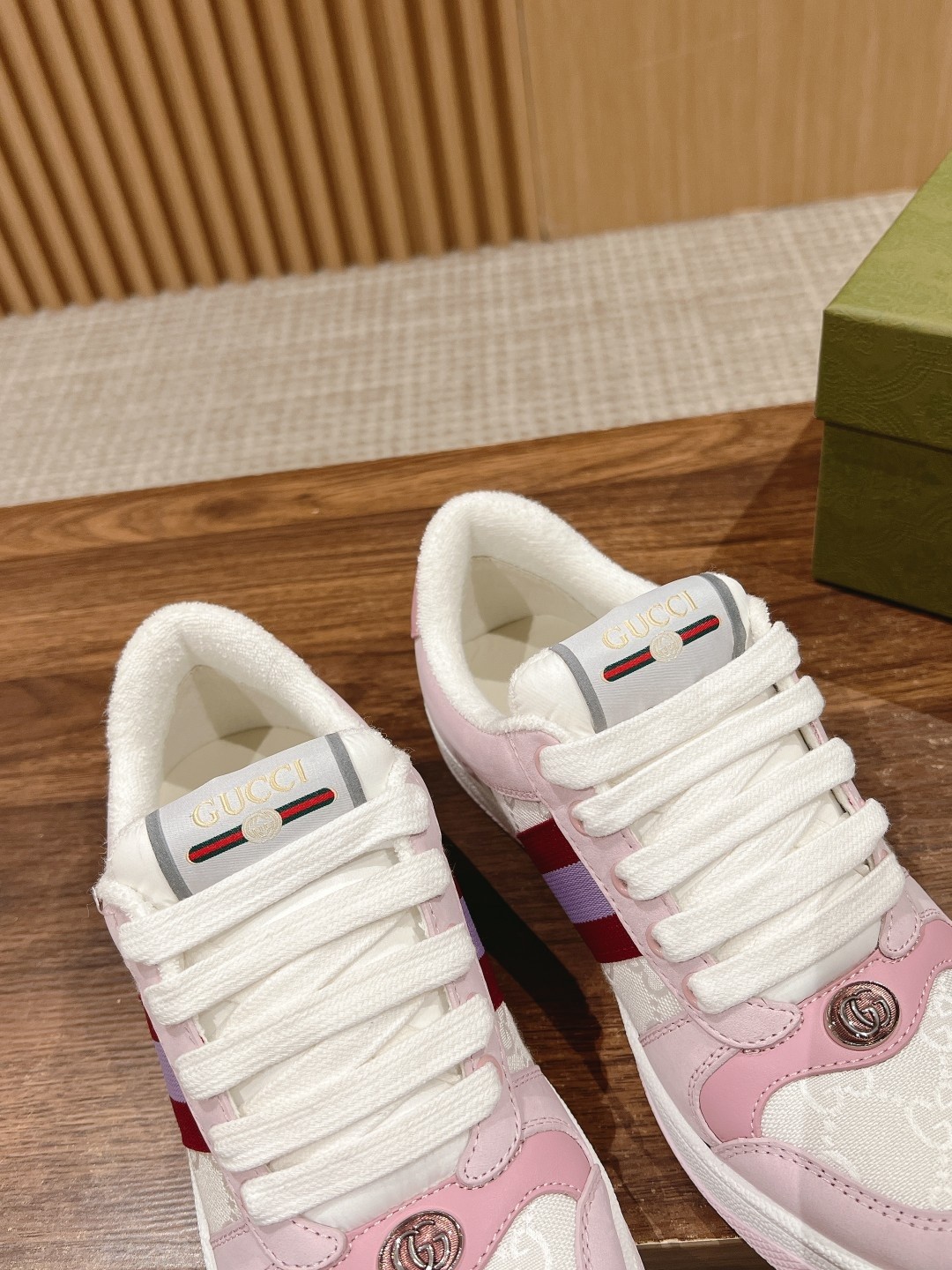 [Top Version] #Women's Only# Gucci Screener Gucci Series Dirty Sneakers. All upgraded with genuine product air-sole technology. The leather and outsole are distressed and formed in one go, unlike market versions that are distressed later, resulting in a very cheap-looking color. The inner lining is a custom cotton-polyester blended terry lining consistent with the genuine product, matching in thickness, breathability, and feel. Genuine product molded cowhide footbed, stamped and formed, not the hand-cut materials of ordinary market versions. Metal double G oval enamel hardware molded from the original. The latest outsole has adjusted details compared to previous versions; we have also upgraded it. The exclusive private mold and TPR outsole, identical to the genuine product, perfectly restore the original craftsmanship in terms of softness/hardness, line definition and clarity of the pattern, and wearing comfort. The generic rubber soles on the market not only have incorrect color, pattern, and sole bee design but also completely lack texture. Sole thickness is approximately 2.5cm. Full set of packaging consistent with the genuine product. Size: 3540