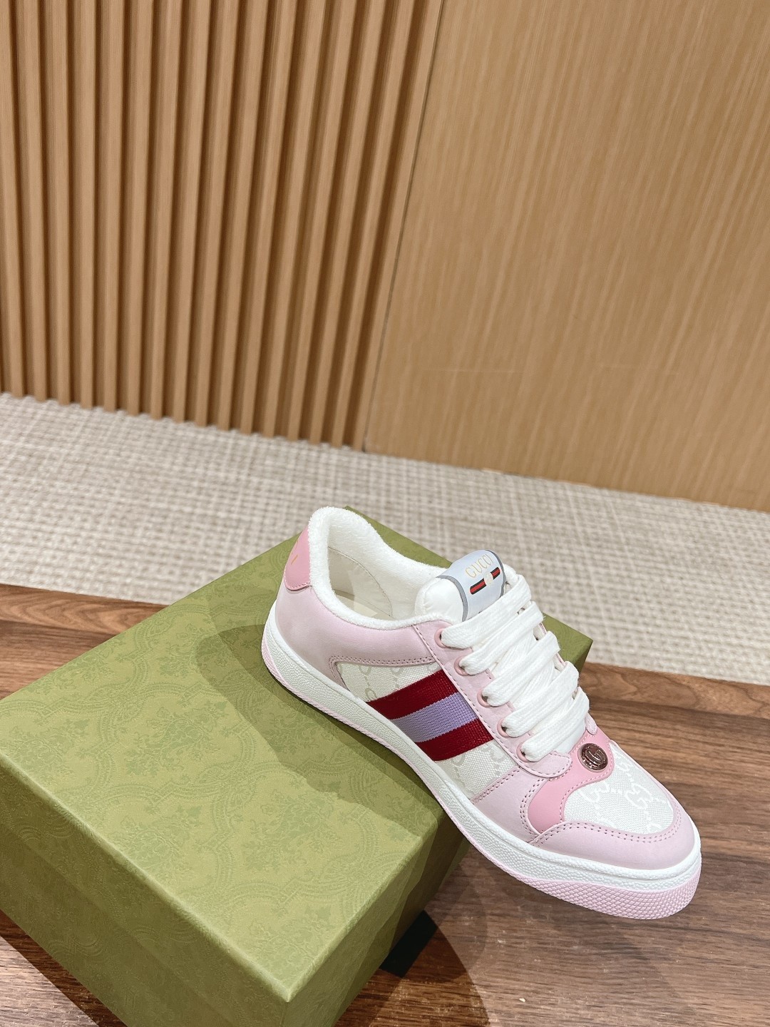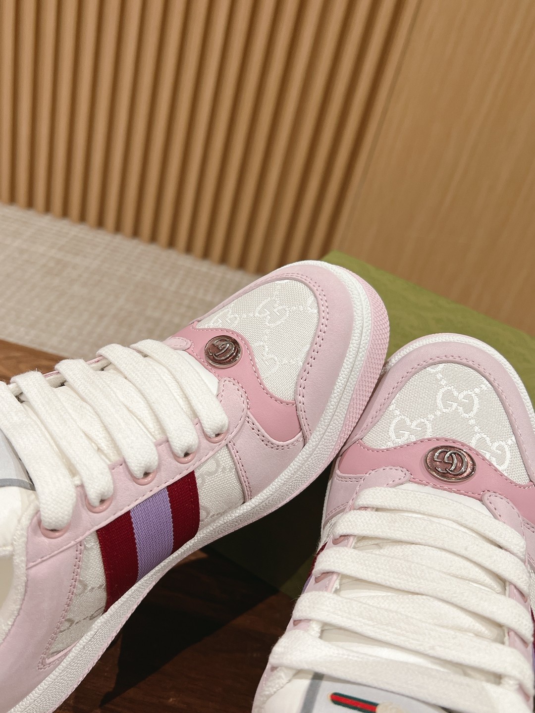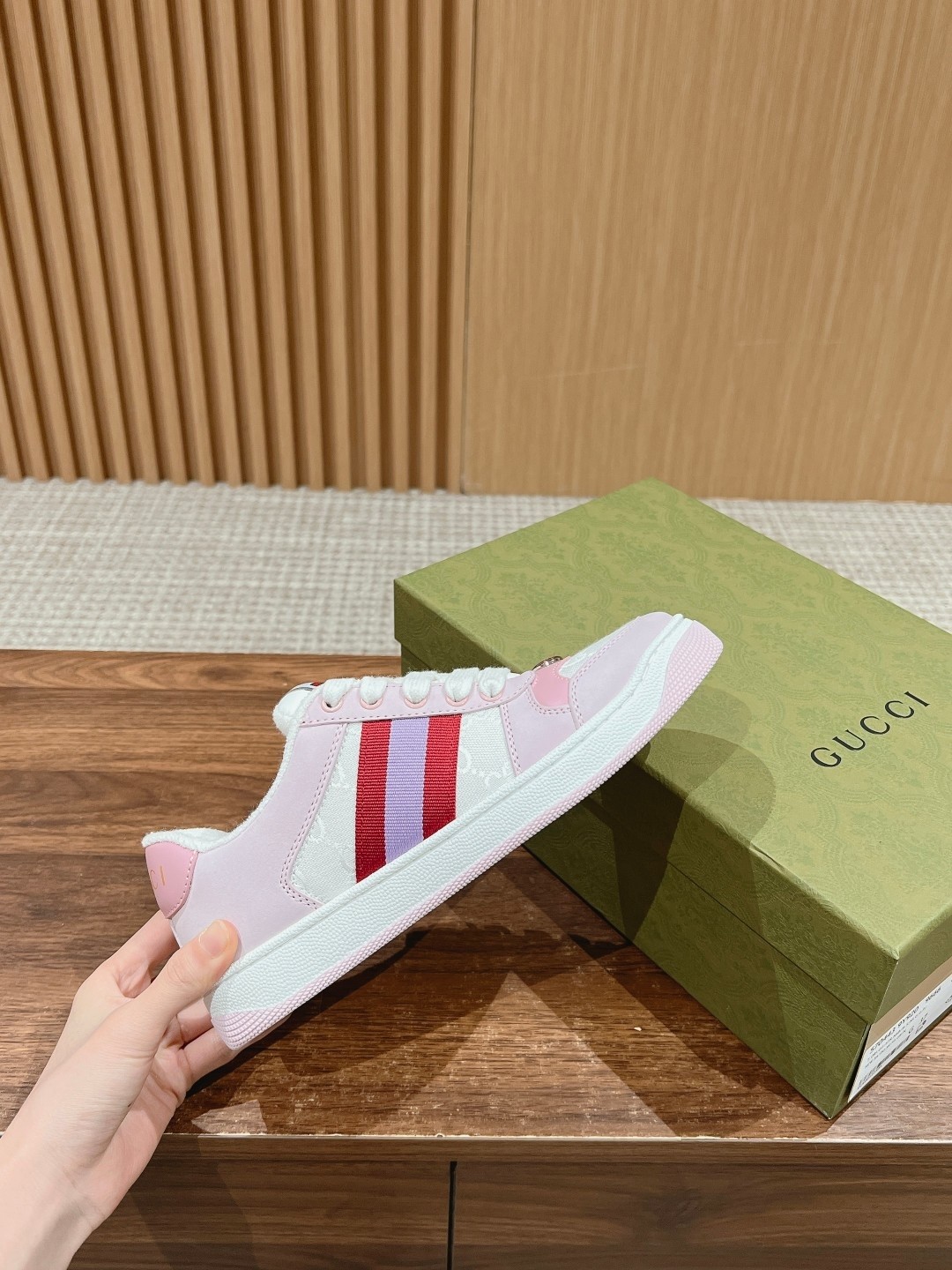 [Top Version] #Women's Only# Gucci Screener Gucci Series Dirty Sneakers. All upgraded with genuine product air-sole technology. The leather and outsole are distressed and formed in one go, unlike market versions that are distressed later, resulting in a very cheap-looking color. The inner lining is a custom cotton-polyester blended terry lining consistent with the genuine product, matching in thickness, breathability, and feel. Genuine product molded cowhide footbed, stamped and formed, not the hand-cut materials of ordinary market versions. Metal double G oval enamel hardware molded from the original. The latest outsole has adjusted details compared to previous versions; we have also upgraded it. The exclusive private mold and TPR outsole, identical to the genuine product, perfectly restore the original craftsmanship in terms of softness/hardness, line definition and clarity of the pattern, and wearing comfort. The generic rubber soles on the market not only have incorrect color, pattern, and sole bee design but also completely lack texture. Sole thickness is approximately 2.5cm. Full set of packaging consistent with the genuine product. Size: 3540