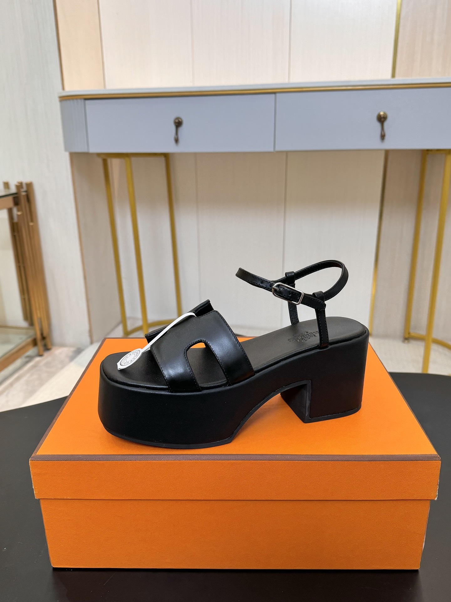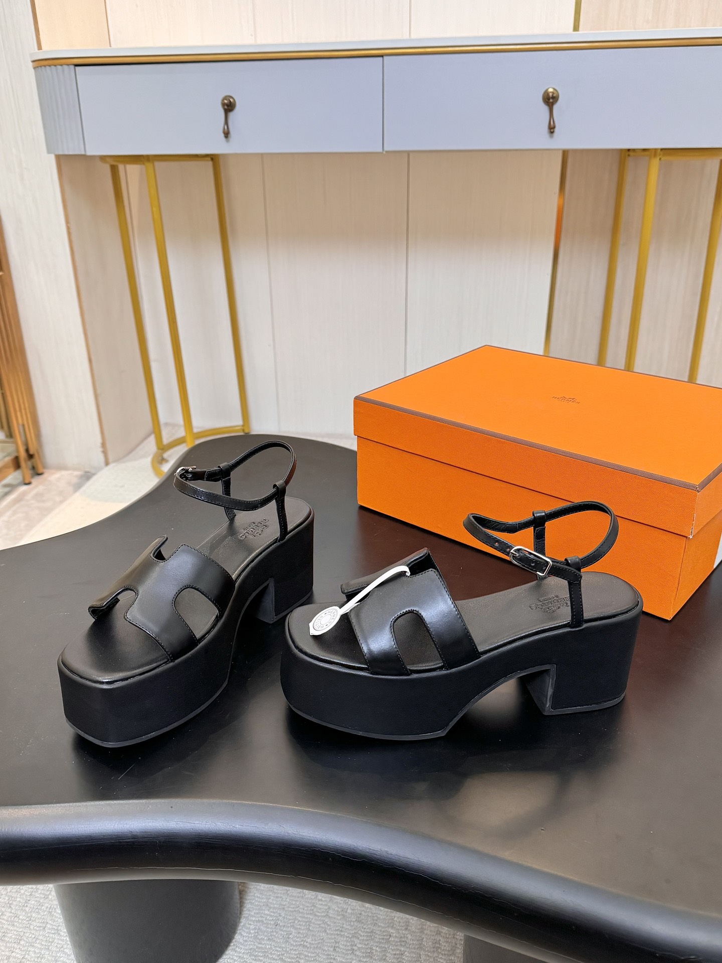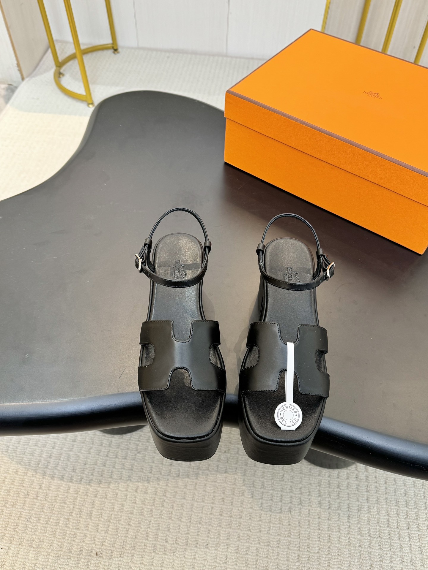 Hermes classic wedge sandals, black H design, comfortable and versatile. Sizes 35-40.