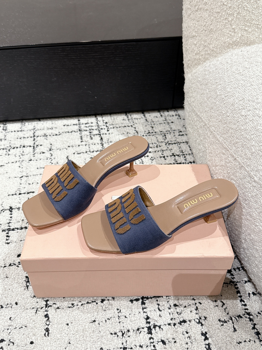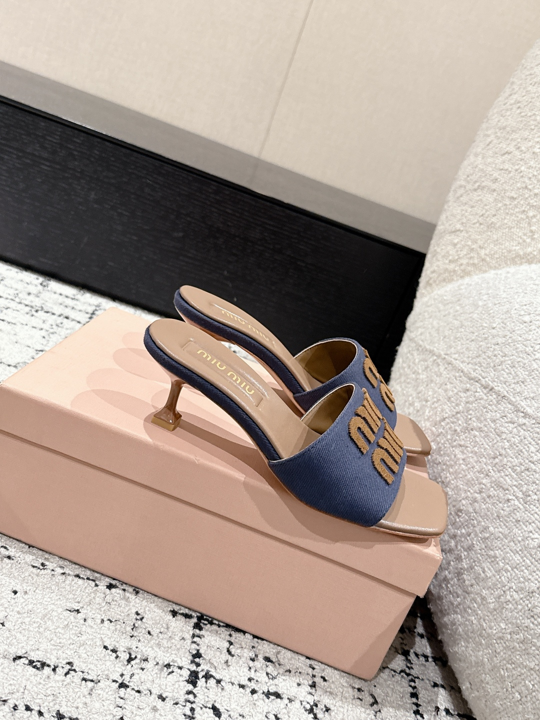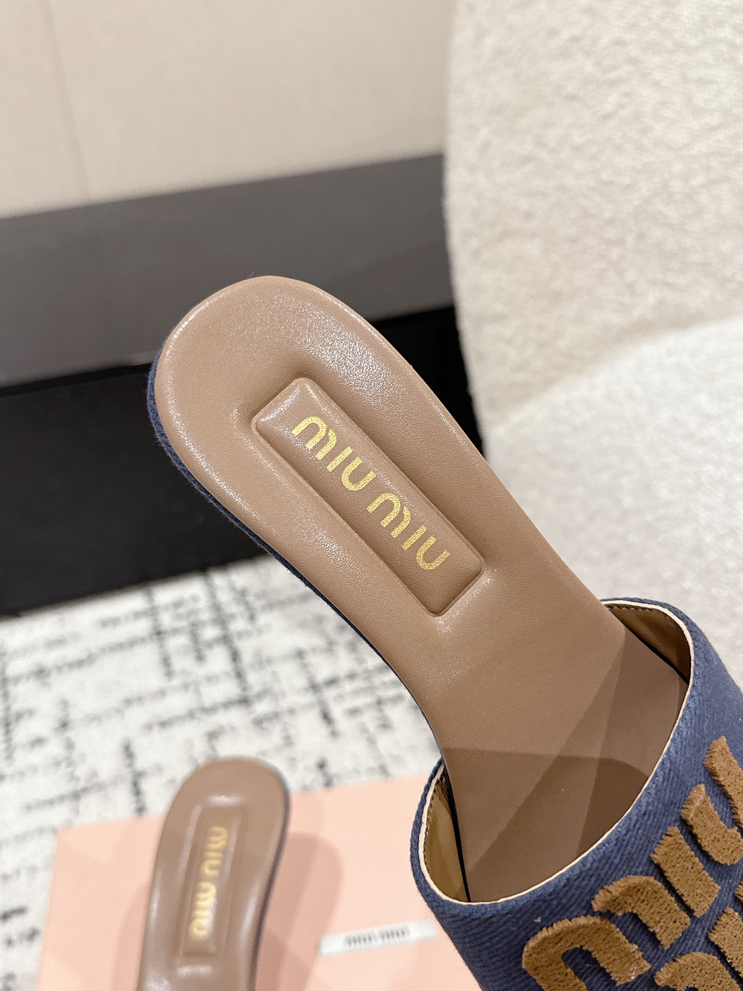 Miu Miu 25ss summer flat denim lambskin slippers. Handcrafted with cloud heel design, soft and comfortable. Upper: denim/lambskin, lining: lambskin, sole: Italian leather. Sizes 35-40.